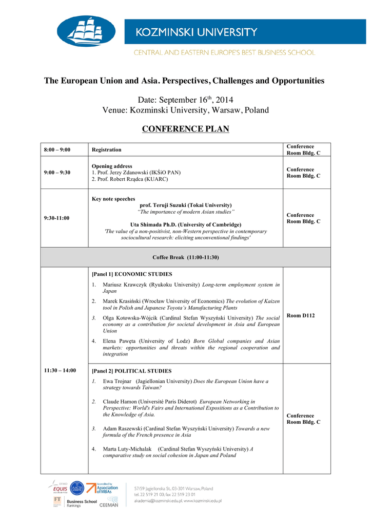 The European Union and Asia. Perspectives, Challenges and Opportunities Date: September 16th, 2014 Venue: Kozminski University, Warsaw, Poland CONFERENCE PLAN 8:00 – 9:00 Registration Conference Room Bldg. C 9:00 – 9:30 Opening address 1. Prof. Jerzy Zdanowski (IKŚiO PAN) 2. Prof. Robert Rządca (KUARC) Conference Room Bldg. C Key note speeches prof. Teruji Suzuki (Tokai University) “The importance of modern Asian studies” 9:30-11:00 Uta Shimada Ph.D. (University of Cambridge) 'The value of a non-positivist, non-Western perspective in contemporary sociocultural research: eliciting unconventional findings' Conference Room Bldg. C Coffee Break (11:00-11:30) [Panel 1] ECONOMIC STUDIES 11:30 – 14:00 1. Mariusz Krawczyk (Ryukoku University) Long-term employment system in Japan 2. Marek Krasiński (Wrocław University of Economics) The evolution of Kaizen tool in Polish and Japanese Toyota’s Manufacturing Plants 3. Olga Kotowska-Wójcik (Cardinal Stefan Wyszyński University) The social economy as a contribution for societal development in Asia and European Union 4. Elena Pawęta (University of Lodz) Born Global companies and Asian markets: opportunities and threats within the regional cooperation and integration Room D112 [Panel 2] POLITICAL STUDIES 1. Ewa Trojnar (Jagiellonian University) Does the European Union have a strategy towards Taiwan? 2. Claude Hamon (Université Paris Diderot) European Networking in Perspective: World's Fairs and International Expositions as a Contribution to the Knowledge of Asia. 3. Adam Raszewski (Cardinal Stefan Wyszyński University) Towards a new formula of the French presence in Asia 4. Marta Luty-Michalak (Cardinal Stefan Wyszyński University) A comparative study on social cohesion in Japan and Poland Conference Room Bldg. C [Panel 3] CULTURAL STUDIES 1. Magdalena Tomaszewska-Bolałek (Hanami, Warsaw University, University of Social Sciences and Humanities in Warsaw) New Opportunities for Promotion Food in Europe Based on Food Tourism in Japan 2. Yuliya Osadcha (Taras Shevchenko Institute of Literature, the National Academy of Sciences of Ukraine) Western Aesthetic and Literary Thought in “The Essence of the Novel” by Tsubouchi Shoyo 3. Olga Barbasiewicz (Cardinal Stefan Wyszyński University) Japanese cultural policy in the European Union from 2012. Room A24 Lunch Break 14:00-15:00 [Panel 1] ECONOMIC STUDIES 1. Joanna Furmańczyk (Poznań University of Ecomonics) Woman’s position in management: Comparison of Poland and Japan 2. Barbara Wycisk (University of Warsaw) Assimilation issues of Vietnamese students in Poland 3. Radosław Bolałek (Hanami) East Asia Research and Development Activities as a Factor Stimulating Polish Economy 4. Tomasz Białobrzeski (University of Warsaw) Chinese investments in soil improvement and civil engineering market in the selected European Union countries. Room D112 15:00 – 17:30 [Panel 2] POLITICAL STUDIES 1. Justyna Turek (Cardinal Stefan Wyszyński University) European Union and India relations- benefits and expectations after 2000's. 2. Kamil Sygidus (University of Warmia and Mazury in Olsztyn) Syria, from the European Union point of view. 3. Michał Alagierski (University of Lodz) European Union relations witch Cooperation Council for the Arab States of the Gulf 4. Wioletta Nowak (Wrocław University) Sino-European trade competition in Latin America and the Caribbean Conference Room Bldg. C The conference is organized by Kozminski University Asia Research Centre & Institute of Mediterranean and Oriental Cultures of the Polish Academy of Sciences & Inter-institute Unit for Migration Research of the University of Cardinal Stefan Wyszynski in Warsaw