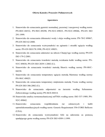Oferta Katedry Procesów Polimerowych Aparatura 1. Stanowisko do oznaczania gęstości normalnej, pozornej i nasypowej według norm: PN-80/C-04532, PN-90/C-89298, PN-92/C-89035, PN-92/C-89046, PN-EN ISO 291:1999. 2. Stanowisko do oznaczania chłonności wody i oleju według norm: PN-78/C-89067, PN-EN ISO 62:2000. 3. Stanowisko do oznaczania wytrzymałości na zginanie i strzałki ugięcia według norm: PN-EN ISO178:1998, PN-82/C-89051. 4. Stanowisko do oznaczania udarności na młocie Charpy'ego według normy PN-EN ISO 179-2:2001. 5. Stanowisko do oznaczania twardości metodą wciskania kulki według norm: PN93/C-89030, PN-EN ISO 2039-1:2002 (U). 6. Stanowisko do oznaczania twardości metodą Shore'a według normy PN-80/C04238. 7. Stanowisko do oznaczania temperatury ugięcia metodą Martensa według normy PN-90/C-89025. 8. Stanowisko do oznaczania temperatury mięknienia metodą Vicata według normy PN-EN ISO 306:2002 (U). 9. Stanowisko do oznaczania odporności na żarzenie według Schramma- Żebrowskiego według normy PN-86/E-04414. 10. Stanowisko analizy termomechanicznej mfTMA według norm: ISO 537-1989, PN92/C-89042. 11. Stanowisko oznaczania współdziałania rur osłonowych i kabli optotelekomunikacyjnych według norm: Generic Requirement 356-CORE Bellcore (USA). 12. Stanowisko do oznaczania wytrzymałości folii na uderzenia za pomocą spadającego grota według normy PN-EN ISO 4589-1:1999. -2- 13. Stanowisko do oznaczania wskaźnika tlenowego według normy PN-EN ISO 4589:1999. 14. Stanowisko do oznaczania wskaźnika szybkości płynięcia według norm: PN-93/C89069, PN-EN ISO 1133:2002 (U). 15. Stanowisko do oznaczania odporności na środowiskową korozję naprężeniową według normy ASTM D 2552-66. 16. Stanowisko do oznaczania wulkanizacji mieszanek gumowych (plastografometr Mooneya) według norm: PN-ISO 289-1:1998, PN-ISO 289-1:1998/Ap1:1999. 17. Stanowisko do oznaczania wytrzymałości na zginanie i kąta ugięcia na aparacie Dynstat. 18. Stanowisko do oznaczania twardości metodą IRH. 19. Stanowisko do oznaczania ścieralności metodą Schoppera-Schlobacha. 20. Stanowisko do oznaczania plastyczności prasowniczej tworzyw termoutwardzalnych metodą Krahla. 21. Stanowisko do badań wytrzymałościowych tworzyw (rozciąganie, ściskanie, zginanie próbek, maszyna wytrzymałościowa ZD-40, siła nacisku 50÷400 kN). 22. Stanowisko do badań wytrzymałościowych tworzyw (rozciąganie, maszyna wytrzymałościowa PT-250M-2, siła rozciągania 2,5 kN). 23. Stanowisko do badań wytrzymałościowych i odpornościowych folii (badanie folii na rozciąganie, maszyna wytrzymałościowa FPG 500 i rejestrator, siła rozciągania do 0,5 kN). 24. Stanowisko do badań wskaźnika przetwarzalności metodą gniazda spiralnego. W skład stanowiska wchodzi: wtryskarka, forma wtryskowa, odpowiednie tworzywo wtryskiwane. 25. Stanowisko do badań struktury metodą mikroskopii optycznej w świetle spolaryzowanym (struktury nadcząsteczkowej). 26. Stanowisko do badań lepkościowo średniego ciężaru cząsteczkowego za pomocą lepkościomierza. 27. Stanowisko do badań właściwości reologicznych za pomocą reometru kapilarnego. 28. Stanowisko do badań właściwości reologicznych za pomocą reometru obrotowego. Do właściwości tych należą: krzywe płynięcia (zależność między naprężeniem -3- ścinającym i szybkością ścinania), krzywe lepkości (zależność lepkości od szybkości ścinania), tryb pomiarów CS, CR oraz oscylacyjny. 29. Stanowisko do badań parametrów termodynamicznego równania stanu oraz do wyznaczania zależności pomiędzy ciśnieniem, objętością właściwą i temperaturą (p-v-T). 30. Stanowisko do badań właściwości przetwórczych tworzyw utwardzalnych (czas, temperatura, droga przepływu, plastografometr BIP). 31. Stanowisko do badań wytłaczania autotermicznego z granulowaniem. Umożliwia przeprowadzenie konwencjonalnego bądź autotermicznego procesu wytłaczania z granulowaniem na ciepło z użyciem głowicy wytłaczarskiej granulacyjnej ze skokowo zmiennym kącie ostrza granulatora. 32. Stanowisko do badań aktywnej strefy rowkowanej wytłaczarki. Umożliwia przeprowadzenie konwencjonalnego bądź autotermicznego procesu wytłaczania w wytłaczarce mającej strefę rowkowaną z rowkami wzdłużnymi lubśrubowymi, w której podczas procesu wytłaczania można: a) w sposób ciągły zmieniać liczbę rowków, ich głębokość oraz kąt pochylenia względem osi układu uplastyczniającego, b) w sposób ciągły zmieniać kierunek oraz kąt skręcania rowków. 33. Stanowisko do badawcze z wytłaczarką wyposażoną w układ uplastyczniający z obrotowym segmentem cylindra. Badaniu podlega wpływ tego segmentu na przebieg procesu wytłaczania. Bezpośrednio jest mierzony przebieg zmian temperatury i ciśnienia tworzywa przetwarzanego, zużycie mocy, masa wytłoczyny, moment obrotowy oraz mierzy się prędkość obrotową ślimaka, jak również prędkość segmentu cylindra. 34. Stanowisko do badań procesu wytłaczania z rozdmuchiwaniem. Stanowisko umożliwia wytłaczanie folii z tworzywa termoplastycznego o różnej grubości. (wytłaczarka W-25D). 35. Stanowisko do badań efektu Barusa oraz natężenia przepływu tworzywa (masowego i objętościowego). Wytłaczarka jednoślimakowa T-32, głowica do wytłaczania prętów kołowych i urządzenia pomiarowe. -4- 36. Stanowisko do badań naprężeń w prowadnicach układu narzędziowego wtryskarki CS 88/63. Służy do określenia przebiegu zmian naprężenia rozciągającego w prowadnicach wtryskarki w funkcji czasu podczas procesu wtryskiwania, przy zmieniającej się wartości ciśnienia wtryskiwania oraz do wyznaczania wartości siły zamykania formy wtryskowej w funkcji ciśnienia wtryskiwania. 37. Stanowisko do badań wydajności zgrzewania pojemnościowego. W skład stanowiska wchodzi zgrzewarka wysokiej częstotliwości ZUT-2B, komplet wymiennych elektrod i niezbędne przyrządy pomiarowe. 38. S