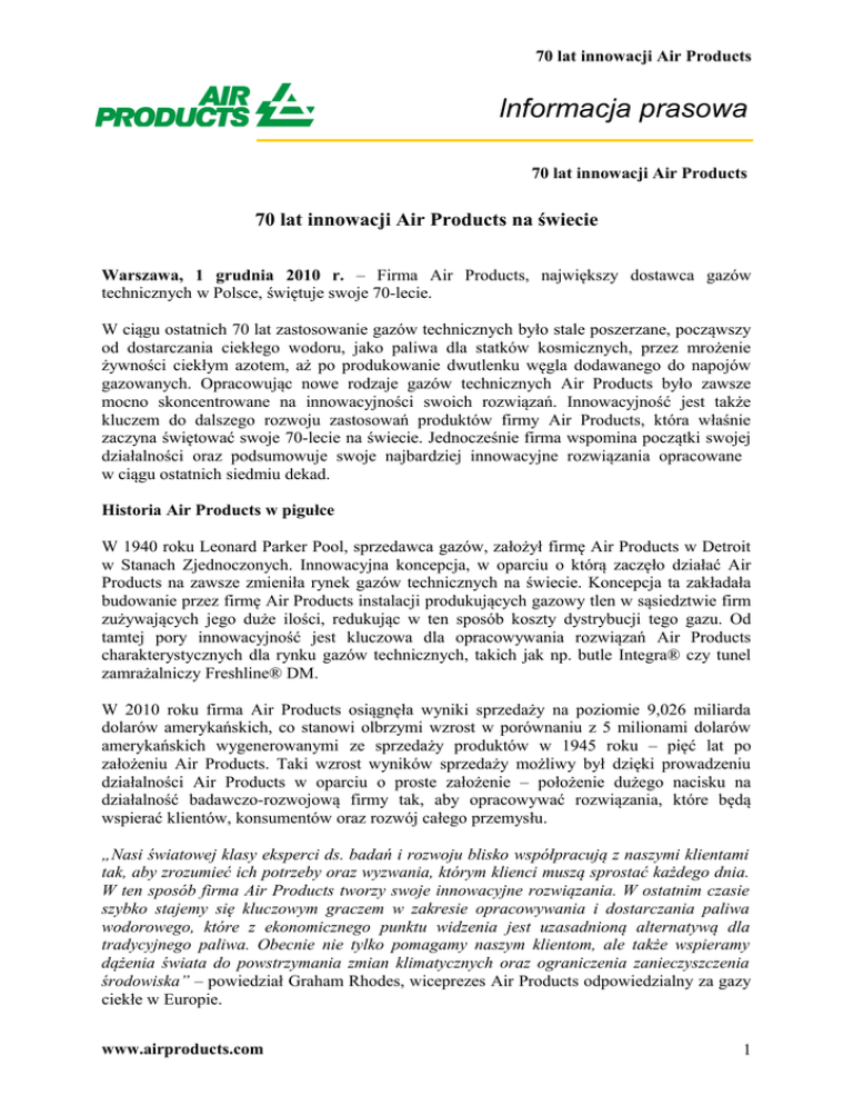 70 lat innowacji Air Products lnformacja prasowa 70 lat innowacji Air Products 70 lat innowacji Air Products na świecie Warszawa, 1 grudnia 2010 r. – Firma Air Products, największy dostawca gazów technicznych w Polsce, świętuje swoje 70-lecie. W ciągu ostatnich 70 lat zastosowanie gazów technicznych było stale poszerzane, począwszy od dostarczania ciekłego wodoru, jako paliwa dla statków kosmicznych, przez mrożenie żywności ciekłym azotem, aż po produkowanie dwutlenku węgla dodawanego do napojów gazowanych. Opracowując nowe rodzaje gazów technicznych Air Products było zawsze mocno skoncentrowane na innowacyjności swoich rozwiązań. Innowacyjność jest także kluczem do dalszego rozwoju zastosowań produktów firmy Air Products, która właśnie zaczyna świętować swoje 70-lecie na świecie. Jednocześnie firma wspomina początki swojej działalności oraz podsumowuje swoje najbardziej innowacyjne rozwiązania opracowane w ciągu ostatnich siedmiu dekad. Historia Air Products w pigułce W 1940 roku Leonard Parker Pool, sprzedawca gazów, założył firmę Air Products w Detroit w Stanach Zjednoczonych. Innowacyjna koncepcja, w oparciu o którą zaczęło działać Air Products na zawsze zmieniła rynek gazów technicznych na świecie. Koncepcja ta zakładała budowanie przez firmę Air Products instalacji produkujących gazowy tlen w sąsiedztwie firm zużywających jego duże ilości, redukując w ten sposób koszty dystrybucji tego gazu. Od tamtej pory innowacyjność jest kluczowa dla opracowywania rozwiązań Air Products charakterystycznych dla rynku gazów technicznych, takich jak np. butle Integra® czy tunel zamrażalniczy Freshline® DM. W 2010 roku firma Air Products osiągnęła wyniki sprzedaży na poziomie 9,026 miliarda dolarów amerykańskich, co stanowi olbrzymi wzrost w porównaniu z 5 milionami dolarów amerykańskich wygenerowanymi ze sprzedaży produktów w 1945 roku – pięć lat po założeniu Air Products. Taki wzrost wyników sprzedaży możliwy był dzięki prowadzeniu działalności Air Products w oparciu o proste założenie – położenie dużego nacisku na działalność badawczo-rozwojową firmy tak, aby opracowywać rozwiązania, które będą wspierać klientów, konsumentów oraz rozwój całego przemysłu. „Nasi światowej klasy eksperci ds. badań i rozwoju blisko współpracują z naszymi klientami tak, aby zrozumieć ich potrzeby oraz wyzwania, którym klienci muszą sprostać każdego dnia. W ten sposób firma Air Products tworzy swoje innowacyjne rozwiązania. W ostatnim czasie szybko stajemy się kluczowym graczem w zakresie opracowywania i dostarczania paliwa wodorowego, które z ekonomicznego punktu widzenia jest uzasadnioną alternatywą dla tradycyjnego paliwa. Obecnie nie tylko pomagamy naszym klientom, ale także wspieramy dążenia świata do powstrzymania zmian klimatycznych oraz ograniczenia zanieczyszczenia środowiska” – powiedział Graham Rhodes, wiceprezes Air Products odpowiedzialny za gazy ciekłe w Europie. www.airproducts.com 1 70 lat innowacji Air Products „To było imponujące 70 lat dla Air Products. Czasami trzeba spojrzeć wstecz, aby móc patrzeć w przyszłość. W Air Products świętujemy nasze przełomowe dokonania i bazując na nich koncentrujemy się na naszym rozwoju w przyszłości, którego fundamentem z pewnością będzie opracowywanie dalszych innowacji” – dodał Graham Rhodes. Eksperci Air Products ds. badań i rozwoju opracowali szeroką gamę innowacyjnych produktów, które zyskały wiodącą pozycję rynkową i zostały uznane za ikony wśród rozwiązań, stosowanych codziennie na całym świecie przez klientów wykorzystujących gazy techniczne. Portfolio kluczowych, innowacyjnych i znanych na całym świecie rozwiązań Air Products obejmuje: • • • • • • • • Przenośne generatory produkujące tlen – wykorzystywane przez wojsko podczas II Wojny Światowej w trakcie lotów na dużych wysokościach. Ciekły wodór – paliwo do samolotów sił powietrznych (Air Force), wykorzystywane następnie w rakietach NASA; opracowane przez Air Products w Stanach Zjednoczonych w 1957 r. po wystrzeleniu na orbitę ziemską sztucznego satelity Sputnik. Proces odzyskiwania helu z gazu ziemnego, proces skraplania gazu ziemnego oraz wymiennik ciepła pozwalający na kompresowanie tego gazu – opracowane przez Air Products w latach 60-tych. Tunel Cryo Quick – pierwszy tunel zamrażalniczy, wykorzystujący do zamrażania żywności ciekły azot, opracowany przez Air Products w latach 60-tych, w sytuacji szybko rosnącego popytu na gotowe dania mrożone. 45 lat później jedną z najnowszych innowacji Air Products jest tunel zamrażalniczy Freshline® DM, który umożliwia mrożenie w ciągu 1 godziny aż do 1800 kg pojedynczych, niewielkich porcji żywności metodą IQF (ang. individually quick frozen – indywidualne szybkie mrożenie). Surfaktanty Surfynol® - przełomowe dodatki chemiczne wprowadzone przez Air Products na rynek ponad 40 lat temu. Producenci powłok przemysłowych zastąpili dzięki nim wiele szkodliwych technologii rozpuszczalnikowych, stosując technologie wodne. Innowacyjny system kriogenicznej kondensacji – opracowany przez Air Products we wczesnych latach 90-tych. Pozwala on odzyskiwać szkodliwe substancje ze starych lodówek i zamrażarek. Mniej więcej w tym samym czasie Air Products opracowało PolarSnow® - technologię do wytwarzania sztucznego śniegu na potrzeby rekreacji oraz różnych aplikacji pozwalających na testowanie produktów. Ciekły azot – firma Air Products będąc ekspertem w zakresie technologii kriogenicznych dostarcza ciekły azot dla firm z różnych sektorów przemysłu, np. ciekły azot jest wykorzystywany do tworzenia warunków charakteryzujących się niezwykle niskimi temperaturami, w których testowane są technologie lotnicze i kosmiczne. Gama butli Integra® i technologia BIP® - zaprojektowane i wprowadzo