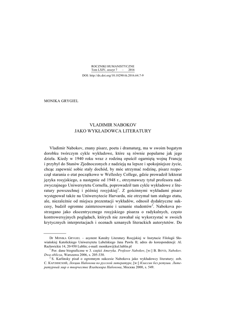 ROCZNIKI HUMANISTYCZNE Tom LXIV, zeszyt 7 – 2016 DOI: http://dx.doi.org/10.18290/rh.2016.64.7-9 MONIKA GRYGIEL* VLADIMIR NABOKOV JAKO WYKŁADOWCA LITERATURY Vladimir Nabokov, znany pisarz, poeta i dramaturg, ma w swoim bogatym dorobku twórczym cykle wykładowe, które są równie popularne jak jego dzieła. Kiedy w 1940 roku wraz z rodziną opuścił ogarniętą wojną Francję i przybył do Stanów Zjednoczonych z nadzieją na lepsze i spokojniejsze życie, chcąc zapewnić sobie stały dochód, by móc utrzymać rodzinę, pisarz rozpoczął starania o etat początkowo w Wellesley College, gdzie prowadził lektorat języka rosyjskiego, a następnie od 1948 r., otrzymawszy tytuł profesora nadzwyczajnego Uniwersytetu Cornella, poprowadził tam cykle wykładowe z literatury powszechnej i później rosyjskiej1. Z gościnnymi wykładami pisarz występował także na Uniwersytecie Harvarda, nie otrzymał tam stałego etatu, ale, niezależnie od miejsca prezentacji wykładów, odnosił dydaktyczne sukcesy, budził ogromne zainteresowanie i uznanie studentów2. Nabokova postrzegano jako ekscentrycznego rosyjskiego pisarza o radykalnych, często kontrowersyjnych poglądach, których nie zawahał się wykorzystać w swoich krytycznych interpretacjach i ocenach uznanych literackich autorytetów. Do Dr MONIKA GRYGIEL – asystent Katedry Literatury Rosyjskiej w Instytucie Filologii Słowiańskiej Katolickiego Uniwersytetu Lubelskiego Jana Pawła II; adres do korespondencji: Al. Racławickie 14, 20-950 Lublin; e-mail: [email protected] 1 Por. dane biograficzne w 3. części Ameryka. Profesor Nabokov, [w:] B. BOYD, Nabokov. Dwa oblicza, Warszawa 2006, s. 205-330. 2 S. Karlinsky pisał o ogromnym sukcesie Nabokova jako wykładowcy literatury; zob. С. КАРЛИНСКИЙ, Лекции Набокова по русской литературе, [w:] Классик без ретуши. Литературный мир о творчестве Владимира Набокова, Москва 2000, s. 549. 138 MONIKA GRYGIEL pracy wykładowcy – jak twierdził Nabokov – był przygotowany od dawna, często publicznie wygłaszając liczne wykłady i odczyty, poza tym zapobiegliwie kompletując wykłady w Europie i potem w Stanach Zjednoczonych. Przyznawał: W 1940 roku, zanim jeszcze zaczęła się moja uniwersytecka kariera w Ameryce, podjąłem szczęśliwie trud napisania setki wykładów – około 2 tysięcy stron rękopisu – poświęconych literaturze rosyjskiej, a potem kolejnej setki traktującej o wielkich powieściopisarzach, od Jane Austen po Jamesa Joyce’a. Dzięki temu mogłem z powodzeniem funkcjonować w Wellesley i Cornell przez dwadzieścia akademickich lat3. Stanowisko wykładowcy akademickiego pisarz zwolnił w 1960 r. po sukcesie jego Lolity (Лолита), która mu przyniosła nie tylko międzynarodową sławę, ale i profity finansowe, gwarantujące stały dochód bez konieczności dorabiania jako wykładowca. Na wstępie należy zaznaczyć, iż Nabokov podjął się wykładania literatury z konieczności, nie miał zapędów dydaktycznych lecz potrzeby finansowe i w pierwszym dogodnym momencie rozstał się z męczącym go zajęciem. Już w 1950 r. znużony cyklicznością wykładów, powtarzaniem stale tych samych lub podobnych treści, zaproponował władzom uczelni Cornell nagranie na taśmie magnetofonowej treści wykładów i odtwarzanie ich bez udziału wykładowcy. Spotkało się to jednak z kategorycznym sprzeciwem przełożonych. Nie znaczy to, oczywiście, iż Nabokov nie cenił swych doświadczeń akademickich, a obowiązki wykonywał bez zaangażowania. Było wręcz odwrotnie, pisarz skrupulatnie z wielkim poświęceniem i odpowiedzialnością przygotowywał się do zajęć, jego wykłady poprzedzała mozolna i wielokrotna praca z tekstem oraz nowatorskie interpretacje, w które angażował swą wiedzę i przekonania. Od strony praktycznej, formalnej wykłady prowadzone przez Nabokova, wedle wspomnień jego studentów, wyglądały następująco: pisarz na zajęcia przybywał zawsze w towarzystwie żony Very, która była jego sekretarką, asystentką i kierowcą, która także w czasie, kiedy pisarz zdejmował wierzchnie okrycie, rozkładała na jego biurku notatki wykładowe, pilnowała, by wszystko było w odpowiedniej kolejności, następnie siadała z boku na audytorium i pozostawała do końca zajęć. Podsuwała mężowi zaznaczone fragmenty tekstów, niejednokrotnie rysowała na tablicy wykresy, a nawet zastępowała pisarza 3 V. NABOKOV, Wykłady o literaturze, przeł. Z. Batko, Warszawa 2005, s. 5. VLADIMIR NABOKOV JAKO WYKŁADOWCA LITERATURY 139 podczas jego niedyspozycji, wygłaszając teksty wykładowe do słuchaczy4. Punktualnie o wyznaczonej godzinie Nabokov rozpoczynał swój wykład i dokładnie o wyznaczonej godzinie go kończył, a na pierwszych zajęciach zaznaczał: Miejsca są ponumerowane. Chciałbym, żeby każdy wybrał sobie miejsce i trzymał się go. To dlatego, że chciałbym kojarzyć wasze twarze z nazwiskami. Czy wszyscy zadowoleni ze swoich miejsc? W porządku. Żadnych rozmów, palenia, szydełkowania, czytania gazet, przysypiania – i na litość boską, notujcie5. Nabokov zalecał, by każdy student podczas wykładu miał przed sobą omawianą lekturę, która powinna być wykorzystywana, gdy wykładowca będzie podawał liczne cytaty. Także powinien mieć dostęp do słowników w sytuacji, kiedy nie rozumie znaczenia słów, utrudniających – zdaniem Nabokova – właściwe zrozumienie całego wykładu. Za bezwzględny warunek do odpowiedzialnego i właściwego przygotowania wykładu uznawał Nabokov nie jednokrotne, ale kilkakrotne przeczytanie omawianej lektury. W eseju zatytułowanym Dobrzy czytelnicy i dobrzy pisarze (Хорошие читатели и хорошие писатели), wygłoszeniem którego ponoć pisarz rozpoczynał swe serie wykładowe, stwierdzał: […] człowiek nie może czytać książki; może