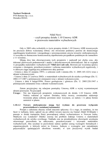 Norbert Świderek PTS Betrans Sp. z o.o. Doradca DGSA Nihil Novi – czyli przepisy działu 1.10 Umowy ADR w przewozie materiałów wybuchowych Gdy w 2005 roku wchodziły w Ŝycie przepisy działu 1.10 Umowy ADR towarzyszyło im poczucie dobrze wykonanej roboty: oto stworzono podstawy prawne do skutecznego zapobiegania kradzieŜom i niezgodnego z przeznaczeniem uŜycia towarów niebezpiecznych. A wszystko to tłumaczono koniecznością zapobieŜenia przypadkom podobnym do zamachów z 11 września… Mijają dwa lata obowiązywania tych przepisów i nadszedł juŜ chyba czas, aby dokonać pierwszych podsumowań i analiz z dotychczasowych doświadczeń. Jak to wygląda w przypadku materiałów wybuchowych? Nihil novi sub sole. Bowiem juŜ wcześniej sprawy związane z dostępem, przechowywaniem i ochroną materiałów wybuchowych regulowały, i w dalszym ciągu regulują trzy podstawowe akty prawne: - Ustawa z dnia 22 sierpnia 1997r. o ochronie osób i mienia (Dz. U. 2005.145.1221) wraz z aktami wykonawczymi, - Ustawa z dnia 21 czerwca 2002r. o materiałach wybuchowych do uŜytku cywilnego (Dz. U. 2002.117.1007 z późniejszymi zmianami) wraz z aktami wykonawczymi, - Ustawa z dnia 4 lutego1994r. Prawo geologiczne i górnicze (Dz. U. 2005.228.1947 z późniejszymi zmianami) wraz z aktami wykonawczymi. Zatem przyjrzyjmy się relacjom pomiędzy Umową ADR a wyŜej wymienionymi aktami prawnymi. Na początek Uwaga : Nie ma krajowych przepisów wykonawczych do działu 1.10 Umowy ADR. NaleŜy wdraŜać je wprost. Doradca, który tworzy, ewentualnie nadzoruje tworzenie planu ochrony powinien mieć wyczucie, co naleŜy i w jakiej formie umieścić w planie. 1.10.1.2 Towary niebezpieczne mogą być wydane do przewozu wyłącznie przewoźnikowi o ustalonej toŜsamości. Przepis z załoŜenia słuszny został znacznie spłycony. Co z tego, Ŝe ustalimy, Ŝe ten facet w turbanie, który zgłosił się po odbiór towaru nazywa się Gamal Abdel El-Khader i pracuje w dziale transportu firmy prowadzącej roboty wyburzeniowe w Nowym Jorku, Madrycie czy Londynie? Daleko szerzej ten problem traktuje Ustawa o materiałach wybuchowych do uŜytku cywilnego. Nakłada ona na przedsiębiorcę obowiązek uzyskania stosownego pozwolenia na nabywanie, przechowywanie i uŜywanie materiałów wybuchowych. Aby uzyskać to pozwolenie naleŜy spełnić szereg wymogów formalnych i organizacyjnych, o których mówi ta Ustawa. Jednym z wymogów jest zatrudnianie pracowników spełniających określone warunki, w tym pozytywny wynik badań psychiatrycznych i psychologicznych, niekaralność oraz pozytywna opinia powiatowego/miejskiego komendanta policji. NaleŜy domniemać, Ŝe przed wystawieniem opinii komendant metodami operacyjnymi prześwietli takiego delikwenta, czy przypadkiem jego poglądy nie zagraŜają bezpieczeństwu publicznemu państwa. Niestety, te wymagania nie dotyczą kierowców przewoŜących materiały wybuchowe. Praktyka: Firma „K”, dysponując wszystkimi wymaganymi pozwoleniami, zamawia w firmie „E” materiały wybuchowe wskazując jednocześnie, Ŝe towar będzie odbierany przez ich upowaŜnionego pracownika, a przewoźnikiem będzie firma „B”. KaŜdorazowo, przed odbiorem kolejnej partii towaru podawane są dane osoby odbierającej, kierowcy pojazdu oraz numer rejestracyjny samochodu. Nie zaawizowany wcześniej pojazd nie wjedzie w ogóle na teren zakładu. 1.10.1.4 KaŜdy członek załogi pojazdu przewoŜącego towary niebezpieczne powinien posiadać przy sobie dokument z fotografią potwierdzający jego toŜsamość. Przepis do końca roku 2006, tzn. do momentu wprowadzenia definicji członka załogi pojazdu, co najmniej dyskusyjny. PrzecieŜ kaŜdy kierowca w trakcie prowadzenia pojazdu powinien posiadać przy sobie przynajmniej prawo jazdy – a to, jak wiadomo jest ze zdjęciem. Od 1 stycznia 2007r. obowiązuje definicja członka załogi pojazdu rozszerzająca krąg tych osób m.in. o osoby związane z ochroną lub czynnościami ładunkowymi. I tu nasuwa się pytanie: czy legitymacja słuŜbowa bądź przepustka pracownicza do firmy, posiadająca zdjęcie jest dokumentem wystarczającym do potwierdzenia toŜsamości. AŜ się prosi, aby w dokumencie wykonawczym enumeratywnie wymienić rodzaje dokumentów spełniających wymagania umowy ADR. Moim zdaniem powinny to być dokumenty zawierające co najmniej numer PESEL lub datę urodzenia i imiona rodziców, ze zdjęciem nadrukowanym oraz wydane przez organa władz państwowych lub samorządowych. Czy nie naleŜałoby zmienić obecnie obowiązującego wzoru zaświadczenia ADR dla kierowców? Obecnie uŜywany „papierek” jest podatny na uszkodzenia i bez problemu moŜna w nim samodzielnie rozszerzyć zakres obowiązywania np. na klasę 1, czego w chwili obecnej nie moŜna zweryfikować. Praktyka: W firmach „K” i „B”, przewoŜących materiały wybuchowe, wszystkie osoby biorące udział w konwoju: kierowcy pojazdów przewoŜącego ładunek i konwojującego, magazynier dokonujący odbioru towaru od producenta i konwojenci w trakcie odprawy przed wyjazdem mają obowiązek okazać stosowne dokumenty: zarówno dokumenty toŜsamości jak i licencje pracownika ochrony, dokumenty broni, dokumenty pojazdów, upowaŜnienie do odbioru ładunku, zezwolenie na przemieszczanie materiału wybuchowego itd… 1.10.1.5 Kontrole stanu bezpieczeństwa określone pod 1.8.1 i 7.5.1.1 powinny obejmować sprawdzenie, czy zostały zastosowane odpowiednie środki ochrony. Praktyka: W okresie od stycznia do końca października 2006r. ITD przeprowadziła 5 (słownie: pięć) kontroli planów ochrony. Kontrole te były typu zero-jedynkowego – sprawdzono czy jest plan ochrony, lecz nie wnikano w ich treść merytoryczną. 1.10.1.6 Właściwa władza powinna prowadzić bieŜącą ewidencję waŜnych zaświadczeń o przeszkoleniu kierowców, określonych pod 8.2.1, wydanych przez tę władzę lub przez inną upowaŜnioną organizację. Kierowca Grzegorz R. w 2