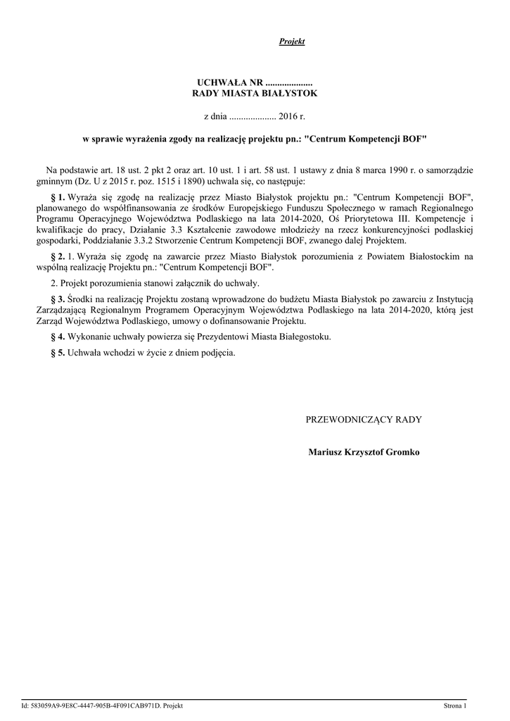 Projekt UCHWAŁA NR .................... RADY MIASTA BIAŁYSTOK z dnia .................... 2016 r. w sprawie wyrażenia zgody na realizację projektu pn.: "Centrum Kompetencji BOF" Na podstawie art. 18 ust. 2 pkt 2 oraz art. 10 ust. 1 i art. 58 ust. 1 ustawy z dnia 8 marca 1990 r. o samorządzie gminnym (Dz. U z 2015 r. poz. 1515 i 1890) uchwala się, co następuje: § 1. Wyraża się zgodę na realizację przez Miasto Białystok projektu pn.: "Centrum Kompetencji BOF", planowanego do współfinansowania ze środków Europejskiego Funduszu Społecznego w ramach Regionalnego Programu Operacyjnego Województwa Podlaskiego na lata 2014-2020, Oś Priorytetowa III. Kompetencje i kwalifikacje do pracy, Działanie 3.3 Kształcenie zawodowe młodzieży na rzecz konkurencyjności podlaskiej gospodarki, Poddziałanie 3.3.2 Stworzenie Centrum Kompetencji BOF, zwanego dalej Projektem. § 2. 1. Wyraża się zgodę na zawarcie przez Miasto Białystok porozumienia z Powiatem Białostockim na wspólną realizację Projektu pn.: "Centrum Kompetencji BOF". 2. Projekt porozumienia stanowi załącznik do uchwały. § 3. Środki na realizację Projektu zostaną wprowadzone do budżetu Miasta Białystok po zawarciu z Instytucją Zarządzającą Regionalnym Programem Operacyjnym Województwa Podlaskiego na lata 2014-2020, którą jest Zarząd Województwa Podlaskiego, umowy o dofinansowanie Projektu. § 4. Wykonanie uchwały powierza się Prezydentowi Miasta Białegostoku. § 5. Uchwała wchodzi w życie z dniem podjęcia. PRZEWODNICZĄCY RADY Mariusz Krzysztof Gromko Id: 583059A9-9E8C-4447-905B-4F091CAB971D. Projekt Strona 1 Załącznik do Uchwały Nr .................... Rady Miasta Białystok z dnia....................2016 r. POROZUMIENIE w sprawie zasad współpracy Stron porozumienia przy przygotowaniu i realizacji projektu pn.: "Centrum Kompetencji BOF" zawarte w dniu …………… 2016 r. pomiędzy: Miastem Białystok reprezentowanym przez .........................., przy kontrasygnacie Skarbnika Miasta ................., zwanym dalej Miastem, a Powiatem Białostockim reprezentowanym przez Zarząd Powiatu, w imieniu którego ………................................................., przy kontrasygnacie Skarbnika Powiatu ........................., działają: zwanym dalej Powiatem. § 1. 1. Strony porozumienia zgodnie postanawiają, że zawierają partnerstwo, którego celem jest przygotowanie i realizacja projektu pn.: "Centrum Kompetencji BOF", zwanego dalej projektem, w ramach którego zostanie utworzone Centrum Kompetencji Białostockiego Obszaru Funkcjonalnego, zwane dalej Centrum Kompetencji BOF. 2. Realizacja projektu ma na celu podniesienie kompetencji uczniów i słuchaczy szkół zawodowych zwiększających szanse na regionalnym rynku pracy. 3. Zadaniem Centrum Kompetencji BOF będzie realizacja m.in. działań polegających na: a) rozwoju współpracy szkół zawodowych z ich otoczeniem społeczno-gospodarczym, w celu lepszego dostosowania oferty kształcenia do rzeczywistych potrzeb regionalnego i lokalnych rynków pracy; b) organizowaniu staży i praktyk dla uczniów, nauczycieli oraz instruktorów praktycznej nauki zawodu realizowanych u pracodawców; c) rozwoju poradnictwa zawodowo – edukacyjnego uwzględniającego zdiagnozowane luki kompetencyjne, przy jednoczesnej współpracy z pracodawcami; d) wsparciu szkół/placówek kształcenia zawodowego w opracowaniu diagnozy ich potrzeb oraz programu wsparcia niezbędnego do przygotowania i realizacji przez szkołę programu rozwojowego uwzględniającego sytuację na regionalnym i lokalnych rynkach. 4. Projekt swoim zasięgiem obejmie szkoły zawodowe, dla których organem prowadzącym są Strony porozumienia, zlokalizowane na terenie gmin znajdujących się na obszarze realizacji Zintegrowanych Inwestycji Terytorialnych, określonym w Uchwale Nr 29/250/2015 Zarządu Województwa Podlaskiego z dnia 17 marca 2015 r. w sprawie wyznaczenia obszaru realizacji Zintegrowanych Inwestycji Terytorialnych dla Białostockiego Obszaru Funkcjonalnego w ramach Regionalnego Programu Operacyjnego Województwa Podlaskiego na lata 2014-2020 (zwanego dalej RPOWP na lata 2014-2020). 5. W celu pozyskania środków na realizację projektu Strony porozumienia postanawiają ubiegać się o dofinansowanie ze środków Europejskiego Funduszu Społecznego w ramach RPOWP na lata 2014-2020, Oś Priorytetowa III. Kompetencje i kwalifikacje do pracy, Działanie 3.3 Kształcenie zawodowe młodzieży na rzecz konkurencyjności podlaskiej gospodarki, Poddziałanie 3.3.2 Stworzenie Centrum Kompetencji BOF, dla którego w I kw. 2016 r. planowane jest ogłoszenie naboru wniosków o dofinansowanie. 6. Szczegółowy zakres rzeczowy projektu zostanie określony we wniosku o dofinansowanie. § 2. W ramach niniejszego porozumienia: Id: 583059A9-9E8C-4447-905B-4F091CAB971D. Projekt Strona 2 1. Powiat zobowiązuje się do: 1) aktywnego uczestnictwa i współpracy w działaniach mających na celu przygotowanie oraz realizację projektu; 2) zapewnienia udziału personelu o odpowiednich kwalifikacjach na etapie przygotowania i realizacji projektu; 3) zabezpieczenia środków, o których mowa w § 3 ust. 4 w budżecie Powiatu; 4) prawidłowej realizacji umowy o dofinansowanie oraz działań zaplanowanych w projekcie. 2. Miasto zobowiązuje się do: 1) aktywnego uczestnictwa i współpracy w działaniach mających na celu przygotowanie oraz realizację projektu; 2) zapewnienia udziału personelu o odpowiednich kwalifikacjach na etapie przygotowania i realizacji projektu; 3) zabezpieczenia środków, o których mowa w § 3 ust. 4 w budżecie Miasta; 4) prawidłowej realizacji umowy o dofinansowanie oraz działań zaplanowanych w projekcie; 5) wyłonienia Partnera projektu, wspólnie z którym Strony porozumienia opracują szczegółową koncepcję i zakres działań projektu oraz przygotują wniosek o dofinansowanie realizacji projektu wraz z załącznikami, o którym mowa w § 1 ust. 6