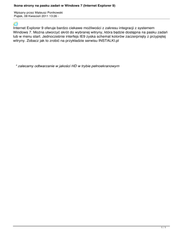 Ikona strony na pasku zadań w Windows 7 (Internet Explorer 9) Wpisany przez Mateusz Ponikowski Piątek, 08 Kwiecień 2011 13:26 - Internet Explorer 9 oferuje bardzo ciekawe możliwości z zakresu integracji z systemem Windows 7. Można utworzyć skrót do wybranej witryny, która będzie dostępna na pasku zadań lub w menu start. Jednocześnie interfejs IE9 zyska schemat kolorów zaczerpnięty z przypiętej witryny. Zobacz jak to zrobić na przykładzie serwisu INSTALKI.pl * zalecamy odtwarzanie w jakości HD w trybie pełnoekranowym 1/1