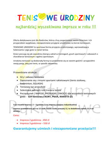 TENIS WE URODZINY najbardziej wyczekiwana impreza w roku !!! Oferta dedykowana jest dla Rodziców, którzy chcą zorganizować swoim Dzieciom i ich przyjaciołom wyjątkowe, niezapomniane przyjęcie urodzinowe na korcie tenisowym. TENISOWE URODZINY to sportowa forma przyjęcia urodzinowego, wprowadzająca Solenizanta i jego gości w świat tenisa. Dzieci poczują się jak zawodnicy biorący udział w treningach, grach sportowych i zabawach o charakterze tenisowym i ogólno sportowym. Urodziny tenisowe są doskonałą formą na podzielenie się ze swoimi gośćmi i przyjaciółmi swoją pasją, jaką jest tenis, w sposób zabawowy. Przewidziane atrakcje: Gry i zabawy tenisowe Zapoznanie się z innymi sportami rakietowymi (tenis stołowy, badminton, SQUASH) Tenisowy tor przeszkód Solenizant pełniący role trenera tenisa Poczęstunek ( NAPOJE, PRZEKĄSKI, OWOCE) dla wszystkich tenisowych gości - tort tenisowy ( KORT, PIŁKA, RAKIETA ) Czas trwania imprezy: 2 – 3 godziny (czas imprezy ustalany indywidualnie) Impreza przewidziana jest na 12 osób. Każda osoba powyżej 12, to dodatkowa opłata 15 zł od dziecka. Cena: Impreza 2 godzinna - 450 zł Impreza 3 godzinna – 550 zł Gwarantujemy uśmiech i niezapomniane przeżycia!!!