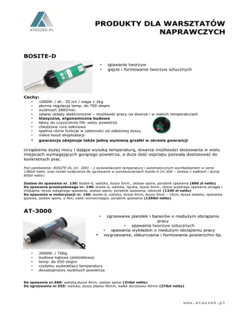 PRODUKTY DLA WARSZTATÓW NAPRAWCZYCH BOSITE-D spawanie tworzyw gięcie i formowanie tworzyw sztucznych • • Cechy: • • • • • • • • • 1600W. / dł.: 35 cm / waga 1.2kg płynna regulacja temp. do 700 stopni wydmuch 280l/min. zalane układy elektroniczne – możliwość pracy na dworze i w niskich temperaturach klasyczna, ergonomiczna budowa łatwy do czyszczenia filtr wlotu powietrza chłodzona rura osłonowa spełnia różne funkcje w zależności od założonej dyszy niskie koszt eksploatacji • gwarancja obejmuje także jedną wymianę grzałki w okresie gwarancji Urządzenie dużej mocy i dające wysoką temperaturą, stwarza możliwości stosowania w wielu miejscach wymagających gorącego powietrza, a duża ilość osprzętu pozwala dostosować do konkretnych prac. Pod zamówienie: BOSITE-DL (nr. 200) – z wyświetlaczem temperatury i automatycznym wychładzaniem w cenie 1380zł netto. oraz model wyłączenie do zgrzewania w pomieszczeniach bosite-h (nr.500 – zestaw z wałkiem i dyszą 850zł netto). Zestaw do spawania nr. 130: bosite-d, walizka, dysza 5mm., zestaw spoiw, poradnik spawania (890 zł netto) Do spawania przemysłowego nr. 140: bosite-d, walizka, rączka, dysza 5mm., dysza szybkiego spawania okrągła i trójkątna, dysza wstępnego spawania, zestaw spoiw, poradnik spawania, zdzierak (1240 zł netto) Do spawania w motoryzacji nr. 150: bosite-d, walizka, dysza 5mm, dysza 5mm – 15cm, dysza żelazko, spawarka gazowa, zestaw spoiw, u-flex, siatki wzmacniające, poradnik spawania (1290zł netto) AT-3000 • • • • • • • zgrzewanie plandek i banerów o niedużym obciążeniu pracy • spawania tworzyw sztucznych • spawania wykładzin o niedużym obciążeniu pracy wygrzewanie, obkurczania i formowanie powierzchni itp. 2000W. / 700g. budowa kątowa (pistoletowa) temp. do 650 stopni czytelny wyświetlacz temperatury dwustopniowy wydmuch powietrza Do spawania nr.560: walizka,dysza 5mm, zestaw spoiw (310zł netto) Do zgrzewania nr.555: walizka, dysza płaska 40mm, wałek dociskowy 40mm (370zł netto) www.ataszek.pl Dysza szczelinowa do wygrzewania, opalania itp. np. obklejania reklam na samochodach nr.675: (26zł netto) 50mm nr.676:(26zł netto) 70mm Siatka wzmacniająca (12x15cm) 10szt - do spoiwa u-flex i PUR (naprawy motoryzacyjne) Dysza płaskoszczelinowa – do zgrzewania np. plandek, banerów itp. nr.674: (55zł netto) 40mm Dysza punktowa 5mm np. do spawania lub podgrzewania nr. 606: (25zł netto) nr.666: (35zł netto) elastyczna nr.667: (35zł netto) sztywna nr.668: (50zł netto) super sztywna BOSITE-S spawania tworzyw motoryzacyjnych i przemysłowych • • • • • zewnętrzna dmuchawa osobna rękojeść ( lekka i poręczna do długich prac) przewód aż 2,5m. moc: 1600W/temp.do 600 stopni wyświetlacz temperatury Oddzielona dmuchawa zwiększa wygodę użytkowania podczas długich prac. Dmuchawę można podwiesić na stanowisku pracy lub nosić na pasku przy sobie. Do spawania: podstawowy nr.190: bosite-s, walizka, dysza 5mm., zestaw spoiw, poradnik spawania (1450 zł netto) Do spawania: rozszerzony nr.191: bosite-s, walizka, dysza 5mm., dysza szybkiego spawania okrągła i trójkątna, dysza wstępnego spawania, zestaw spoiw, poradnik spawania, zdzierak (1720 zł netto) Spawarka do plastiku gazowa SP#2 spawanie części z tworzyw sztucznych do 5mm. • • • • • • • • • bardzo lekka i poręczna nie wymaga prądu do działania do prac ciągłych płynna regulacja temp. nie potrzebne są dodatkowe butle do zasilania wygoda użytkowania bardzo mała waga 230g szybkie uruchamianie i wyłączanie (nie potrzeba wychładzać) wraz z bosite-d/s idealny zestaw do warsztatów naprawczych nr. 585: dysza 9mm, redukcja 5mm, zestaw spoiw, poradnik spawania (245zł netto) AT-950 jako sprzęt w warsztatach naprawczych do cieńszych tworzyw do 4mm. (np. także dodatkowo do modelu bosite-d) • • • łatwa i wygodna w użytkowaniu bardzo mała waga rękojeści temperatura do 500 stopni nr.580 dysza zwężająca, dysza zwężająca wydłużona, zestaw spoiw, poradnik spawania (350zł netto) www.ataszek.pl Zszywarka do tworzyw SP#2 wstępne łączenie tworzyw przed spawaniem, wgrzewaniem, klejeniem i procesach produkcyjnych • • • • efektywny prosta konstrukcja i wygodna w użytkowaniu długi 3m kabel od sterownika znacznie skraca czas naprawy przy rozległych pęknięciach tworzyw – obniża koszty naprawy wstawianie zszywek odbywa się na gorąco przez co proces jest szybki i nr. 590: zszywarka, walizka, 600 zszywek (6 rodzai po 100szt), obcinaczki (480zł netto) Druty z tworzywa są wykonywane z czystego granulatu i dlatego wyróżniają się od innych drutów/profili Spoiwa na odcinki (cięte 40cm) – do spawania/napraw różnego rodzaju części (kształt: pasek 8mm, trójkąt 3,5 , trapez 3mm.) spoiwa z metra – do spawania elementów przemysłowych i wykładzin PVC 45zł/1kg 55zł/1kg 30zł/0,5kg 35zł/0,5kg 7 zł/0,1kg 8zł/0,1kg PP PEHD PELD PVC (miękkie) PVC (twarde) PP/EPDM PP-TD10 PP-TD20 PP-TD30 PP-TD40 HIPS (PS twardy) ABS PP+ET2X PP/PE (PP+E) PPs 65zł/1kg PA (pa6) PA 66 (PA+PPE) PA/ABS ABS/PC ASA PBT PBT/ABS PBT/PC PC PC/ABS PC/PBT (xenoy) 75zł/1kg 85zł/1kg 160zł/1kg 40zł/0,5kg 45zł/0,5kg 50zł/0,5k g 90zł/0,5kg 10zł/0,1kg 10zł/0,1kg 15zł/0,1k g 25zł/0,1kg PE uniwersal PP+GF PPO PUR (pu/rim) PP uniwersal PA+GF PPE+PA ABS uniwersal (AES) TPO PPO+PA TPE pod zam. PMMA (pleksi) U-FLEX z włóknem szklanym (spoiwo uniwersalne) POM P/E PET SAN pod zam. PE-s (spożywka) TEO pod.zam Spoiwa/druty z metra: PP, PPs, PEHD, PELD, PVC, ABS – inne pod zamówienie Szlifierko frezarka prosta IBS Moc: 100W Obroty: 5000-20000 Napięcie: 230V Trzpienie do 3,2mm Zestaw z 6 dodatkowymi frezami do tworzyw w walizce: 435zł netto Szlifierko frezarka kątowa LWB Moc: 100W Obroty: 3000-15000 Napęcie:230V Trzpienie do 3,2mm. www.ataszek.pl Zestaw z 6 dodatkowymi frezami do tworzyw w walizce: 515zł netto Szlifierka t