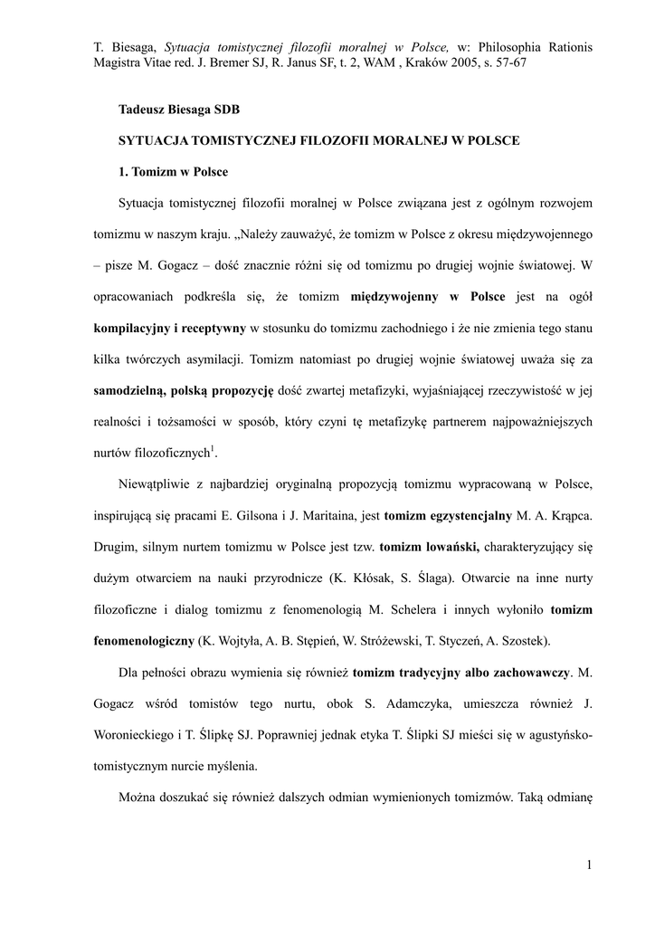 T. Biesaga, Sytuacja tomistycznej filozofii moralnej w Polsce, w: Philosophia Rationis Magistra Vitae red. J. Bremer SJ, R. Janus SF, t. 2, WAM , Kraków 2005, s. 57-67 Tadeusz Biesaga SDB SYTUACJA TOMISTYCZNEJ FILOZOFII MORALNEJ W POLSCE 1. Tomizm w Polsce Sytuacja tomistycznej filozofii moralnej w Polsce związana jest z ogólnym rozwojem tomizmu w naszym kraju. „Należy zauważyć, że tomizm w Polsce z okresu międzywojennego – pisze M. Gogacz – dość znacznie różni się od tomizmu po drugiej wojnie światowej. W opracowaniach podkreśla się, że tomizm międzywojenny w Polsce jest na ogół kompilacyjny i receptywny w stosunku do tomizmu zachodniego i że nie zmienia tego stanu kilka twórczych asymilacji. Tomizm natomiast po drugiej wojnie światowej uważa się za samodzielną, polską propozycję dość zwartej metafizyki, wyjaśniającej rzeczywistość w jej realności i tożsamości w sposób, który czyni tę metafizykę partnerem najpoważniejszych nurtów filozoficznych1. Niewątpliwie z najbardziej oryginalną propozycją tomizmu wypracowaną w Polsce, inspirującą się pracami E. Gilsona i J. Maritaina, jest tomizm egzystencjalny M. A. Krąpca. Drugim, silnym nurtem tomizmu w Polsce jest tzw. tomizm lowański, charakteryzujący się dużym otwarciem na nauki przyrodnicze (K. Kłósak, S. Ślaga). Otwarcie na inne nurty filozoficzne i dialog tomizmu z fenomenologią M. Schelera i innych wyłoniło tomizm fenomenologiczny (K. Wojtyła, A. B. Stępień, W. Stróżewski, T. Styczeń, A. Szostek). Dla pełności obrazu wymienia się również tomizm tradycyjny albo zachowawczy. M. Gogacz wśród tomistów tego nurtu, obok S. Adamczyka, umieszcza również J. Woronieckiego i T. Ślipkę SJ. Poprawniej jednak etyka T. Ślipki SJ mieści się w agustyńskotomistycznym nurcie myślenia. Można doszukać się również dalszych odmian wymienionych tomizmów. Taką odmianę 1 T. Biesaga, Sytuacja tomistycznej filozofii moralnej w Polsce, w: Philosophia Rationis Magistra Vitae red. J. Bremer SJ, R. Janus SF, t. 2, WAM , Kraków 2005, s. 57-67 prezentuje St. Ziemiański SJ. Mimo, że ukształtowany w Lubelskiej Szkole tomizmu egzystencjalnego, nie podziela jego punktu wyjścia, którym jest poznanie przednaukowe i wychodzi od danych poznania naukowego. Zbliża się przez to do tomizmu lowańskiego. W związku z powyższym wchodzi w krytyczną dyskusję zarówno z metafizyką A. Krąpca jak i K. Kłósaka2. Wykład antropologii R. Darowskiego SJ przeprowadzony jest według metody tetycznej, czyli przez jasne podanie tez i dopiero szczegółowe wyjaśnienie pojęć i argumentów za i przeciw3. Przypomina to metodę stosowaną przez św. Tomasza w Sumie Teologicznej i później w podręcznikach scholastycznych, co zbliża ten sposób filozofowania do do tomizmu tradycyjnego. Każdy z wymienionych odmian tomizmu ma swoje pozytywne strony i swoje ograniczenia. Tomizm lowański, transcendentalny czy fenomenologiczny może korzystać z odkryć nauk przyrodniczych oraz analiz takich nurtów jak kantyzm, fenomenologia, egzystencjalizm, filozofia dialogu itp., może wchodzić z nimi w twórczy dialog, ale może też ulec ich empirycznym bądź apriorycznym założeniom i utracić realne, bytowe podstawy swoich twierdzeń. Grozi mu więc rozmycie się w innych nurtach myślenia. Tomizm egzystencjalny natomiast może zamknąć się na dialog z naukami ścisłymi, na wykorzystanie tego, co wnosiły nurty filozofii współczesnej, a szczególnie filozofii podmiotu, i posługując się swoim żargonem metafizycznym, odrzucić już w punkcie wyjścia te wszystkie osiągnięcia i stać się przez to monologiem ze sobą samym. Wobec powyższych trudności najbardziej obiecującą propozycję metody filozofii formułuje W. Stróżewski stwierdzając, „że łączenie fenomenologii z metafizyką bytu może 1 M. Gogacz, Tomizm egzystencjalny na tle odmian tomizmu, w: W kierunku Boga, red. B. Bejze, Warszawa 1982, s. 62. 2 St. Ziemiański, Próba reinterpretacji „trzeciej drogi” św. Tomasza z Akwinu, „Studia Philosophiae Christiane”, 13(1977), sz. 2, s. 145-161; Tenże, Problem złożenia bytów z substancji i przypadłości w świetle współczesnej fizyki”, Rocznik Wydziału Filozoficznej TJ w Krakowie, 1990, s. 255-261; Tenże, Spór o 2 T. Biesaga, Sytuacja tomistycznej filozofii moralnej w Polsce, w: Philosophia Rationis Magistra Vitae red. J. Bremer SJ, R. Janus SF, t. 2, WAM , Kraków 2005, s. 57-67 okazać się jedną z najbardziej owocnych dróg dla filozofii naszego czasu”4. Przez współpracę albo nawet równoległość doświadczenia i metafizycznej refleksji, doświadczenie chroni się przed subiektywizmem czy idealizmem, a kategorie metafizyczne stają się nasycone żywą doświadczalną treścią, ożywają, odnawiają się, ujawniają również swoją jednostronność, otwierają się na nowe dotychczas nie podejmowane problemy5. 2. Zasadnicze twórcze dyskusje polskiej etyki tomistycznej Można zaryzykować twierdzenie, że tomizm egzystencjalny najwięcej wniósł do rozwoju metafizyki, pozostałe zaś – do epistemologii, antropologii czy etyki. Pierwszy koncentrował się na precyzowaniu poznania metafizycznego i budowaniu systemu metafizyki (egzystencjalna koncepcja bytu, koncepcja sądów egzystencjalnych, analogii, separacji). Drugi nurt próbował rozwinąć raczej metafizyki szczegółowe. Dyskusja toczyła się o związek metafizyki z pozostałymi dyscyplinami filozoficznymi (M. A. Krąpiec, S. Kamiński, A. B. Stępień, T. Styczeń,). Chodziło o większą autonomię tych dyscyplin, o większy udział w punkcie wyjścia doświadczenia i opisu tego, co dane. Ważne to było m.in. dla antropologii i etyki. Antropologia winna się rozpocząć od fenomenologii człowieka, a etyka od opisu tego, co dane w doświadczeniu moralności. Nie można bowiem z koncepcji bytu jako bytu, wydedukować specyficznych cech człowieka, czy specyficznych cech moralności.