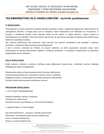 TELEMARKETING DLA HANDLOWCÓW - techniki podstawowe O SZKOLENIU: Telemarketing to bardzo skuteczne narzędzie aktywnej sprzedaży i jedna z najbardziej efektywnych metod dotarcia do potencjalnych klientów. Z drugiej strony jest to narzędzie często niedoceniane lub traktowane po macoszemu. A przecież w dzisiejszym świecie, kiedy wszystko dzieje się tak szybko, to często pierwszy i jedyny sposób na skontaktowanie się z klientem. Może się przecież zdarzyć tak, że cały proces sprzedaży prowadzony jest właśnie przez telefon bez osobistego kontaktu. Aby rozmowa telefoniczna była skuteczna, warto kierować się pewnymi standardami oraz pamiętać o pewnych technikach i narzędziach które podnoszą naszą efektywność. A jaki to techniki, dowiedzą się Państwo na naszym szkoleniu, na które zapraszamy wszystkie osoby, które wykorzystują lub planują wykorzystanie telefonu w aktywnej sprzedaży i w kontaktach nastawionych na budowanie długotrwałych relacji z klientami. CELE SZKOLENIA: Dzięki naszemu szkoleniu, uczestnicy podniosą swoją efektywność swojej pracy z telefonem poprzez realizację następujących celów szczegółowych: Rozszerzenie wiedzy na temat narzędzi kontroli rozmowy telefonicznej Praktyczne sprawdzenie się w sytuacjach trudnych w pracy z telefonem Pogłębienie wiedzy na temat zasad komunikacji werbalnej i niewerbalnej Poznanie zasad opracowywania scenariuszy rozmowy PROGRAM SZKOLENIA: 1. CO TO JEST TELEMARKETING Rodzaje marketingu: aktywny i reaktywny Telesprzedaż i telepromocja Schemat rozmowy przychodzącej vs. rozmowa przychodząca 2. ZASADY PRACY Z TELEFONEM Lęk przed dzwonieniem - przyczyny i sposoby pokonywania Planowanie i formułowanie celów rozmowy telefonicznej Czas w rozmowie telefonicznej Zmysły w rozmowie telefonicznej B&O NAVIGATOR Firma Szkoleniowa Sp. z o.o. ul. Czarnocińska 31 03-110 Warszawa, tel. 22 877 38 43/44/47 email:[email protected] www.bonavigator.pl NIP:527-24-12-682 KRS:0000171497 Zarejestrowana w Sądzie Rejonowym dla m.st Warszawy w Warszawie XIII wydział Gospodarczy KRS 3. NAWIĄZANIE ROZMOWY - ZADBAJ O SUKCES OD SAMEGO POCZĄTKU Otwarcie i jego rola w rozmowie telefonicznej "Pierwsze Dobre Wrażenie" Sposoby na debiutowe zagrywki klientów: "Nie mam czasu", "Nie jestem zainteresowany" itp. 4. SAVOIR-VIVRE W ROZMOWIE TELEFONICZNEJ Ustalanie kto dzwoni Poproszenie klienta o zaczekanie przy telefonie Przełączanie do osób trzecich - unikanie usprawiedliwiania się Zostawianie wiadomości 5. NARZĘDZIA KONTROLI ROZMOWY - PRZEJMOWANIE INICJATYWY W ROZMOWIE Pozostałe etapy rozmowy telefonicznej - kluczowe elementy Słuchając słyszeć - czyli aktywne słuchanie w praktyce Lejek pytań - technika "oPoM" Mowa ciała w pracy z telefonem - jest czy jej nie ma? Komunikacja werbalna jako metoda budowania kompetencji i wiarygodności Świadomy wpływ na klimat rozmowy - odzwierciedlanie, dobór słów, parafraza i inne sztuczki Język prokliencki - zwroty zakazane i pożądane w sprzedaży przez telefon TRENER: Anna Ritter Trener praktyk, z wykształcenia psycholog społeczny ze specjalizacją psychologia biznesu. Ekspert z ponad 15 letnim doświadczeniem managerskim w zakresie sprzedaży, negocjacji, zarządzania zespołami pracowniczymi w branży farmaceutycznej i FMCG. Karierę zawodową rozpoczęła w 1999 roku firmie Diageo Polska, gdzie w ciągu pięciu lat przeszła wszystkie szczeble kariery, zostając ostatecznie managerem średniego szczebla w dziale HoReCa, gdzie odpowiadała za pozyskiwanie i negocjowanie kontraktów ze strategicznymi klientami firmy oraz zarządzała zespołem przedstawicieli handlowych. W 2008 roku rozpoczęła pracę w firmie Biofarm na stanowisku Przedstawiciela Medycznego w dziale RX, gdzie z czasem, już jako Kierownik Sprzedaży odpowiadała za opracowanie krótko i długoterminowych strategii sprzedaży leków ze specjalistycznej linii neurologiczno-psychiatrycznej. Zarządzając zespołem przedstawicieli medycznych wyznaczała i monitorowała realizację celów handlowych. W latach 2013-2015 pracowała jako Regionalny Dyrektor Sprzedaży w Farmacol SA. Była odpowiedzialna za sprawne funkcjonowanie działów sprzedaży oraz negocjacje umów handlowych z ogólnopolskimi sieciami aptek. B&O NAVIGATOR Firma Szkoleniowa Sp. z o.o. ul. Czarnocińska 31 03-110 Warszawa, tel. 22 877 38 43/44/47 email:[email protected] www.bonavigator.pl NIP:527-24-12-682 KRS:0000171497 Zarejestrowana w Sądzie Rejonowym dla m.st Warszawy w Warszawie XIII wydział Gospodarczy KRS Obecnie pracuje jako Dyrektor Generalny w firmie Pharma Vitae i jest odpowiedzialna za sprawne funkcjonowanie i rozwój firmy. Absolwentka Szkoły Wyższej Psychologii Społecznej w Warszawie (SWPS) ze specjalizacją psychologia społeczna, podspecjalizacja psychologia biznesu. Swoją pracę magisterską poświęciła metodom wywierania wpływu badając determinaty przekazów merytorycznych do leków RX w oparciu o strukturę stylów zachowań społecznych D. Merill Kontynuuje studia podyplomowe na Uniwersytecie SWPS na kierunkach Psychologia działań managerskich oraz psychologia transportu oraz bezpieczeństwa ruchu drogowego. Trener współpracujący B&O NAVIGATOR Firma Szkoleniowa. Za swój największy sukces zawodowy uważa nieustanny rozwój i możliwość ciągłego podnoszenia kwalifikacji – każdorazowo zmiana pracy dawała jej szansę wejścia na kolejny szczebel kariery. Prywatnie entuzjastka nurkowania, jazdy na motocyklu i podróżniczka. B&O NAVIGATOR Firma Szkoleniowa Sp. z o.o. ul. Czarnocińska 31 03-110 Warszawa, tel. 22 877 38 43/44/47 email:[email protected] www.bonavigator.pl NIP:527-24-12-682 KRS:0000171497 Zarejestrowana w Sądzie Rejonowym dla m.st Warszawy w Warszawie XIII wydział Gospodarczy KRS