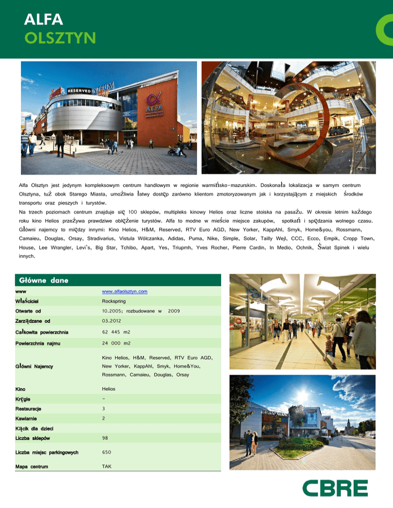 ALFA OLSZTYN Alfa Olsztyn jest jedynym kompleksowym centrum handlowym w regionie warmińsko-mazurskim. Doskonała lokalizacja w samym centrum Olsztyna, tuż obok Starego Miasta, umożliwia łatwy dostęp zarówno klientom zmotoryzowanym jak i korzystającym z miejskich środków transportu oraz pieszych i turystów. Na trzech poziomach centrum znajduje się 100 sklepów, multipleks kinowy Helios oraz liczne stoiska na pasażu. W okresie letnim każdego roku kino Helios przeżywa prawdziwe oblężenie turystów. Alfa to modne w mieście miejsce zakupów, spotkań i spędzania wolnego czasu. Główni najemcy to między innymi: Kino Helios, H&M, Reserved, RTV Euro AGD, New Yorker, KappAhl, Smyk, Home&you, Rossmann, Camaieu, Douglas, Orsay, Stradivarius, Vistula Wólczanka, Adidas, Puma, Nike, Simple, Solar, Tailly Wejl, CCC, Ecco, Empik, Cropp Town, House, Lee Wrangler, Levi’s, Big Star, Tchibo, Apart, Yes, Triupmh, Yves Rocher, Pierre Cardin, In Medio, Ochnik, Świat Spinek i wielu innych. Główne dane www Właściciel Otwarte od Zarządzane od www.alfaolsztyn.com Rockspring 10.2005; rozbudowane w 2009 03.2012 Całkowita powierzchnia 62 445 m2 Powierzchnia najmu 24 000 m2 Główni Najemcy Kino Helios, H&M, Reserved, RTV Euro AGD, New Yorker, KappAhl, Smyk, Home&You, Rossmann, Camaieu, Douglas, Orsay Kino Kręgle Restauracje Kawiarnie Kącik dla dzieci Liczba sklepów Helios 3 2 Liczba miejsc parkingowych 650 Mapa centrum TAK 98