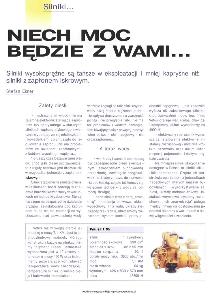 Silniki... NIECH MOC BĘDZIE Z WAMI... Silniki wysokoprężne są tańsze w eksploatacji i mniej kapryśne niż silniki z zapłonem iskrowym. Stefan Ekner Zalety diesli: • niestraszna im wilgoć - nie ma tajemnej elektroniki sterującej zapłonem czy spotykanego w starszych silnikach zapłonu stykowego z wiecznie wypalającym się młoteczkiem i kowadełkiem, co zmuszało do regulowania zapłonu, nic ma problemów ze świecami zapłonowymi, z kablami wysokiego napięcia... * dłuższy czas bezawaryjnej pracy, choć jeśli diesel już zawiedzie, to z reguły naprawa jest droższa niż w przypadku jednostki z zapłonem iskrowym. Silniki stacjonarne zainstalowane w kadłubach łodzi pracują w zna cznie bardziej komfortowych warunkach niż jednostki zaburtowe. Nie są narażone na bezpośrednie działanie bryzgów; zainstalowana pod kadłubem śruba nie ma tendencji do wychodzenia nad powierzchnię wody Vetus ma w swojej ofercie jednostkę o mocy 7,1 KM. Jest to jednocylindrowy motorek, którego konstrukcja bazuje na silnikach firmy Farymann Diesel. Jednostka wyposażona jest w 12-voltowy alternator o mocy 160 W oraz instrumenty pozwalające kontrolować temperaturę wody chłodzącej, temperaturę silnika, ciśnienie oleju i ładowanie akumulatora. w czasie żeglugi na fali; silnik usytuowany bliżej środka ciężkości jachtu nie wpływa drastycznie na zwrotność jachtu i nie przeglębia rufy; nie ma też problemów z wiotkim pantografom kiwającym się z pawężą, niezbyt lotne paliwo - olej napędowy - nie grozi zapłonem... A teraz wady: • wał śruby i sama śruba muszą być zabezpieczone przed ewentualnym uszkodzeniem o podwodną przeszkodę, nawinięcie czegokolwiek na śrubę zmusza do nurkowania pod łodzią, często też kończy się wyjęciem jednostki z wody za pomocą dźwigu; * cena silnika wraz z całą „armaturą" - instalacja paliwowa, układ wydechowy, linia wału, układy sterujące przekładnią, obrotami czy rozruchem, system kontroli pracy je- VetusF 1.03 silnik 1 cylindrowy pojemność skokowa 290 cm3 średnica x skok 82 x 55 mm stopień sprężania 20: 1 obroty mocy rnax. 3600 obr./min moc 7,1 KM masa własna 64 kg wymiary** 426 x 530 x 670 mm cena 15800 zł Archiwum magazynu Rejs http://kormoran.aplus.pl dnostki napędowej - jest znacznie wyższa niż zaburtowego silnika o porównywalnej rnocy; (np. firma Vetus oferuje wał, śrubę, dławicę i kompletny układ wydechowy za 4990 zł). • elektryczny rozrusznik wymusza zainstalowanie efektywnej instalacji rozruchowej - możliwie krótkie przewody oraz akumulator o sporej pojemności i dużym prądzie zwarcia. Najmniejsze silniki stacjonarne dostępne w Polsce to silniki kilkui kilkunastokonne. Często ich konstrukcja oparta jest na jednostkach napędowych małych maszyn budowlanych wykorzystywane są bloki, układy korbowo-tlokowe, instalacje wtryskowe, systemy rozruchowe... Ich „marynizacja" polega między innymi na dostosowaniu jednostki do pracy w warunkach o dużej wilgotności i zasoleniu. Lombardini LDW 502 M silnik 2-cylindrowy pojemność skokowa 505 cm3 średnica x skok 72 x 62 mm stopień sprężania 22,3: 1 obroty mocy max. 3600 obr./rnin moc 11 KM alternator V/A masa 75 kg wymiary** 486 x 430 x 564 mm cena 16950 zt Vetus M 2C5 silnik 2-cylindrowy pojemność skokowa 464 cm3 średnica x skok 65 x 70 mm stopień sprężania 23: 1 obroty mocy max. 3600 obr./min moc 11 KM alternator 12 V/40 A masa 98 kg wymiary**" 500 x 494 x 607 min cena 18500 zł Archiwum magazynu Rejs http://kormoran.aplus.pl Volvo Penta MD 2010 silnik 2-cylindrowy pojemność skokowa 450 cm3 średnica x skok mm stopień sprężania brak danych obroty mocy max. 3600 obr./min moc 10 KM alternator 14V/60A masa* 114-128 kg wymiary** 520 x 447 x 692 mm cena 21818 zł Yanmar silnik 1 cylindrowy pojemność skokowa 318 cm3 średnica x skok 75 x 72 mm stopień sprężania brak danych obroty mocy max. 3600 obr./min moc 9,1 KM alternator 12 V/35 A masa 76 kg wymiary** 485 x 420 x 696 mm cena 16300zt Fotografia przedstawia silnik z przekładnią typu „Z" *zależnie od przekładni ** wysokość x szerokość x długość Archiwum magazynu Rejs http://kormoran.aplus.pl