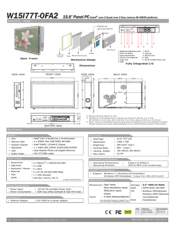 W15I77T-OFA2 15.6" Panel PC (Intel R core 2 Quad/core 2 Duo/celeron M+GM45 platform) Design Mechanical MODEL #: R15I77T-OFA1 Storage (HDD/CF) USB USB USB USB RJ45 RJ45 RS232 VR VGA RS232 RS232 RS232 PS2 DC IN PS2 Audio SBC Board 1 Back Cover Touch/Glass (Optional) Panel Metal Frame Housing Open Frame Mechanical design FRONT VIEW 8 11 10 1. Brightness Adjustment Knob 7. RJ-45 2. Power On Button 8. VGA Out 3. Power Reset Button 9. RS-232 Conn. 4. RS-232 Conn.(Optional) 10. PS/2 5. Audio Jack 11. DC-IN Lockable Power Jack 6. USB Fully Integrated I/O Dimensions SIDE VIEW 9 7 6 4 2 Inverter 5 3 SIDE VIEW BACK VIEW Measurements shown in mm * Tolerance dimensions is shown as follow 0~30 mm ± 0.1 mm, * 30~50 mmof±all0.15 mm, 50~120 mm ± 0.2 mm, above 120 mm ± 0.25 mm Note: this is a simplified drawing and some components are not marked in detail. * Please contact our sales representative if you need further product information. BOTTOM VIEW Specifications System : Panel Spec : CPU R : Intel Core 2 Quad/Core 2 DuoProcessor Size/Type : 15.6" TFT LCD Memory Slot : 2 x DIMM, Max 4GB DDR2 667/800 Resolutions : 1366 x 768 System Chipset : IntelR GM45 / ICH9M-E Chipset Brightness 2 : 300 cd/m (typ.) IDE/SATA : 1 x 44pin IDE (UDMA 33/66/100)/2XSATA Contrast Ratio : 500 : 1(typ.) LAN : Dual Realtek RTL8111B Gigabit Ethernet Viewing Angles : -85~85(H);-80~80(V) Audio Codec : VIA VT1708A codec Max Colors : 16.7M Input / Output : Environment Considerations : Serial Ports : 2 x RS232, 1 x RS232/422/485 USB Ports : 4 x USB Keyboard / Mouse : 2 x PS/2 Ethernet VGA Audio : 2 x RJ 45-10/100/1000 Mbps : 1 x VGA (female) : Line-Out, Line-In, Mic in Power Specifications : : 12V DC IN (Lockable Power Jack) : 82W (typ.)(Max.backlight & high CPU load) : : 0 deg.C to 50deg.C 30% to 90% (non condensing) OS BSP / Driver Support : Support Default setting:RS232 Power Input Power Consumption Operating Temperature Operating Humidity Windows 7 / Windows XP Embedded / Windows XPP Embedded / Linux 2.6 / Win CE 5.0,6.0 Order Options : Mechanical : Open Frame Panel Mount(5mm bezel) IP65(10mm bezel) Storage : 3.5" HDD/CF/Both RAM : DIMM DDR2 667/800 OS : Windows XPE(Optional) Chassis Touch Accessori es : Externa l Adapter : 110~230V Ac-in power adapter Windows XPPE (Optional) : 5 Wires Resistive(Optional) (A customized housing is needed if you have demands of SAW/IR/IT/SC touch) Linux(Optional) DVD : Yes(Optional) Rev. 1.0 1.1 Note: All Specifications are subject to change without prior notice! Reasons First release Spec change Revised Date Dec-31-10 Jan-16-13 Revised Date:01/16/2013