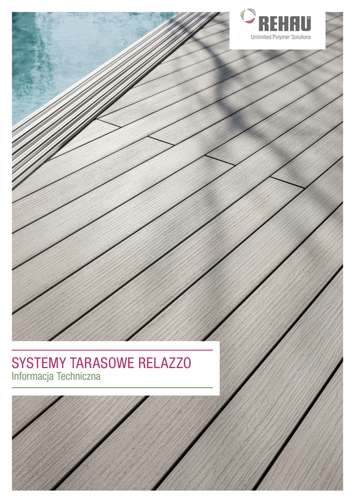 SYSTEMY TARASOWE RELAZZO Informacja Techniczna Niniejsza Informacja Techniczna „Systemy tarasowe RELAZZO“ obowiązuje od stycznia 2016 r. Z chwilą ukazania się niniejszej Informacji Technicznej dotychczasowa Informacja Techniczna R20600 (stan ze stycznia 2014 r.) oraz R20675 (stan z maja 2015 r.) tracą ważność. Aktualna Dokumentacja Techniczna jest dostępna pod adresem www.rehau.pl/relazzo. 2 Niniejszy dokument jest chroniony prawem autorskim. Powstałe w ten sposób prawa, w szczególności prawo do tłumaczenia, przedruku, korzystania z ilustracji, transmisji radiowej, powielania metodą fotomechaniczną lub inną oraz zapisywania danych w formie elektronicznej, są zastrzeżone. Wszystkie wymiary i informacje o wadze stanowią wartości orientacyjne. Zastrzega się możliwość wprowadzania zmian technicznych oraz występowania pomyłek. ZAWARTOŚĆ 1 1.1 1.2 1.3 Informacje ogólne Zakres obowiązywania Zakres stosowania Ekologia i ekonomia 4 4 4 4 2 Informacje o produkcie 2.1 Opis produktu 2.2 Wymiary i dopuszczalne tolerancje 2.3 Właściwości powierzchni 2.4Kolorystyka 2.5 Właściwości termiczne 2.6 Właściwości chemiczne 2.7 Właściwości fizyczne 2.8Bezpieczeństwo 6 6 7 7 8 9 9 9 10 3 Wskazówki praktyczne 3.1Konserwacja 3.2 Wskazówki dotyczące pielęgnacji 3.3 Wskazówki dotyczące obróbki i montażu 3.4 Magazynowanie i użytkowanie 11 11 11 12 14 3 1 INFORMACJE OGÓLNE 1.1 Zakres obowiązywania Niniejsza Informacja Techniczna dotyczy systemów tarasowych RELAZZO firmy REHAU, składających się z desek, legarów i pozostałych elementów wchodzących w skład systemu. Informacje dotyczące montażu zawarte są w Instrukcji Montażu. 1.2 1.3 Ekologia i ekonomia Mając na względzie zasady zrównoważonej gospodarki surowcami, deski RELAZZO skonstruowano w taki sposób, że nadają się one w całości do recyclingu. Systemy tarasowe RELAZZO posiadają certyfikaty FSC i PEFC, czym REHAU podkreśla swoje odpowiedzialne podejście do środowiska i zasobów naturalnych. Zakres stosowania Deski tarasowe RELAZZO, legary oraz wszystkie elementy systemu zostały skonstruowane z myślą o budowie tarasu. Produkty nie nadają się (z uwagi na brak odpowiednich atestów) do stosowania jako konstrukcja samonośna. Należy przestrzegać obowiązujących lokalnych przepisów budowlanych. W przypadku zastosowania np. na balkonach lub kładkach należy zadbać o właściwe przygotowanie podłoża pod względem statycznym i w razie potrzeby zastosować konstrukcję stalową (np. kratę) z niewielkimi odstępami między legarami. Ze względu na to, że w ponad 50% składają się z drewna, deski i legary RELAZZO z kompozytu WPC kwalifikuje się do kategorii A IV zgodnie z niemieckim rozporządzeniem o wymogach w zakresie wykorzystania i usuwania odpadów drewnianych i traktuje jako biomasę. Należy przy tym uwzględnić lokalne przepisy dotyczące usuwania odpadów. Dzięki nieporównywalnie większej trwałości i niemal brakowi potrzeby czyszczenia deski tarasowe RELAZZO stanowią w dłuższej perspektywie rozwiązanie znacznie bardziej ekonomiczne niż tradycyjne drewno. Systemy tarasowe RELAZZO spełniają wymagania normy DIN CEN/TS 15083-01 „Trwałość drewna i wyrobów drewnianych – określanie naturalnej odporności pełnego drewna na działanie grzybów niszczących drewno“ w najwyższej klasie odporności 1 (bardzo odporne). Wspólnie ze Stowarzyszeniem Niemieckiego Przemysłu Drzewnego (VHI) angażujemy się w zrównoważone budownictwo, składając w Instytucie Budownictwa Środowiska (Institut Bauen und Umwelt e.V. (IBU)) Środowiskową Deklarację Produktu (EPD) dla desek tarasowych i elementów fasadowych z WPC. Pierwsza na świecie deklaracja EPD dotycząca elementów fasadowych i desek tarasowych z kompozytu drewna i polimerów została przygotowana we współpracy z IBU. 4 Środowiskowa Deklaracja Produktu EPD stanowi podstawę dla ekologicznej oceny budynku zgodnie z normą DIN EN 15978 „Zrównoważone obiekty budowlane - Ocena środowiskowych właściwości użytkowych budynków - Metoda obliczania“. Deklaracja opiera się na normach międzynarodowych (ISO 14025; ISO 14040 i nast.) i służy udokumentowaniu wpływu produktów budowlanych na środowisko w ramach zamówień publicznych. Deklaracja EPD zawiera informacje dotyczące wpływu produktów na środowisko (zużycie zasobów, emisje, efekt cieplarniany, niszczenie warstwy ozonowej, zakwaszenie gleby i wody, wykorzystanie paliw kopalnych, wykorzystanie zasobów mineralnych). 5 2 INFORMACJE O PRODUKCIE 2.1 Opis produktu Poszczególne deski tarasowe mocowane są w przypadku legarów z WPC przy pomocy opracowanego specjalnie w tym celu systemu klipsów ze stali nierdzewnej (V4A), a w przypadku legarów z aluminium z zastosowaniem systemu szybkiego układania wykonanego z tworzywa wzmacnianego włóknem szklanym. Odpowiednio dobrane elementy gwarantują prosty i szybki montaż oraz stabilność konstrukcji. Ponadto poszczególne deski można demontować i ponownie montować. Deski tarasowe RELAZZO oraz legary z WPC wykonane są z wysokiej jakości tworzywa sztucznego i min. 50% włókien drewna pozyskiwanego z lasów europejskich, prowadzących zrównoważoną gospodarkę leśną. Takie połączenie drewna i polimerów zwane jest kompozytem drewniano-polimerowym (Wood-Polymer-Composite, w skrócie WPC). Technologia produkcji kompozytu WPC opracowana przez REHAU pozwala doskonale łączyć pozytywne właściwości drewna i tworzyw sztucznych. Przy doskonałych parametrach mechanicznych deska charakteryzuje się naturalnym wyglądem i jest przyjemny w dotyku. Specjalnie opracowane technologie uszlachetniania powierzchni, takie jak szczotkowanie czy przetłaczanie, pozwalają uzyskać taras o naturalnym charakterze. W porównaniu z tarasami drewnianymi przewaga desek tarasowych z WPC polega m.in. na łatwości czyszczenia i konserwacji, dłuższej żywotność oraz niezmienności wymiarów. Deski 