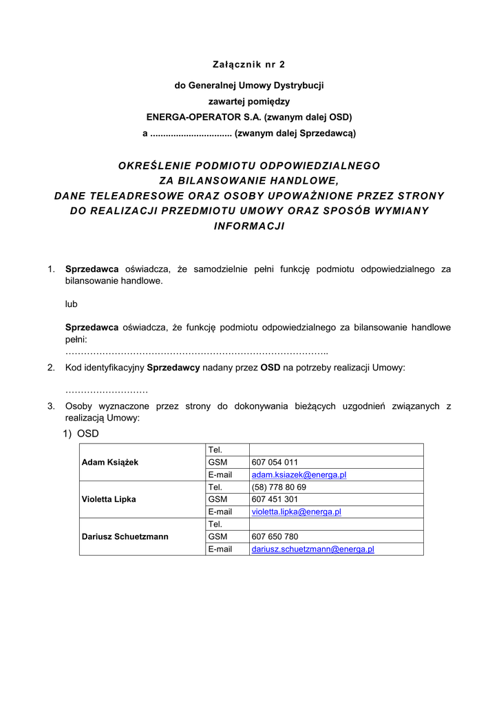 Załącznik nr 2 do Generalnej Umowy Dystrybucji zawartej pomiędzy ENERGA-OPERATOR S.A. (zwanym dalej OSD) a ................................ (zwanym dalej Sprzedawcą) OKREŚLENIE PODMIOTU ODPOWIEDZIALNEGO ZA BILANSOWANIE HANDLOWE, DANE TELEADRESOWE ORAZ OSOBY UPOWAŻNIONE PRZEZ STRONY DO REALIZACJI PRZEDMIOTU UMOWY ORAZ SPOSÓB WYMIANY INFORMACJI 1. Sprzedawca oświadcza, że samodzielnie pełni funkcję podmiotu odpowiedzialnego za bilansowanie handlowe. lub Sprzedawca oświadcza, że funkcję podmiotu odpowiedzialnego za bilansowanie handlowe pełni: ………………………………………………………………………….. 2. Kod identyfikacyjny Sprzedawcy nadany przez OSD na potrzeby realizacji Umowy: ……………………… 3. Osoby wyznaczone przez strony do dokonywania bieżących uzgodnień związanych z realizacją Umowy: 1) OSD Adam Książek Violetta Lipka Dariusz Schuetzmann Tel. GSM E-mail Tel. GSM E-mail Tel. GSM E-mail 607 054 011 [email protected] (58) 778 80 69 607 451 301 [email protected] 607 650 780 [email protected] 2) Sprzedawca 4. Porządek przekazywania przez Sprzedawcę danych do OSD: Lp. Zakres przekazywanych danych Termin przekazywania danych 1. Prognozy sprzedaży energii elektrycznej, dla okresów uzgodnionych przez OSD i Sprzedawcę W zależności od potrzeb 2. Nieprawidłowości dotyczące danych pomiarowych Do 13 miesięcy następujących po dobie, której nieprawidłowość dotyczy 5. Porządek udostępniania Sprzedawcy danych przez OSD: Lp. Zakres przekazywanych danych 6. Termin przekazywania danych 1. Udostępnienie danych pomiarowych dla URD profilowych przez Platformę Wymiany Informacji Zgodnie z harmonogramem odczytów OSD w formatach csv lub xml 2. Udostępnienie danych pomiarowych dla URD grafikowych ze zdalnym odczytem przez Zgodnie z harmonogramem odczytów OSD Platformę Wymiany Informacji w formatach csv lub xml Dane kontaktowe osób przekazujących i otrzymujących dane oraz raporty: 1) OSD (wysyłający raporty) Krzysztof Profis Marcin Rynkiewicz Waldemar Zakrzewski Tel Fax E-mail Tel Fax E-mail Tel Fax E-mail (58) 778 80 70 (58) 347 38 09 [email protected] (58) 778 80 71 (58) 347 38 09 [email protected] (58) 778 80 85 (58) 347 38 09 [email protected] 2) Sprzedawca (otrzymujący raporty) 7. Wykaz osób uprawnionych do reprezentowania Sprzedawcy w zakresie dokonywania zgłoszeń zmiany Sprzedawcy w Systemie Obsługi Uczestników Rynku Detalicznego: 8. Wykaz osób uprawnionych do reprezentowania Sprzedawcy w zakresie zgłaszania wniosków o wstrzymanie i wznowienie dostarczania energii elektrycznej URD 9. W sytuacjach wystąpienia awarii systemów informatycznych SOURD i PWI (trwających dłużej niż 5 dni roboczych) dopuszcza się alternatywne formy wymiany informacji: 1) w przypadku zgłaszania zawartych przez Sprzedawcę umów przez przesłanie do OSD w wersji papierowej podpisanego zgłoszenia zawierającego dane wymienione w załączniku nr 3, 2) w przypadku udostępniania danych pomiarowo-rozliczeniowych przez przesłanie ich na wskazany adres e-mail Sprzedawcy.