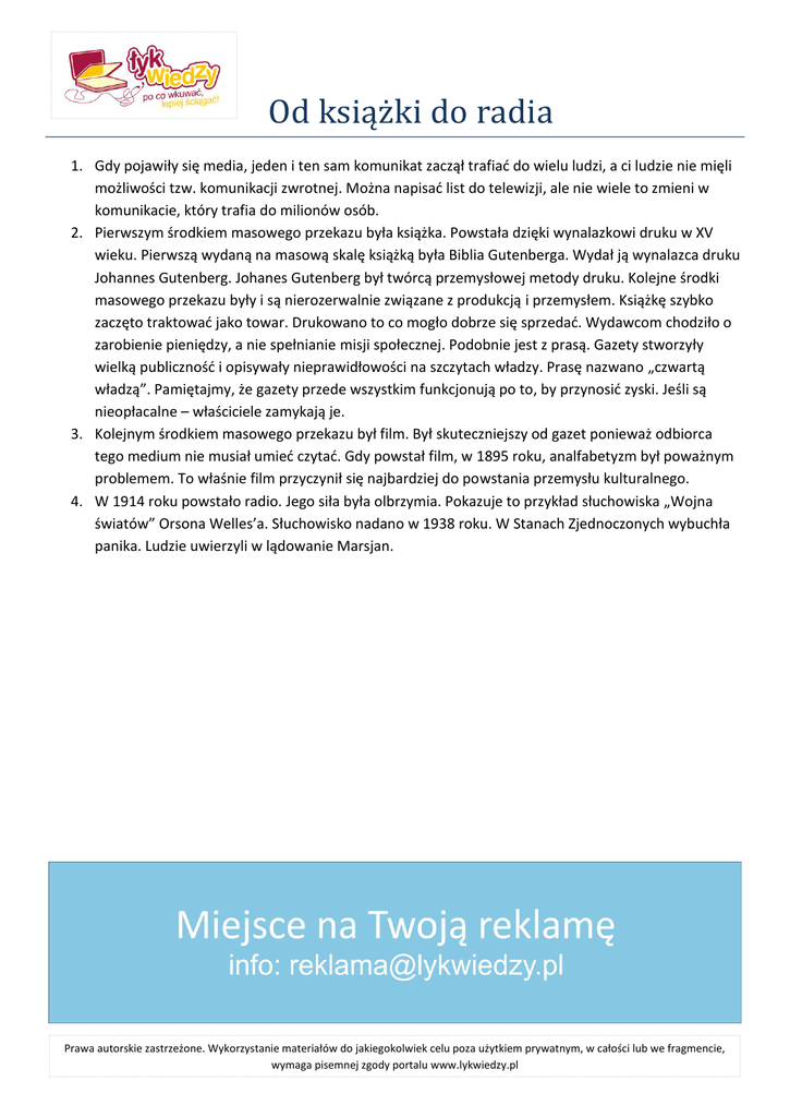 Od książki do radia 1. Gdy pojawiły się media, jeden i ten sam komunikat zaczął trafiad do wielu ludzi, a ci ludzie nie mięli możliwości tzw. komunikacji zwrotnej. Można napisad list do telewizji, ale nie wiele to zmieni w komunikacie, który trafia do milionów osób. 2. Pierwszym środkiem masowego przekazu była książka. Powstała dzięki wynalazkowi druku w XV wieku. Pierwszą wydaną na masową skalę książką była Biblia Gutenberga. Wydał ją wynalazca druku Johannes Gutenberg. Johanes Gutenberg był twórcą przemysłowej metody druku. Kolejne środki masowego przekazu były i są nierozerwalnie związane z produkcją i przemysłem. Książkę szybko zaczęto traktowad jako towar. Drukowano to co mogło dobrze się sprzedad. Wydawcom chodziło o zarobienie pieniędzy, a nie spełnianie misji społecznej. Podobnie jest z prasą. Gazety stworzyły wielką publicznośd i opisywały nieprawidłowości na szczytach władzy. Prasę nazwano „czwartą władzą”. Pamiętajmy, że gazety przede wszystkim funkcjonują po to, by przynosid zyski. Jeśli są nieopłacalne – właściciele zamykają je. 3. Kolejnym środkiem masowego przekazu był film. Był skuteczniejszy od gazet ponieważ odbiorca tego medium nie musiał umied czytad. Gdy powstał film, w 1895 roku, analfabetyzm był poważnym problemem. To właśnie film przyczynił się najbardziej do powstania przemysłu kulturalnego. 4. W 1914 roku powstało radio. Jego siła była olbrzymia. Pokazuje to przykład słuchowiska „Wojna światów” Orsona Welles’a. Słuchowisko nadano w 1938 roku. W Stanach Zjednoczonych wybuchła panika. Ludzie uwierzyli w lądowanie Marsjan. Prawa autorskie zastrzeżone. Wykorzystanie materiałów do jakiegokolwiek celu poza użytkiem prywatnym, w całości lub we fragmencie, wymaga pisemnej zgody portalu www.lykwiedzy.pl