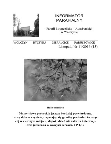 INFORMATOR PARAFIALNY Parafii Ewangelicko – Augsburskiej w Wołczynie WOŁCZYN BYCZYNA GIERAŁCICE PARUSZOWICE Listopad, Nr 11/2016 (13) Hasło miesiąca Mamy słowo prorockie jeszcze bardziej potwierdzone, a wy dobrze czynicie, trzymając się go niby pochodni, świecącej w ciemnym miejscu, dopóki dzień nie zaświta i nie wzejdzie jutrzenka w waszych sercach. 2 P 1,19 Parafia Ewangelicko-Augsburska w Wołczynie (Wołczyn, Byczyna, Gierałcice, Paruszowice) Pl. Wolności 5, 46-250 Wołczyn Nr konta: 51 88760009 0000 1788 2000 0001 Kontakt: [email protected] Tel.: (77) 414 52 77 Duchowny: Proboszcz: ks. Sebastian Olencki e-mail: [email protected] kom. 533 759 399 Adresy kościołów: Kościół Ewangelicki w Wołczynie – ul. Byczyńska 6. Kościół Ewangelicki w Byczynie – Plac Wolności 1. Kościół Ewangelicki w Gierałcicach – Gierałcice 68a. Kościół Ewangelicki w Paruszowicach – Paruszowice 1 strona internetowa: www.wolczyn.luteranie.pl Słowo od Duszpasterza Mamy słowo prorockie jeszcze bardziej potwierdzone, a wy dobrze czynicie, trzymając się go niby pochodni, świecącej w ciemnym miejscu, dopóki dzień nie zaświta i nie wzejdzie jutrzenka w waszych sercach. 2 P 1,19 Powoli zbliżamy się do końca roku kościelnego, który kończy się Niedzielą Wieczności. Jak podchodzimy do spraw wieczności? Czy święto zmarłych, które przypada na początku listopada jest tak samo rozumiane przez nas, jak w innych wyznaniach chrześcijańskich? Czy jest okresem tylko wspominkowym? Jak wygląda nasze podejście i nasza tradycja? Przede wszystkim wspominamy, modlimy się do Boga dziękując za życie tych, którzy odeszli przed nami. Nie wierzymy w moc zmarłych, lecz w moc śmierci, która zostanie zniszczona jako ostania przez Chrystusa. Nie bez powodu ks. Marcin Luter wywiesza swoje tezy 31 października, w przeddzień święta zmarłych. Czy prowokuje? Myślę, że tak. Zwróćmy naszą uwagę na słowa Pisma Świętego. W 1 liście do Tymoteusza czytamy słowa Apostoła Pawła „Jeden jest Bóg, jeden też pośrednik między Bogiem a ludźmi, człowiek Chrystus Jezus. Który siebie samego złożył jako okup za wszystkich, aby o tym świadczono we właściwym czasie”. W Ewangelii Łukasza (16, 19-31) Jezus przytacza podobieństwo o bogaczu i Łazarzu, w którym czytamy „Synu, pomnij, że dobro swoje otrzymałeś za swojego życia, podobnie jak Łazarz zło; teraz on tutaj doznaje pociechy, a ty męki cierpisz. I poza tym wszystkim między nami a wami rozciąga się wielka przepaść, aby ci, którzy chcą stąd do was przejść, nie mogli, ani też stamtąd do nas nie mogli się przeprawić”. Dla nas zbawienie już się dokonało, nie musimy walczyć o coś czego nie jesteśmy w stanie sami zdobyć. Jeśli dzisiaj usłyszę głos Jego jestem zbawiony i będę żył wiecznie. Nie jestem w stanie przewidzieć jaka będzie przyszłość i wieczność. Zbawienie dokonuje się teraz i jest ono darem danym wszystkim ludziom. Więc moim zadaniem jako człowieka zbawionego jest głosić ewangelię i żyć według jej zasad. To z mojej wiary wynikają uczynki, to z wiary wynika zbawienie. Bóg oczekuje od nas wzajemnej wspólnoty i miłości. Ks. Sebastian Olencki Kącik dla dzieci DOLINA CHARIS 13. Chochlik Do miasteczka przybył chochlik Mieć. Był tak mały jak stworzenia z Doliny Charis, ale miał złe samolubne serce. Mieszkańcy miasteczka go nie zauważyli, a jednak robili dokładnie to, co on chciał. Każdemu mieszkańcowi miasteczka chochlik szeptał na ucho: Ja chcę mieć, ja chcę mieć… i w ten sposób mili i życzliwi mieszkańcy stawali się samolubni i chciwi. Dzieci chciały tylko coraz nowsze i piękniejsze zabawki, kobiety chciały coraz to piękniejsze sukienki i meble, a mężczyźni budowali coraz to większe domy, które wzbudzałyby zazdrość sąsiada. W stajniach każdy miał coraz więcej koni, a powozy którymi jeździli przypominały królewskie karety. Miasteczko wydawało się być coraz bogatsze i piękniejsze, tylko że nikt w tym miasteczku nie był szczęśliwy. Stworzenia z Doliny Charis jak co dzień wzbiły się w górę na swych kolorowych skrzydełkach aby rozejrzeć się po okolicy. To co zastały w miasteczku je zdruzgotało. Co z tego, że miasteczko było piękne, kiedy wszyscy się kłócili, bo każdy chciał mieć najwięcej, najpiękniej i najlepiej dla samego siebie. Stworzenia zobaczyły świętującego chochlika Mieć, który w konarach drzewa urządził sobie wielką ucztę. - Co ty tu robisz? – zawoła Pierwiosnek - Ja, świętuję. Spójrz jak tu cudownie, każdy jest chciwy i myśli tylko o sobie, tak jak ja, czy to nie jest pięknie? – Odpowiedział chochlik z miną wielkiego triumfu. - To nie jest pięknie chochliku, to jest okropne i nie myśl sobie, że pozwolimy tobie na takie gierki… Chochlik skulił głowę i udawał, że jest mu przykro lecz Pierwiosnek dokładnie wiedział, co kryje się w jego sercu. Chochlik widząc, że świetna zabawa się skończyła, zabrał swoje rzeczy i odszedł z miasteczka, a co z jego mieszkańcami? Ludzie przez jakiś czas powtarzali podszepty chochlika Mieć, aż zauważyli, że posiadanie coraz większej ilości rzeczy wcale nie dało im radości i szczęścia. I tak przestali myśleć o tym aby mieć, a zaczęli myśleć o tym aby być dobrą siostrą, dobrym bratem, dobrym kolegą, dobrą mamą i dobrym tatą. Nie gromadźcie sobie skarbów na ziemi, gdzie je mól i rdza niszczą i gdzie złodzieje podkopują i kradną; ale gromadźcie skarby w niebie, gdzie ani mól, ani rdza nie niszczą i gdzie złodzieje nie podkopują i nie kradną. Albowiem gdzie jest skarb twój tam będzie i serce twoje. Mt 6,19-21 Ewa Olencka www.luteranie.wolczyn.pl MEDALIONY –KOŚCIÓŁ EWANGELICKI W BYCZYNIE FILIP MELANCHTON 1497- 1560 „Przedkładamy powyższe artykuły, w których wyłożone jest nasze wyznanie i z których poznać można główne nauki naszych nauczycieli. 