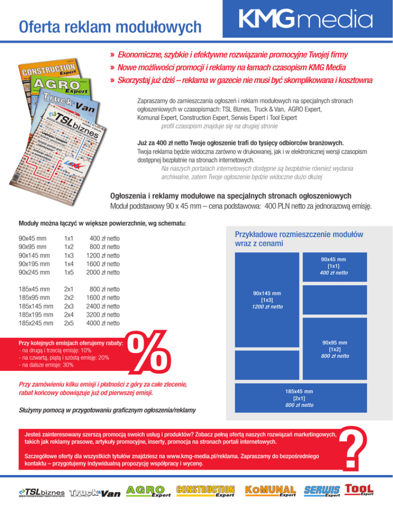 Oferta reklam modułowych KMGmedia » Ekonomiczne, szybkie i efektywne rozwiązanie promocyjne Twojej firmy » Nowe możliwości promocji i reklamy na łamach czasopism KMG Media » Skorzystaj już dziś – reklama w gazecie nie musi być skomplikowana i kosztowna Zapraszamy do zamieszczania ogłoszeń i reklam modułowych na specjalnych stronach ogłoszeniowych w czasopismach: TSL Biznes, Truck & Van, AGRO Expert, Komunal Expert, Construction Expert, Serwis Expert i Tool Expert profil czasopism znajduje się na drugiej stronie Już za 400 zł netto Twoje ogłoszenie trafi do tysięcy odbiorców branżowych. Twoja reklama będzie widoczna zarówno w drukowanej, jak i w elektronicznej wersji czasopism dostępnej bezpłatnie na stronach internetowych. Na naszych portalach internetowych dostępne są bezpłatnie również wydania archiwalne, zatem Twoje ogłoszenie będzie widoczne dużo dłużejennik Ogłoszenia i reklamy modułowe na specjalnych stronach ogłoszeniowych Moduł podstawowy 90 x 45 mm – cena podstawowa: 400 PLN netto za jednorazową emisję. Moduły można łączyć w większe powierzchnie, wg schematu: 90x45 mm 90x95 mm 90x145 mm 90x195 mm 90x245 mm 1x1 1x2 1x3 1x4 1x5 185x45 mm 185x95 mm 185x145 mm 185x195 mm 185x245 mm 2x1 2x2 2x3 2x4 2x5 Przykładowe rozmieszczenie modułów wraz z cenami 400 zł netto 800 zł netto 1200 zł netto 1600 zł netto 2000 zł netto 800 zł netto 1600 zł netto 2400 zł netto 3200 zł netto 4000 zł netto Przy kolejnych emisjach oferujemy rabaty: - na drugą i trzecią emisję: 10% - na czwartą, piątą i szóstą emisję: 20% - na dalsze emisje: 30% 90x45 mm [1x1] 400 zł netto 90x145 mm [1x3] 1200 zł netto % Przy zamówieniu kilku emisji i płatności z góry za całe zlecenie, rabat końcowy obowiązuje już od pierwszej emisji. Służymy pomocą w przygotowaniu graficznym ogłoszenia/reklamy 90x95 mm [1x2] 800 zł netto 185x45 mm [2x1] 800 zł netto Jesteś zainteresowany szerszą promocją swoich usług i produktów? Zobacz pełną ofertą naszych rozwiązań marketingowych, takich jak reklamy prasowe, artykuły promocyjne, inserty, promocja na stronach portali internetowych. Szczegółowe oferty dla wszystkich tytułów znajdziesz na www.kmg-media.pl/reklama. Zapraszamy do bezpośredniego kontaktu – przygotujemy indywidualną propozycję współpracy i wycenę. Truck&Van www.truck-van.pl ? Nasze czasopisma Ogłoszenia i reklamy modułowe na specjalnych stronach ogłoszeniowych dostępne są we wszystkich czasopismach wydawnictwa KMG Media: www.tsl-biznes.pl Miesięcznik dostarczający najważniejszych informacji i aktualnych wiadomości z całej branży logistycznej i transportowej. Czasopismo trafia do profesjonalistów związanych z transportem i logistyką: dyrektorów, kierowników i menedżerów logistyki oraz transportu w firmach sektora produkcyjnego, handlowego i dystrybucyjnego, właścicieli i kierowników firm transportowych, operatorów logistycznych i firm kurierskich, a także dostawców rozwiązań, produktów i usług dla branży TSL. Nakład 11 tys. egzemplarzy drukowanych i bezpłatna wysyłka branżowa oraz obecność podczas najważniejszych wydarzeń (targi, konferencje) zapewniają skuteczne dotarcie do wszystkich kluczowych firm i osób z sektora TSL oraz przedsiębiorców korzystających z usług tej branży. Dodatkową, dynamicznie rozwijającą się formą dotarcia jest wysyłka bezpłatnej wersji elektronicznej (on-line oraz PDF), która trafia do około 10 tys. odbiorców. Truck&Van www.truck-van.pl www.truck-van.pl Miesięcznik dostarczający kompleksowych informacji o wszystkim, co związane z transportem samochodowym. Piszemy o samochodach dostawczych, ciężarowych, specjalnych, autobusach, naczepach, zabudowach, wyposażeniu dodatkowym, ogumieniu, paliwach, olejach, systemach elektronicznych i wszystkim, co ważne dla transportu. Miesięcznik kierujemy do osób profesjonalnie związanych z transportem samochodowym. Docieramy do przewoźników i właścicieli firm transportu drogowego, działających w wielu sektorach transportu oraz do osób odpowiedzialnych za floty pojazdów w firmach produkcyjnych i handlowych, wykorzystujących samochody wszystkich segmentów. Czasopismo wydawane jest w nakładzie 11 tys. egzemplarzy drukowanych i poza prenumeratą oraz bezpłatną wysyłką branżową obecne jest na wszystkich najważniejszych wydarzeniach branżowych. Miesięcznik jest również dostępny w bezpłatnej wersji elektronicznej online i PDF. www.agro-expert.net Kwartalnik w którym przedstawiamy wybrane rozwiązania organizacyjne, produktowe i transportowe, wykorzystywane w sektorach rolniczym i drzewnym/leśnym. Czasopismo wydawane jest w nakładzie co najmniej 8 tys. egzemplarzy i trafia do zarejestrowanych odbiorców branżowych w bezpłatnej wysyłce prenumeratorskiej: rolników, hodowców, sadowników, producentów branży spożywczej. Magazyn jest również szeroko dystrybuowany jest podczas najważniejszych imprez branżowych – m.in. targów Polagra Premiery, Agrotech, Opolagra czy Agroshow. Dla wszystkich zainteresowanych dostępna jest również bezpłatna, pełna wersja elektroniczna. www.komunal-expert.pl Magazyn specjalny, w którym przedstawiamy rozwiązania organizacyjne, technologiczne i transportowe, oferowane przedsiębiorstwom komunalnym, zajmującym się zbiórką, przetwarzaniem i utylizacją odpadów, jak również utrzymaniem dróg, terenów zielonych, obiektów użyteczności publicznej itp. w sektorze komunalnym i porządkowym. Czasopismo wydawane jest w nakładzie 6 tys. egzemplarzy i trafia do profesjonalnych odbiorców sektora komunalnego: firm komunalnych zajmujących się utrzymaniem obiektów oraz odbiorem i utylizacją odpadów, a także pracowników jednostek samorządowych, odpowiedzialnych za gospodarkę odpadami i środowisko. Magazyn wydawany jest dwa razy do roku i jest dystrybuowany bezpłatnie podczas najważniejszych imprez branżowych, m.in. targów Inte