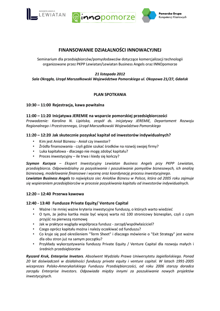 FINANSOWANIE DZIAŁALNOŚCI INNOWACYJNEJ Seminarium dla przedsiębiorców/pomysłodawców dotyczące komercjalizacji technologii organizowane przez PKPP Lewiatan/Lewiatan Business Angels oraz INNOpomorze 21 listopada 2012 Sala Okrągła, Urząd Marszałkowski Województwa Pomorskiego ul. Okopowa 21/27, Gdańsk PLAN SPOTKANIA 10:30 – 11:00 Rejestracja, kawa powitalna 11:00 – 11:20 Inicjatywa JEREMIE na wsparcie pomorskiej przedsiębiorczości Prowadzenie: Karolina N. Lipińska, zespół ds. inicjatywy JEREMIE, Departament Rozwoju Regionalnego i Przestrzennego, Urząd Marszałkowski Województwa Pomorskiego 11:20 – 12:20 Jak skutecznie pozyskać kapitał od inwestorów indywidualnych? • • • • Kim jest Anioł Biznesu - Anioł czy inwestor? Źródła finansowania - czyli gdzie szukać środków na rozwój swojej firmy? Luka kapitałowa - dlaczego nie mogę zdobyć kapitału? Proces inwestycyjny – ile trwa i kiedy się kończy? Szymon Kurzyca – Ekspert Inwestycyjny Lewiatan Business Angels przy PKPP Lewiatan, przedsiębiorca. Odpowiedzialny za pozyskiwanie i poszukiwanie pomysłów biznesowych, ich analizę biznesową, modelowanie finansowe i wycenę oraz koordynację procesu inwestycyjnego. Lewiatan Business Angels to największa siec Aniołów Biznesu w Polsce, która od 2005 roku zajmuje się wspieraniem przedsiębiorców w procesie pozyskiwania kapitału od inwestorów indywidualnych. 12:20 – 12:40 Przerwa kawowa 12:40 - 13:40 Fundusze Private Equity/ Venture Capital • • • • • • Ważne i te mniej ważne kryteria inwestycyjne funduszy, o których warto wiedzieć O tym, że jedna kartka może być więcej warta niż 100 stronicowy biznesplan, czyli z czym przyjść na pierwszą rozmowę Jak w praktyce wygląda współpraca fundusz - zarząd/współwłaściciel? Czego oprócz kapitału można i należy oczekiwać od funduszu? Co kryje się pod określeniem "Term Sheet" i dlaczego mówienie o "Exit Strategy" jest ważne dla obu stron już na samym początku? Przykłady wykorzystywania funduszy Private Equity / Venture Capital dla rozwoju małych i średnich przedsiębiorstw Ryszard Kruk, Enterprise Invetors. Absolwent Wydziału Prawa Uniwersytetu Jagiellońskiego. Ponad 20 lat doświadczeń w działalności funduszy private equity i venture capital. W latach 1991-2005 wiceprezes Polsko-Amerykańskiego Funduszu Przedsiębiorczości, od roku 2006 starszy doradca zarządu Enterprise Investors. Odpowiada między innymi za poszukiwanie nowych projektów inwestycyjnych. Enterprise Investors jest jedną z największych w Polsce i Europie Środkowej grupą funduszy private equity i venture capital. EI działa od 1990 roku i zarządza ośmioma funduszami o łącznym kapitale 2 mld Euro. Fundusze zarządzane przez Enterprise Investors zainwestowały dotąd 1,5 mld Euro w 127 firm z różnych branż. Fundusze uczestniczyły już w 27 debiutach na GPW w Warszawie oraz debiucie na NYSE. Więcej info: www.ei.com.pl 13:40 – 14:40 Konsultacje B2B Inicjatywa JEREMIE – Pośrednicy Finansowi - Pomorski Fundusz Pożyczkowy Sp. z o.o. Towarzystwo Rozwoju Powiśla Pomorski Regionalny Fundusz Poręczeń Kredytowych Sp. z o.o. Fundusze VC - prowadzi Ryszard Kruk Anioły Biznesu - prowadzi Szymon Kurzyca 14:40 Lunch Europejskiej z Europejskiego Funduszu Rozwoju Regionalnego w ramach Programu Operacyjnego Innowacyjna Gospodarka - Priorytet III - Kapitał dla innowacji, Działanie 3.3 - Tworzenie systemu ułatwiającego inwestowanie w MSP, Poddziałanie 3.3. 1 - Wsparcie dla Instytucji Otoczenia Biznesu, Projekt „Aktywizacja i podnoszenie kompetencji podmiotów rynku aniołów biznesu w Polsce”. Projekt współfinansowany przez Unię Europejską w ramach Europejskiego Funduszu Społecznego