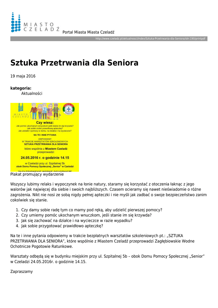 Portal Miasta Miasta Czeladź http://www.czeladz.pl/aktualnosci/index/Sztuka-Przetrwania-dla-Seniora/idn:190/printpdf Sztuka Przetrwania dla Seniora 19 maja 2016 kategoria: Aktualności Plakat promujący wydarzenie Wszyscy lubimy relaks i wypoczynek na łonie natury, staramy się korzystać z otoczenia łaknąc z jego walorów jak najwięcej dla siebie i swoich najbliższych. Czasem ocieramy się nawet nieświadomie o różne zagrożenia. Nikt nie nosi ze sobą nigdy pełnej apteczki i nie myśli jak zadbać o swoje bezpieczeństwo zanim cokolwiek się stanie. 1. 2. 3. 4. Czy damy sobie radę tym co mamy pod ręką, aby udzielić pierwszej pomocy? Czy umiemy pomóc ukochanym wnuczkom, jeśli stanie im się krzywda? Jak się zachować na działce i na wycieczce w razie wypadku? Jak sobie przygotować prawidłowo apteczkę? Na te i inne pytania odpowiemy w trakcie bezpłatnych warsztatów szkoleniowych pt.: „SZTUKA PRZETRWANIA DLA SENIORA”, które wspólnie z Miastem Czeladź przeprowadzi Zagłębiowskie Wodne Ochotnicze Pogotowie Ratunkowe. Warsztaty odbędą się w budynku miejskim przy ul. Szpitalnej 5b – obok Domu Pomocy Społecznej „Senior” w Czeladzi 24.05.2016r. o godzinie 14.15. Zapraszamy