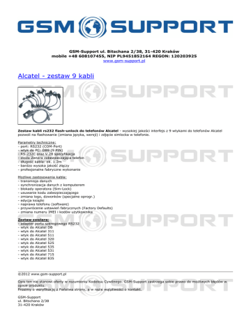 GSM-Support ul. Bitschana 2/38, 31-420 Kraków mobile +48 608107455, NIP PL9451852164 REGON: 120203925 www.gsm-support.pl Alcatel - zestaw 9 kabli Zestaw kabli rs232 flash-unlock do telefonów Alcatel - wysokiej jakości interfejs z 9 wtykami do telefonów Alcatel pozwoli na flashowanie (zmiana języka, wersji) i zdjęcie simlocka w telefonie. Parametry techniczne: - port: RS232 (COM-Port) - wtyk do PC: DB9 (9 PIN) - RS-232C oraz V.28 specyfikacja - dioda Zenera zabezpieczająca telefon - długość kabla: ok. 1.2m - bardzo wysoka jakość złączy - profesjonalne fabryczne wykonanie Możliwe zastosowania kabla: - transmisja danych - synchronizacja danych z komputerem - blokady operatora (Sim-Lock) - usuwanie kodu zabezpieczającego - zmiana logo, dzwonków (specjalne oprogr.) - edycja książki - naprawa telefonu (software) - przywrócenie ustawień fabrycznych (Factory Defaults) - zmiana numeru IMEI i kodów użytkownika Zestaw zawiera: - adapter portu szeregowego RS232 - wtyk do Alcatel DB - wtyk do Alcatel 311 - wtyk do Alcatel 511 - wtyk do Alcatel 320 - wtyk do Alcatel 525 - wtyk do Alcatel 535 - wtyk do Alcatel 531 - wtyk do Alcatel 715 - wtyk do Alcatel 835 ©2012 www.gsm-support.pl Opis ten nie stanowi oferty w rozumieniu Kodeksu Cywilnego. GSM-Support zastrzega sobie prawo do możliwych błędów w opisie produktu. Prosimy o weryfikację z Państwa strony, a w razie wątpliwości o kontakt. GSM-Support ul. Bitschana 2/38 31-420 Kraków POLSKA tel. 608107455 e-mail: [email protected] Powered by TCPDF (www.tcpdf.org)