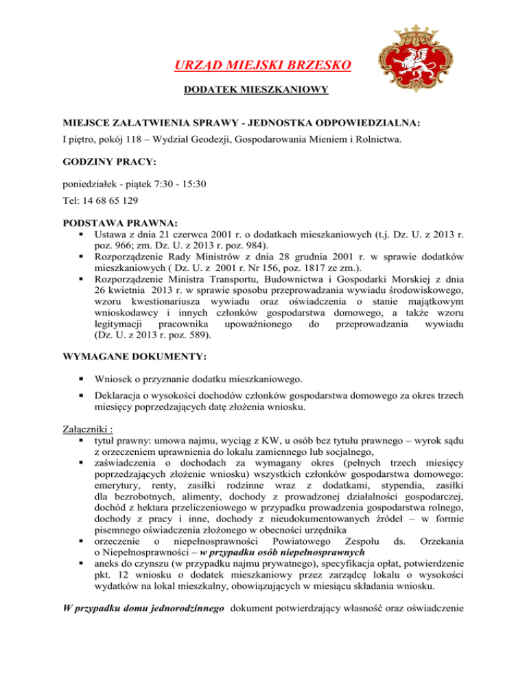URZĄD MIEJSKI BRZESKO DODATEK MIESZKANIOWY MIEJSCE ZAŁATWIENIA SPRAWY - JEDNOSTKA ODPOWIEDZIALNA: I piętro, pokój 118 – Wydział Geodezji, Gospodarowania Mieniem i Rolnictwa. GODZINY PRACY: poniedziałek - piątek 7:30 - 15:30 Tel: 14 68 65 129 PODSTAWA PRAWNA:  Ustawa z dnia 21 czerwca 2001 r. o dodatkach mieszkaniowych (t.j. Dz. U. z 2013 r. poz. 966; zm. Dz. U. z 2013 r. poz. 984).  Rozporządzenie Rady Ministrów z dnia 28 grudnia 2001 r. w sprawie dodatków mieszkaniowych ( Dz. U. z 2001 r. Nr 156, poz. 1817 ze zm.).  Rozporządzenie Ministra Transportu, Budownictwa i Gospodarki Morskiej z dnia 26 kwietnia 2013 r. w sprawie sposobu przeprowadzania wywiadu środowiskowego, wzoru kwestionariusza wywiadu oraz oświadczenia o stanie majątkowym wnioskodawcy i innych członków gospodarstwa domowego, a także wzoru legitymacji pracownika upoważnionego do przeprowadzania wywiadu (Dz. U. z 2013 r. poz. 589). WYMAGANE DOKUMENTY:  Wniosek o przyznanie dodatku mieszkaniowego.  Deklaracja o wysokości dochodów członków gospodarstwa domowego za okres trzech miesięcy poprzedzających datę złożenia wniosku. Załączniki :  tytuł prawny: umowa najmu, wyciąg z KW, u osób bez tytułu prawnego – wyrok sądu z orzeczeniem uprawnienia do lokalu zamiennego lub socjalnego,  zaświadczenia o dochodach za wymagany okres (pełnych trzech miesięcy poprzedzających złożenie wniosku) wszystkich członków gospodarstwa domowego: emerytury, renty, zasiłki rodzinne wraz z dodatkami, stypendia, zasiłki dla bezrobotnych, alimenty, dochody z prowadzonej działalności gospodarczej, dochód z hektara przeliczeniowego w przypadku prowadzenia gospodarstwa rolnego, dochody z pracy i inne, dochody z nieudokumentowanych źródeł – w formie pisemnego oświadczenia złożonego w obecności urzędnika  orzeczenie o niepełnosprawności Powiatowego Zespołu ds. Orzekania o Niepełnosprawności – w przypadku osób niepełnosprawnych  aneks do czynszu (w przypadku najmu prywatnego), specyfikacja opłat, potwierdzenie pkt. 12 wniosku o dodatek mieszkaniowy przez zarządcę lokalu o wysokości wydatków na lokal mieszkalny, obowiązujących w miesiącu składania wniosku. W przypadku domu jednorodzinnego dokument potwierdzający własność oraz oświadczenie o powierzchni użytkowej i wyposażeniu technicznym budynku oraz rachunki za energię elektryczną, wodę, odbiór nieczystości stałych i płynnych. Wyżej wymienione dokumenty należy przedłożyć w chwili składania wniosku. OPŁATY : Nie podlega. TERMIN ZAŁATWIENIA SPRAWY: Czas na rozpatrzenie wniosku– do 1 miesiąca od daty złożenia wniosku. przypadkach termin może ulec wydłużeniu zgodnie z k.p.a. W trudnych TRYB ODWOŁAWCZY: Od decyzji przysługuje stronie prawo wniesienia odwołania do Samorządowego Kolegium Odwoławczego w Tarnowie ul. Bema 17, za pośrednictwem Burmistrza Brzeska, w terminie 14-stu dni od daty doręczenia decyzji.