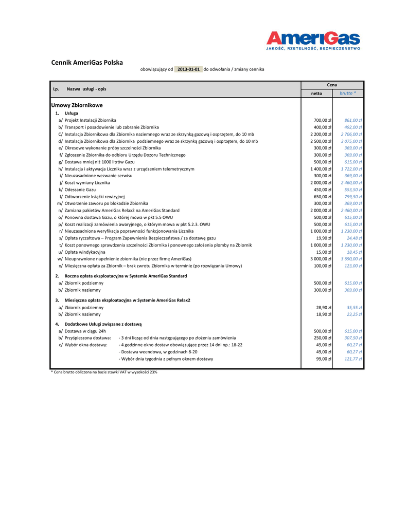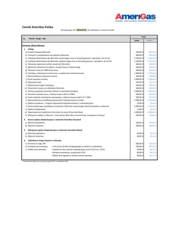 Cennik AmeriGas Polska obowiązujący od 2013-01-01 do odwołania / zmiany cennika Lp. Nazwa usługi - opis Cena netto brutto * 700,00 zł 400,00 zł 2 200,00 zł 2 500,00 zł 300,00 zł 300,00 zł 500,00 zł 1 400,00 zł 300,00 zł 2 000,00 zł 450,00 zł 650,00 zł 300,00 zł 2 000,00 zł 500,00 zł 500,00 zł 1 000,00 zł 19,90 zł 1 000,00 zł 15,00 zł 3 000,00 zł 100,00 zł 861,00 zł 492,00 zł 2 706,00 zł 3 075,00 zł 369,00 zł 369,00 zł 615,00 zł 1 722,00 zł 369,00 zł 2 460,00 zł 553,50 zł 799,50 zł 369,00 zł 2 460,00 zł 615,00 zł 615,00 zł 1 230,00 zł 24,48 zł 1 230,00 zł 18,45 zł 3 690,00 zł 123,00 zł 500,00 zł 300,00 zł 615,00 zł 369,00 zł 28,90 zł 18,90 zł 35,55 zł 23,25 zł 500,00 zł 250,00 zł 49,00 zł 49,00 zł 99,00 zł 615,00 zł 307,50 zł 60,27 zł 60,27 zł 121,77 zł Umowy Zbiornikowe 1. a/ b/ C/ d/ e/ f/ g/ h/ i/ j/ k/ l/ m/ n/ o/ p/ r/ s/ t/ u/ w/ x/ Usługa Projekt Instalacji Zbiornika Transport i posadowienie lub zabranie Zbiornika Instalacja Zbiornikowa dla Zbiornika naziemnego wraz ze skrzynką gazową i osprzętem, do 10 mb Instalacja Zbiornikowa dla Zbiornika podziemnego wraz ze skrzynką gazową i osprzętem, do 10 mb Okresowe wykonanie próby szczelności Zbiornika Zgłoszenie Zbiornika do odbioru Urzędu Dozoru Technicznego Dostawa mniej niż 1000 litrów Gazu Instalacja i aktywacja Licznika wraz z urządzeniem telemetrycznym Nieuzasadnione wezwanie serwisu Koszt wymiany Licznika Odessanie Gazu Odtworzenie książki rewizyjnej Otworzenie zaworu po blokadzie Zbiornika Zamiana pakietów AmeriGas Relax2 na AmeriGas Standard Ponowna dostawa Gazu, o której mowa w pkt 5.5 OWU Koszt realizacji zamówienia awaryjnego, o którym mowa w pkt 5.2.3. OWU Nieuzasadniona weryfikacja poprawności funkcjonowania Licznika Opłata ryczałtowa – Program Zapewnienia Bezpieczeństwa / za dostawę gazu Koszt ponownego sprawdzenia szczelności Zbiornika i ponownego założenia plomby na Zbiornik Opłata windykacyjna Nieuprawnione napełnienie zbiornika (nie przez firmę AmeriGas) Miesięczna opłata za Zbiornik – brak zwrotu Zbiornika w terminie (po rozwiązaniu Umowy) 2. Roczna opłata eksploatacyjna w Systemie AmeriGas Standard a/ Zbiornik podziemny b/ Zbiornik naziemny 3. Miesięczna opłata eksploatacyjna w Systemie AmeriGas Relax2 a/ Zbiornik podziemny b/ Zbiornik naziemny 4. a/ b/ c/ Dodatkowe Usługi związane z dostawą Dostawa w ciągu 24h Przyśpieszona dostawa: - 3 dni licząc od dnia następującego po złożeniu zamówienia Wybór okna dostawy: - 4 godzinne okno dostaw obowiązujące przez 14 dni np.: 18-22 - Dostawa weendowa, w godzinach 8-20 - Wybór dnia tygodnia z pełnym oknem dostawy * Cena brutto obliczona na bazie stawki VAT w wysokości 23%