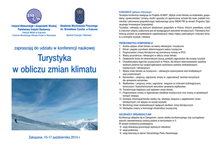 Instytut Meteorologii i Gospodarki Wodnej Państwowy Instytut Badawczy Akademia Wychowania Fizycznego im. Bronisława Czecha w Krakowie Oddział IMGW w Krakowie Centrum Monitoringu Klimatu Polski w Warszawie Wydział Turystyki i Rekreacji zapraszają do udziału w konferencji naukowej Turystyka w obliczu zmian klimatu KOMUNIKAT (główne informacje) Tematyka konferencji nawiązuje do Projektu KLIMAT: „Wpływ zmian klimatu na środowisko, gospodarkę i społeczeństwo” (zmiany, skutki i sposoby ich ograniczania, wnioski dla nauki, praktyki inżynierskiej i planowania gospodarczego) realizowanego przez IMGW PIB (w ramach Programu Operacyjnego Innowacyjna Gospodarka). Turystyka i rekreacja są ważnymi dziedzinami gospodarki w Polsce, których prawidłowy rozwój w znacznym stopniu uzależniony jest od występujących warunków klimatycznych. Planowana Konferencja pozwoli na przedstawienie najistotniejszych relacji między potencjalnymi zmianami klimatu a rozwojem turystyki i rekreacji. PROBLEMATYKA KONFERENCJI 1. Analiza wpływu zmian klimatu na walory rekreacyjne i turystyczne 2. Klimat i pogoda czynnikami determinującymi walory turystyczne 3. Prognozowane zmiany klimatyczne wg scenariuszy rozwoju w IPCC 4. Walory przyrodnicze i rekreacyjne w obliczu zmian klimatu 5. Zwiększenie liczby dni ekstremalnych (susza, powódź) zagrożeniem dla rozwoju turystyki 6. Charakterystyka regionów turystycznych w Polsce, dla których wykorzystywanie zasobów wodnych powinno być podporządkowane zachowaniu walorów środowiskowych, turystycznych i rekreacyjnych 7. Wpływ zmian klimatu na turystyczno – rekreacyjne wykorzystanie wód śródlądowych oraz przybrzeżnych 8. Narciarstwo – prognozy, zagrożenia, zmiany w „regionalizacji” terenów korzystnych dla uprawiania narciarstwa 9. Wędkarstwo – prognozy zmian, zagrożenia związane ze zmianami hydrologicznymi, termicznymi i fizykochemicznymi warunków uprawiania wędkarstwa 10. Transformacje krajobrazu pod wpływem zmian klimatu 11. Prognozowane zmiany w regionalizacji ośrodków turystycznych oraz zmiany w uprawianych formach rekreacji 12. Edukacja /informacja/transfer wiedzy (np. edukacja związana z zagadnieniem zmian klimatycznych i ich wpływu na rozwój turystyki) 13. Monitoring zmian środowiskowych będących skutkiem zmian klimatycznych 14. Niezbędne zmiany w technologii infrastruktury turystycznej SZCZEGÓŁY ORGANIZACYJNE Konferencja odbędzie się w Zakopanem, nazwa obiektu konferencyjnego oraz szczegółowe warunki zakwaterowania zostaną podane w komunikacie nr 2. W ramach konferencji przewidujemy: sesję referatową (prezentacje wybranych referatów) sesję posterową sesję terenową w rejonie Tatrzańskiego Parku Narodowego Zakopane, 15-17 października 2014 r. KOMITET NAUKOWY KONFERENCJI Przewodniczący Komitetu: dr hab. inż., prof. ndzw. Mieczysław S. Ostojski Dyrektor Instytutu Meteorologii i Gospodarki Wodnej – Państwowego Instytutu Badawczego, Wiceprezydent Światowej Organizacji Meteorologicznej dr hab. prof. ndzw. Ryszard Winiarski Dziekan Wydziału Turystyki i Rekreacji, Akademia Wychowania Fizycznego w Krakowie; prof. dr hab. Kazimierz Krzemień Dziekan Wydziału Biologii i Nauk o Ziemi, Uniwersytet Jagielloński Ważne terminy Osoby zainteresowane udziałem w Konferencji proszone są o przesłanie wypełnionej karty zgłoszenia uczestnictwa w terminie do dnia 30.06.2014 na adres: [email protected] lub [email protected] Nadsyłanie abstraktów referatów i posterów do 31.05.2014 Akceptacja referatów do wygłoszenia do 15. 06. 2014 Nadsyłanie pełnych tekstów referatów (przygotowanych zgodnie z instrukcją podaną w komunikacie nr 2) do 15.09.2014 Wnoszenie opłat konferencyjnych do 31. 07. 2014 Wydawnictwo oraz dr Jan Błachuta Instytut Meteorologii i Gospodarki Wodnej – Państwowy Instytut Badawczy dr Piotr Dąbrowski Zakład Obsługi Ruchu Turystycznego, Akademia Wychowania Fizycznego w Krakowie dr hab. Zygmunt Kruczek Kierownik Zakładu Geografii Turystyki, Akademia Wychowania Fizycznego w Krakowie dr inż. Krzysztof Kulesza Instytut Meteorologii i Gospodarki Wodnej – Państwowy Instytut Badawczy dr Danuta Limanówka Kierownik Centrum Monitoringu Klimatu Polski, Instytut Meteorologii i Gospodarki Wodnej – Państwowy Instytut Badawczy prof. dr hab. inż. Maciej Maciejewski Zastępca Dyrektora, Instytut Meteorologii i Gospodarki Wodnej – Państwowy Instytut Badawczy dr hab. inż. arch., prof. ndzw. Zbigniew Myczkowski Wydział Architektury Politechniki Krakowskiej dr inż. Tomasz Walczykiewicz Instytut Meteorologii i Gospodarki Wodnej – Państwowy Instytut Badawczy prof. zw. dr hab. Zbigniew Witkowski Kierownik Katedry Nauk o Środowisku Przyrodniczym, Akademia Wychowania Fizycznego w Krakowie prof. dr hab. Janusz Zaleski Przewodniczący Rady Naukowej, Instytut Meteorologii i Gospodarki Wodnej – Państwowy Instytut Badawczy Przewidujemy druk pełnych tekstów referatów i posterów (po recenzji) w formie monografii w wydawnictwie IMGW-PIB w formie monografii według wymogów redakcji. Szczegółowe informacje dotyczące objętości i sposoby przygotowania materiałów do druku oraz wytyczne dla autorów zostaną przedstawione w komunikacie nr 2. Opłata konferencyjna Opłata konferencyjna wynosi 350 zł + VAT; pobyt w hotelu (płatny w obiekcie) 330-440 zł (dokładna cena zostanie podana w następnym komunikacie). Całkowity koszt udziału w konferencji obejmuje: noclegi w pokojach 1,2,3 osobowych, pełne wyżywienie, przerwy kawowe, uroczystą kolację – góralski wieczór integracyjny, wycieczkę terenową oraz materiały konferencyjne i wydawnictwo monografii. Dojazd uczestników na konferencję we własnym zakresie. Informacje bieżące Bieżące informacje na temat konferencji w formie komunikatów będą umieszczane na stronie internetowej: http://www.imgw.pl/turystyka_w_obliczu_zmian_klimatu Sekretariat konferencji: IMGW-PIB Oddział w Krakowie, ul. Piotra Borowego 14, 30-215 