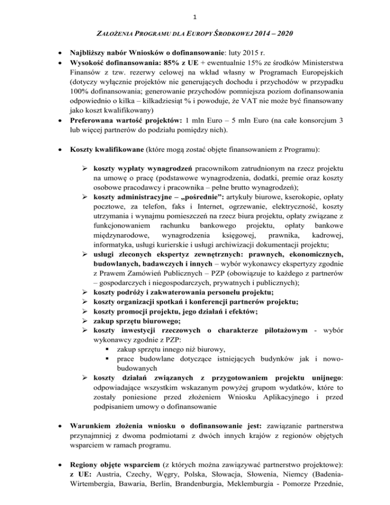 ZAŁOŻENIA PROGRAMU DLA EUROPY ŚRODKOWEJ 2014