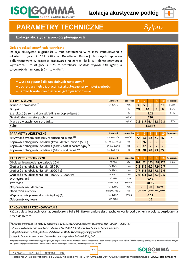 Izolacja akustyczne podłóg Sylpro PARAMETRY TECHNICZNE Izolacja akustyczna podłóg pływających Opis produktu i specyfikacja techniczna Izolacja akustyczna o grubości … mm dostarczana w rolkach. Produkowana z włókien i granuli SBR (Stirene Butadiene Rubber) łączonych spoiwem poliuretanowym w procesie prasowania na gorąco. Rolki w kolorze czarnym o wymiarach ….m długości i 1.25 m szerokości. Gęstość wynosi 730 kg/m³, a sztywność dynamiczna (s') - ..... MN/m³. • wysoka gęstość dla specjalnych zastosowań • dobre parametry izolacyjnści akustycznej przy małej grubości • bardzo trwałe, również w wilgotnym środowisku CECHY FIZYCZNE Grubość nominalna ⁽¹⁾ Długość Szerokość (razem z 4 cm zakładki sampoprzylepnej) Gęstość (bez warstwy ochronnej) Masa powierzchniowa produktu Kolor Standard Jednostka EN 12431 mm m m kg/m³ kg/m² PARAMETRY AKUSTYCZNE Sztywność dynamiczna przy montażu na sucho ⁽²⁾ Poprawa izolacyjności od dźwięków uderzeniowych (Δ IIC) Poprawa izolacyjności od dźwie (ΔLw) - test laboratoryjny ⁽³⁾ Poprawa izolacyjności od dźwie (ΔLw) - wyliczona ⁽⁴⁾ PARAMETRY TECHNICZNE Obciążenie powodujące ugięcie 10% Grubość przy obciążeniu (dL - 250 Pa) Grubość przy obciążeniu (dF - 2000 Pa) Grubość przy obciążeniu (dB - 50000 → 2000 Pa) Wytrzymałość Twardość Odporność na uderzenia Obciążenia ruchem Współczynnik przewodności cieplnej (λ) Odporność ogniowa 3 3 20 5 5 6 6 8 8 8 10 10 6 10 1.25 730 2.2 3.7 4.4 5.8 7.3 czarny dB 3 77 18 5 6 8 10 63 62 49 47 26 22 20 20 21 22 Standard Jednostka 3 5 EN 826 kPa 102 82 133 118 179 EN 12431 mm EN 12431 mm Standard Jednostka EN 29052/1 MN/m³ ASTM E 2179-03 dB EN ISO 10140 dB EN 12354/2 6 8 10 mm 2.8 5.2 6.0 7.9 9.7 2.7 5.1 5.8 7.8 9.6 2.6 5.1 5.8 7.7 9.5 0.42 48-52 1750 ≥2000 - EN ISO 3386-2 kPa CC25=539 / CC40=1803 / CC50=4660 EN 12667 W/mK 0.12 B2 EN 12431 mm ISO 1798 MPa DIN 53505 Shore A EN 12691 DIN 4102 Tolerancja ± 20% ± 5% ± 1% ± 11% Tolerancja ±2 Tolerancja ± 5% PAKOWANIE i PRZECHOWYWANIE Każda paleta jest owinięta i zabezpieczona folią PE. Rekomenduje się przechowywanie pod dachem w celu zabezpieczenia przed deszczem ⁽¹⁾ Grubość zmierzona wg metody z normy EN 12431 i równa grubości przy obciążeniu (dB - 50000 → 2000 Pa) ⁽²⁾ Pomiar wykonany z odstępstwem od normy EN 29052-1, brak warstwy tynku na badanej próbce. ⁽³⁾ Raport z badań n. 2008_0097.04 2008 roku w MA39 Wiednia; pływający parkiet ⁽⁴⁾ Wynik dla montażu na sucho i wylewki o wadze powierzchniowej 85 kg/m² Powyższe informacje techniczne i sugestie powyżej odpowiadają naszej wiedzy na temat właściwości i cech użytkowych produktu. ISOLGOMMA zastrzega sobie prawo do uaktualnienia danych bez uprzedniego powiadomienia. Ten dokument jest własnością ISOLGOMMA, wszelkie prawa zastrzeżone. PRG-MOD. 15 REV 1.4 08/03/2013 POL 1/2 Isolgomma Srl, Via dell'Artigianato Z.I., 36020 Albettone (VI), tel. 0444790781, fax 0444790784, [email protected], www.isolgomma.com Izolacja akustyczne podłóg Sylpro PARAMETRY TECHNICZNE Izolacja akustyczna podłóg pływających Krzywa ugięcia - EN 826 ⁽⁵⁾ Pełzanie materiału - EN 1606 ⁽⁵⁾ 12% 500 450 Creep - 1250 Pa Sylpro 3 400 Sylpro 5 350 8% Sylpro 6 300 Ugięcie (%) Obciążenie (kPa) Creep - 2000 Pa 10% Sylpro 8 250 Sylpro 10 200 6% 4% 150 100 2% 50 0% 0 0 0 1 2 3 4 5 6 7 8 9 10 11 12 13 14 15 16 17 18 19 20 Ugięcie (%) 8760 17520 26280 Czas (godziny) 35040 43800 43800 ⁽⁵⁾ Grubość początkowa produktu podczas testu jest równa wartości ze str. 1. Uzyj tej wartości do wyliczenia współczynnika The initial thickness of the product during testing is equal to the value of pag. 1 "Compression strain (dL - 250 Pa)"; use this value to evaluate the wskaźnika zgnieceniamateriału wg przedmiotowej normy INSTRUKCJA MONTAŻU Zaizoluj narożniki za pomocą izolacji obwiedniowej "Profil", poprzez docięcie jej jak na rysunku. Ułóż warstwę izolacyjną. Sklej brzegi rolek ze sobą za pomocą taśmy klejącej "Stik". Ułóż folię zabezpieczającą. Wykonaj wylewkę. Wykończ podłogę (płytkami, parkietem, itd.). Po wykonaniu podłogi, przytnij izolację obwiedniową do odpowiedniej wysokości. PRG-MOD. 15 REV 1.4 08/03/2013 POL 2/2 Isolgomma Srl, Via dell'Artigianato Z.I., 36020 Albettone (VI), tel. 0444790781, fax 0444790784, [email protected], www.isolgomma.com