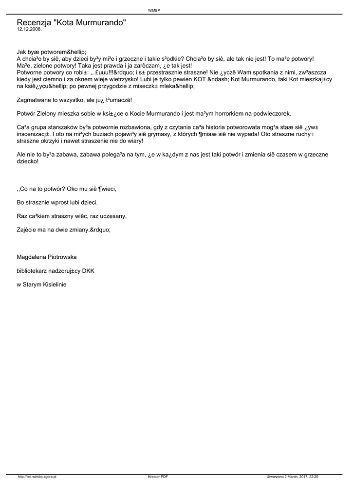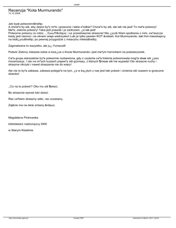 WiMBP Recenzja "Kota Murmurando" 12.12.2008. Jak byæ potworem… A chcia³o by siê, aby dzieci by³y mi³e i grzeczne i takie s³odkie? Chcia³o by siê, ale tak nie jest! To ma³e potwory! Ma³e, zielone potwory! Taka jest prawda i ja zarêczam, ¿e tak jest! Potworne potwory co robi±: ,, £uuu!!!” i s± przestrasznie straszne! Nie ¿yczê Wam spotkania z nimi, zw³aszcza kiedy jest ciemno i za oknem wieje wietrzysko! Lubi je tylko pewien KOT – Kot Murmurando, taki Kot mieszkaj±cy na ksiê¿ycu… po pewnej przygodzie z miseczk± mleka… Zagmatwane to wszystko, ale ju¿ t³umaczê! Potwór Zielony mieszka sobie w ksi±¿ce o Kocie Murmurando i jest ma³ym horrorkiem na podwieczorek. Ca³a grupa starszaków by³a potwornie rozbawiona, gdy z czytania ca³a historia potworowata mog³a staæ siê ¿yw± inscenizacj±. I oto na mi³ych buziach pojawi³y siê grymasy, z których ¶miaæ siê nie wypada! Oto straszne ruchy i straszne okrzyki i nawet straszenie nie do wiary! Ale nie to by³a zabawa, zabawa polega³a na tym, ¿e w ka¿dym z nas jest taki potwór i zmienia siê czasem w grzeczne dziecko! ,,Co na to potwór? Oko mu siê ¶wieci, Bo strasznie wprost lubi dzieci. Raz ca³kiem straszny wiêc, raz uczesany, Zajêcie ma na dwie zmiany.” Magdalena Piotrowska bibliotekarz nadzoruj±cy DKK w Starym Kisielinie http://old.wimbp.zgora.pl Kreator PDF Utworzono 2 March, 2017, 22:20