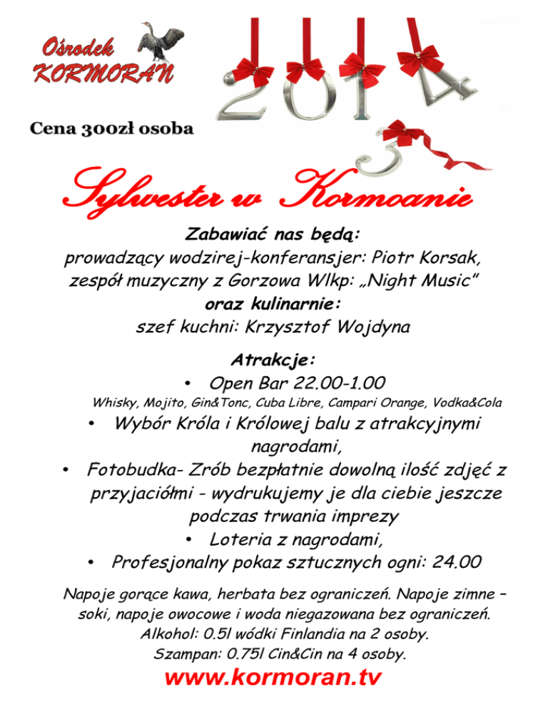 Cena 300zł osoba Sylwester w Kormoanie Zabawiać nas będą: prowadzący wodzirej-konferansjer: Piotr Korsak, zespół muzyczny z Gorzowa Wlkp: „Night Music” oraz kulinarnie: szef kuchni: Krzysztof Wojdyna Atrakcje: • Open Bar 22.00-1.00 Whisky, Mojito, Gin&Tonc, Cuba Libre, Campari Orange, Vodka&Cola • Wybór Króla i Królowej balu z atrakcyjnymi nagrodami, • Fotobudka- Zrób bezpłatnie dowolną ilość zdjęć z przyjaciółmi - wydrukujemy je dla ciebie jeszcze podczas trwania imprezy • Loteria z nagrodami, • Profesjonalny pokaz sztucznych ogni: 24.00 Napoje gorące kawa, herbata bez ograniczeń. Napoje zimne – soki, napoje owocowe i woda niegazowana bez ograniczeń. Alkohol: 0.5l wódki Finlandia na 2 osoby. Szampan: 0.75l Cin&Cin na 4 osoby. www.kormoran.tv Menu Godzina 2030 Kolacja (serwowana do stołów przez kelnerów) Na przywitanie : Aperitif Przystawka : Tatar z łososia z kaparami Danie główne : Wyborna pierś ze szlacheckiej kaczki prosto z grilla, ułożona na kapuście czerwonej usmażonej na czerwonym winie, podana z pieczonym jabłkiem, sosem śliwkowym i pieczonymi ziemniaczkami od 2100 Bufet szwedzki na gorąco szynka pieczona, uprzednio peklowana w musztardowej solance, sandacz w sosie cytrynowym, goloneczki pieczone w piwie, pierogi z boczkiem i szpinakiem, wykwintna zupa gulaszowa, trio mięs z grilla, stek z karkówki marynowany w ziołach prowansalskich i miodzie, żeberka na ostro, szaszłyk z drobiu przeplatany pieczarką, boczkiem, cebulą i papryką od 2100 Bufet szwedzki na zimno kompozycja wędlin hiszpańskich, szynka parmeńska z melonem, jajka faszerowane wędzonym łososiem, płyta z mięs pieczonych: karkówka z czosnkiem, schab w migdałach, boczek w majeranku itp., tymbaliki z ryb i drobiu, wariacje ze śledzi, befsztyk tatarski, aromatyzowany pasztet z dziczyzny z nutą jałowca, nadziewany śliwkami duszonymi w czerwonym winie, deska różnorodnych serów w towarzystwie owoców, płyta ryb wędzonych (z naszej wędzarni), sałatka krabowa, sałatka ziemniaczana z wędzonym łososiem, sałatka capresse (pomidorki coctajlowe z mozzarellą w sosie pesto), zimne sosy do przekąsek, masło smakowe, pieczywo mieszane od 2100 Bufet szwedzki na słodko - deserowy ciasta własnego wypieku, mnóstwo wspaniałych deserów,owoce od 2100 Kącik wiejski z wyrobami własnymi szynka, boczek, baleron, polędwica, kiełbasa, kaszanka itp., nie zabraknie również: pysznego chleba, smalcu ze skwarkami i ogóreczków. Godzina 2330 Dania serwowane przez kucharza Podawane z ziemniakami pieczonymi, sałatą i innymi dodatkami prosiaki pieczone w całości. Nad ranem... Dla strudzonych zabawą - kwaśnica