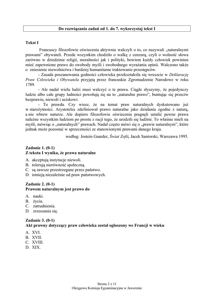 Do rozwiązania zadań od 1. do 7. wykorzystaj tekst I Tekst I Francuscy filozofowie oświecenia aktywnie walczyli o to, co nazywali „naturalnymi prawami” obywateli. Przede wszystkim chodziło o walkę z cenzurą, czyli o wolność słowa zarówno w dziedzinie religii, moralności jak i polityki, bowiem każdy człowiek powinien mieć zapewnione prawo do swobody myśli i swobodnego wyrażania opinii. Walczono także o zniesienie niewolnictwa i bardziej humanitarne traktowanie przestępców. - Zasada poszanowania godności człowieka przekształciła się wreszcie w Deklarację Praw Człowieka i Obywatela przyjętą przez francuskie Zgromadzenie Narodowe w roku 1789. - Ale nadal wielu ludzi musi walczyć o te prawa. Ciągle słyszymy, że pojedynczy ludzie albo całe grupy ludności powołują się na to „naturalne prawo”, buntując się przeciw bezprawiu, niewoli i uciskowi. - To prawda. Czy wiesz, że na temat praw naturalnych dyskutowano już w starożytności. Arystoteles zdefiniował prawo naturalne jako działania zgodne z naturą, a nie wbrew naturze. Ale dopiero filozofowie oświecenia pragnęli ustalić pewne prawa należne wszystkim ludziom po prostu z racji tego, że urodzili się ludźmi. To właśnie mieli na myśli, mówiąc o „naturalnych” prawach. Nadal często mówi się o „prawie naturalnym”, które jednak może pozostać w sprzeczności ze stanowionymi prawami danego kraju. według: Jostein Gaarder, Świat Zofii, Jacek Santorski, Warszawa 1995. Zadanie 1. (0-1) Z tekstu I wynika, że prawa naturalne A. B. C. D. akceptują instytucje niewoli. tolerują nierówność społeczną. są zawsze przestrzegane przez państwo. istnieją niezależnie od praw państwowych. Zadanie 2. (0-1) Prawem naturalnym jest prawo do A. B. C. D. nauki. życia. zatrudnienia. zrzeszania się. Zadanie 3. (0-1) Akt prawny dotyczący praw człowieka został ogłoszony we Francji w wieku A. B. C. D. XVI. XVII. XVIII. XIX. Strona 2 z 11 Okręgowa Komisja Egzaminacyjna w Jaworznie Zadanie 4. (0–1) Francuskie Zgromadzenie Narodowe przyjęło Deklarację Praw Człowieka i Obywatela w okresie A. B. C. D. reformacji. wojny stuletniej. rządów Ludwika XIV. wielkiej rewolucji francuskiej. Zadanie 5. (0-1) Które zdanie pozbawione jest opinii? A. B. C. D. Człowiek bardzo rzadko wyraża swoje poglądy. Więźniowie nie byli traktowani zbyt humanitarnie. Walka ludzi przeciwko bezprawiu jest bardzo ważna. Pojęcie prawa naturalnego zdefiniowano w starożytności. Zadanie 6. (0 –1) Wolność człowieka przejawia się A. B. C. D. dowolnością interpretacji prawa, wyrozumiałością wobec odmiennych poglądów. możliwością podejmowania samodzielnych decyzji. koniecznością podporządkowania się wymaganiom przełożonych. Zadanie 7. (0-1) Który związek wyrazowy odnosi się przede wszystkim do wolności jednostki? A. B. C. D. Zdobycie niepodległości. Uzyskanie niezawisłości. Wywalczenie suwerenności. Zachowanie samodzielności. Do rozwiązania zadań od 8. do 10. wykorzystaj informacje zawarte w tabeli Tabela Termin 9 anarchizm 9 9 demokracja 9 9 totalitaryzm Definicja słownikowa Dezorganizacja powstała wskutek braku lub bezsilności ośrodków władzy; bezład, rozprężenie. Stan bezpaństwowy, w którym nie obowiązują żadne prawa. Forma rządów, w której władzę sprawuje lud bezpośrednio lub przez swoich przedstawicieli; władza ludu, ludowładztwo. Forma ustroju państwa, w którym oficjalnie uznaje się wolę większości jako źródło władzy. System organizacji państwa polegający na ingerencji władz we wszystkie dziedziny życia politycznego, społecznego, kulturalnego itp. oraz na sprawowaniu nad nimi całkowitej kontroli. według: Słownika wyrazów obcych, PWN, Warszawa 2000. Strona 3 z 11 Okręgowa Komisja Egzaminacyjna w Jaworznie Zadanie 8. (0-1) Jedną z cech totalitaryzmu jest A. B. C. D. prawo do zgromadzeń. zastraszanie obywateli. przestrzeganie swobód konstytucyjnych. funkcjonowanie niezawisłego sądownictwa. Zadanie 9. (0-1) Cechą anarchii jest A. B. C. D. brak silnej władzy państwowej. sprawne działanie administracji. skuteczne działanie władzy wykonawczej. wzorowe funkcjonowanie instytucji państwa. Zadanie 10. (0–1) Charakterystyczną cechą demokracji jest sprawowanie władzy przez A. B. C. D. jedną osobę. klasę społeczną. większość obywateli. mniejszość obywateli. Do rozwiązania zadań od 11. do 14. wykorzystaj obraz Jana Matejki Rejtan – upadek Polski Obraz Jan Matejko, Rejtan – upadek Polski, w: Malarstwo polskie.www.pinakoteka.zascianek.pl. Obraz Jana Matejki pt. Rejtan - upadek Polski przedstawia scenę, która rozegrała się na sali poselskiej w czasie ratyfikowania układów rozbiorowych. Uczestnikami wydarzeń byli posłowie szlacheccy i duchowieństwo. Rejtan, nie chcąc dopuścić do podpisania układu, położył się na progu i rozdarł szaty. Strona 4 z 11 Okręgowa Komisja Egzaminacyjna w Jaworznie Zadanie 11. (0-1) Wyraz twarzy i gesty postaci przedstawionych na obrazie pozwalają wnioskować, że w ówczesnym czasie polska szlachta była A. B. C. D. zgodna. obojętna. skłócona. jednomyślna. Zadanie 12. (0 –1) Przedstawiona przez Jana Matejkę scena jest dynamiczna dzięki ukazaniu A. B. C. D. postaci w ruchu. wielości szczegółów. kobiet na drugim planie. bogactwa strojów szlacheckich. Zadanie 13. (0 –1) Obraz J. Matejki Rejtan - upadek Polski jest malarską interpretacją A. B. C. D. radości z sukcesu politycznego Polski. reakcji szlachty na traktat rozbiorowy. zachowań szlachty wobec wolnej elekcji. zadowolenia ze wzrostu autorytetu króla. Zadanie 14. (0-1) Gest Rejtana jest oznaką A. B. C. D. niechęci wobec duchowieństwa. obrony przywilejów szlacheckich. protestu przeciwko samowoli króla. reakcji na zdradę grupy możnowładców. Zadanie 15. (0 –1) Upadek Polski w XVIII wieku był skutkiem A. B. C. D. silnej pozycji króla w państwie. łamania umów międzynarodowych. nadużywan