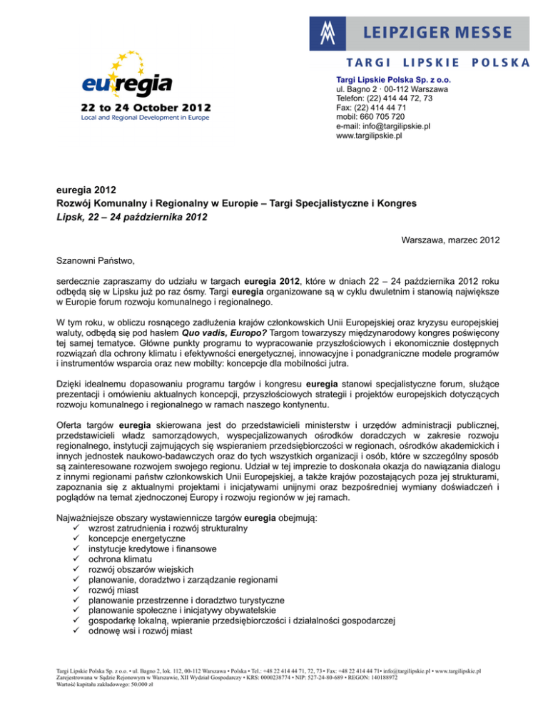 Targi Lipskie Polska Sp. z o.o. ul. Bagno 2 · 00-112 Warszawa Telefon: (22) 414 44 72, 73 Fax: (22) 414 44 71 mobil: 660 705 720 e-mail: [email protected] www.targilipskie.pl euregia 2012 Rozwój Komunalny i Regionalny w Europie – Targi Specjalistyczne i Kongres Lipsk, 22 – 24 października 2012 Warszawa, marzec 2012 Szanowni Państwo, serdecznie zapraszamy do udziału w targach euregia 2012, które w dniach 22 – 24 października 2012 roku odbędą się w Lipsku już po raz ósmy. Targi euregia organizowane są w cyklu dwuletnim i stanowią największe w Europie forum rozwoju komunalnego i regionalnego. W tym roku, w obliczu rosnącego zadłużenia krajów członkowskich Unii Europejskiej oraz kryzysu europejskiej waluty, odbędą się pod hasłem Quo vadis, Europo? Targom towarzyszy międzynarodowy kongres poświęcony tej samej tematyce. Główne punkty programu to wypracowanie przyszłościowych i ekonomicznie dostępnych rozwiązań dla ochrony klimatu i efektywności energetycznej, innowacyjne i ponadgraniczne modele programów i instrumentów wsparcia oraz new mobilty: koncepcje dla mobilności jutra. Dzięki idealnemu dopasowaniu programu targów i kongresu euregia stanowi specjalistyczne forum, służące prezentacji i omówieniu aktualnych koncepcji, przyszłościowych strategii i projektów europejskich dotyczących rozwoju komunalnego i regionalnego w ramach naszego kontynentu. Oferta targów euregia skierowana jest do przedstawicieli ministerstw i urzędów administracji publicznej, przedstawicieli władz samorządowych, wyspecjalizowanych ośrodków doradczych w zakresie rozwoju regionalnego, instytucji zajmujących się wspieraniem przedsiębiorczości w regionach, ośrodków akademickich i innych jednostek naukowo-badawczych oraz do tych wszystkich organizacji i osób, które w szczególny sposób są zainteresowane rozwojem swojego regionu. Udział w tej imprezie to doskonała okazja do nawiązania dialogu z innymi regionami państw członkowskich Unii Europejskiej, a także krajów pozostających poza jej strukturami, zapoznania się z aktualnymi projektami i inicjatywami unijnymi oraz bezpośredniej wymiany doświadczeń i poglądów na temat zjednoczonej Europy i rozwoju regionów w jej ramach. Najważniejsze obszary wystawiennicze targów euregia obejmują: wzrost zatrudnienia i rozwój strukturalny koncepcje energetyczne instytucje kredytowe i finansowe ochrona klimatu rozwój obszarów wiejskich planowanie, doradztwo i zarządzanie regionami rozwój miast planowanie przestrzenne i doradztwo turystyczne planowanie społeczne i inicjatywy obywatelskie gospodarkę lokalną, wpieranie przedsiębiorczości i działalności gospodarczej odnowę wsi i rozwój miast Targi Lipskie Polska Sp. z o.o. • ul. Bagno 2, lok. 112, 00-112 Warszawa • Polska • Tel.: +48 22 414 44 71, 72, 73 • Fax: +48 22 414 44 71• [email protected] • www.targilipskie.pl Zarejestrowana w Sądzie Rejonowym w Warszawie, XII Wydział Gospodarczy • KRS: 0000238774 • NIP: 527-24-80-689 • REGON: 140188972 Wartość kapitału zakładowego: 50.000 zł W ramach ostatniej edycji targów euregia, która odbyła się w październiku 2010 roku, uczestniczyło 73 wystawców z 7 państw. Imprezę odwiedziło 2.100 osób z 17 krajów, przy czym ponad 99% wszystkich odwiedzających stanowili przedstawiciele sektora rozwoju regionalnego. Podczas targów odbyło się ponad 40 konferencji, wykładów i seminariów. W tym roku targom euregia towarzyszyć będzie po raz pierwszy europejskie forum new mobility - Koncepcje dla Mobilności Jutra. W ramach forum prezentowane i dyskutowane będą rozwiązania, produkty i usługi służące rozwojowi infrastruktury komunikacyjnej, sieci połączeń transportu miejskiego i wiejskiego. W wyniku dynamicznie rosnącej mobilności mieszkańców miast i wsi zachodzi bowiem potrzeba wypracowania nowych rozwiązań technicznych i infrastrukturalnych oraz innowacyjnych modeli zagospodarowania przestrzennego. Forum new mobility będzie więc europejską platformą służącą wymianie opinii i prezentacji nowych modeli odpowiadających tym zapotrzebowaniom. Uczestnikami forum są przedstawiciele jednostek samorządu, planiści, przedsiębiorstwa komunikacji, dostawcy energii oraz przemysł motoryzacyjny, instytucje finansowe i ubezpieczeniowe, jak również organizacje turystyczne. Serdecznie zapraszamy Państwa do aktywnego udziału w targach euregia 2012 – najważniejszym w Europie forum poświęconym kwestiom rozwoju regionalnego, gdyż obecność na tej imprezie to dla polskich podmiotów doskonała okazja do promocji własnego regionu na arenie europejskiej, nawiązania cennych kontaktów i znalezienia potencjalnych inwestorów. Wszystkich zainteresowanych indywidualnym udziałem w imprezie prosimy o wypełnienie i przesłanie faksem poniższego zgłoszenia. Termin przyjmowania zgłoszeń: 07.05.2012 Z poważaniem Magdalena Dziemidek Prezes Zarządu Targi Lipskie Polska Sp. z o.o. Zgłoszenie udziału w targach euregia 2012 Prosimy przesyłać na numer faksu: 022 414 44 71 Jesteśmy zainteresowani indywidualnym udziałem w targach i prosimy o przesłanie formularzy zgłoszeniowych Ceny (powierzchnia niezabudowana bez ścianek działowych) Stoisko szeregowe 100,00 euro/m² Stoisko narożne 105,00 euro/m² Stoisko czołowe 110,00 euro/m² Stoisko wyspowe115,00 euro/m² Do wszystkich cen stoisk doliczyć należy niemiecką opłatę targową AUMA w wysokości 0,60 EUR/m² oraz niemiecki podatek VAT (19%). Firma :___________________________________________________________________________________ Imię i Nazwisko:____________________________________________________________________________ Adres: ___________________________________________________________________________________ Telefon /Fax : _____________________________________________________________________________ E-Mail: __________________________________________________________________________________ .....
