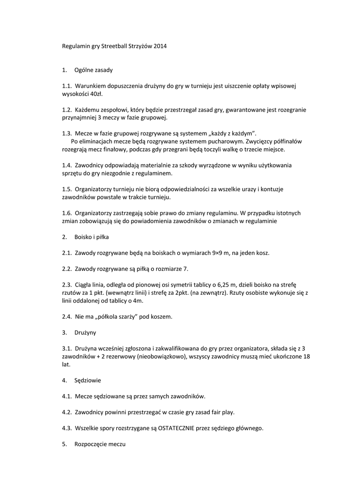 Regulamin gry Streetball Strzyżów 2014 1. Ogólne zasady 1.1