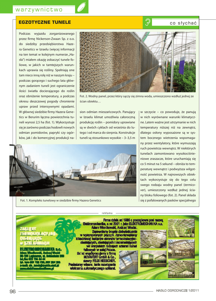 w arzywnictwo EGZOTYCZNE TUNELE Podczas wyjazdu co słych a ć zorganizowanego przez firmę Nickerson-Zwaan Sp. z o.o. do siedziby przedsiębiorstwa Hazera Genetics w Izraelu (więcej informacji na ten temat w kolejnym numerze „Hasła”) miałem okazję zobaczyć tunele foliowe, w jakich w tamtejszych warunkach uprawia się rośliny. Spełniają one tam nieco inną rolę niż w naszym kraju – podczas gorącego i suchego lata głównym zadaniem tuneli jest ograniczenie ilości światła docierającego do roślin oraz obniżenie temperatury, a podczas Fot. 2. Wodny panel, przez który sączy się zimna woda, umieszczono wzdłuż jednej ze okresu deszczowej pogody chronienie ścian obiektu… upraw przed intensywnymi opadami. W głównej siedzibie firmy Hazera Gene- sion odmian mieszańcowych. Panujący w szczycie – co powoduje, że panują tics w Berurim łączna powierzchnia tu- w Izraelu klimat umożliwia całoroczną w nich wyrównane warunki klimatycz- neli wynosi 2,5 ha (fot. 1). Wykorzystuje produkcję roślin – pomidory uprawiane ne. Latem ważne jest utrzymanie w nich się je zarówno podczas hodowli nowych są w dwóch cyklach od września do lu- temperatury niższej niż na zewnątrz, odmian pomidorów, papryki czy ogór- tego i od marca do sierpnia. Konstrukcje dlatego osłony wyposażone są w sys- ków, jak i do komercyjnej produkcji na- tuneli są stosunkowo wysokie – 3–3,5 m tem bocznego wietrzenia wspomagany przez wentylatory, które wymuszają ruch powietrza wewnątrz. W niektórych tunelach zamontowano wysokociśnieniowe zraszacze, które uruchamiają się co 5 minut na 5 sekund – obniża to temperaturę wewnątrz i podwyższa wilgotność powietrza. W najnowszych obiektach wykorzystuje się do tego celu swego rodzaju wodny panel (termicover), umieszczony wzdłuż jednej ściany bloku foliowego (fot. 2). Panel składa się z pofalowanych pasków specjalnego Fot. 1. Kompleks tunelowy w siedzibie firmy Hazera Genetics reklama 96 HASŁO OGRODNICZE 1/2011 Fot. 3. …na przeciwległej zamontowano wentylatory zasysające schłodzone i wilgotne powietrze papieru i doprowadzana jest do niego z góry zimna woda, która stopniowo przesiąka w dolne partie. Wewnątrz tunelu na przeciwległej ścianie zamontowane są wentylatory (fot. 3), które reklama zasysają schłodzone i wilgotne powietrze z panelu do wnętrza obiektu. System ten nieźle się sprawdza i pozwala obniżyć temperaturę we wnętrzu tune- Fot. 5. Rośliny uprawia się w podłożu uzyskanym ze skały wulkanicznej lu o kilka stopni Celsjusza. By utrzymać wkłady papierowe w czystości, co jakiś czas przepłukuje się je roztworem chloru. Równocześnie w tym samym obiekcie zamontowane jest urządzenie do osuszania powietrza, które z kolei wykorzystuje się w okresie deszczowej pogody – konwerter ciepła i osuszacz powietrza (KCOP, fot. 4) pochodzący z izraelskiej firmy Agam Greenhouse Energy Systems (czyt. też HO 8/2010). W tunelach uprawia się rośliny w podłożu otrzymywanym ze skały wulkanicznej (fot. 5), które po każdym cyFot. 4. Konwerter ciepła i osuszacz klu produkcji jest dezynfekowane. Ro- powietrza ma za zadanie obniżyć śliny nawadnia się i nawozi przy użyciu wilgotność powietrza w okresie mikserów nawozowych wyposażonych deszczowej pogody w sterowniki, które umieszczono HASŁO OGRODNICZE 1/2011 97 w arzywnictwo w specjalnych przybudówkach na zewnątrz tuneli – jeden zestaw przypada na dwa tunele (fot. 6). W Izraelu poważnym problemem w uprawie pomidorów okazuje się wirus żółtej kędzierzawości liści pomidora (Tomato Yellow Leaf Curl Virus – TYLCV), którego wektorem jest mączlik szklarniowy. By ograniczyć występowanie wirusa, wykonuje się wiele zabiegów zwalczających tego szkodnika, a wszystkie wietrzniki oraz wejścia do tuneli zabezpiecza siatkami, które uniemożliwiają (a przynajmniej ograniczają) przenikanie mączlików do wnętrza obiektów. Fot. 6. Na zewnątrz tuneli znajdują się przybudówki, w których zamontowano urządzenia do fertygacji Mariusz Podymniak fot. 1–6 M. Podymniak W kierunku oszczędności co słych a ć Ogrodnicy zajmujący się produkcją warzyw pod osłonami co- obiekty). Na całym areale uprawiana jest tylko jedna odmiana raz częściej wdrażają w swoich gospodarstwach rozwiązania pomidora – Admiro F1 (fot. 1). Ogrodnik zamawia szczepioną umożliwiające oszczędzanie energii, zmniejszenie kosztów ro- pikówkę, a dalsze etapy produkcji rozsady odbywają się w gos- bocizny lub zużywanych środków produkcji. Takie m.in. dzia- podarstwie. Przeznaczona jest do tego szklarnia wyposażona łania są podejmowane również w gospodarstwie Andrzeja w lampy do doświetlania asymilacyjnego. Źródłem energii Chechlińskiego, położonym w miejscowości Cuple na Lubelsz- elektrycznej są w niej dwa zasilane olejem napędowym agre- czyźnie. W gospodarstwie tym pomidory pod osłonami upra- gaty prądotwórcze (z silnikami Volvo i Perkins) o łącznej mo- wiane są na powierzchni 13 ha szklarni (w tym 7 ha to nowo- cy 1 MW. Jak ocenia kierujący produkcją Mateusz Długosz, czesne szklarnie o wysokości 6 m w słupie, a 5 ha – starsze nie jest to jednak najlepsze rozwiązanie (częste są problemy z pracą agregatów, zwłaszcza przy niskiej temperaturze zimą), dlatego planowana jest budowa własnej stacji transformatorowej, co pozwoli na pobieranie energii bezpośrednio z sieci energetycz- Fot. 1. W nowych szklarniach gospodarstwa A. Chechlińskiego pomidory uprawia się w wełnie mineralnej na wiszących rynnach 98 HASŁO OGRODNICZE 1/2011