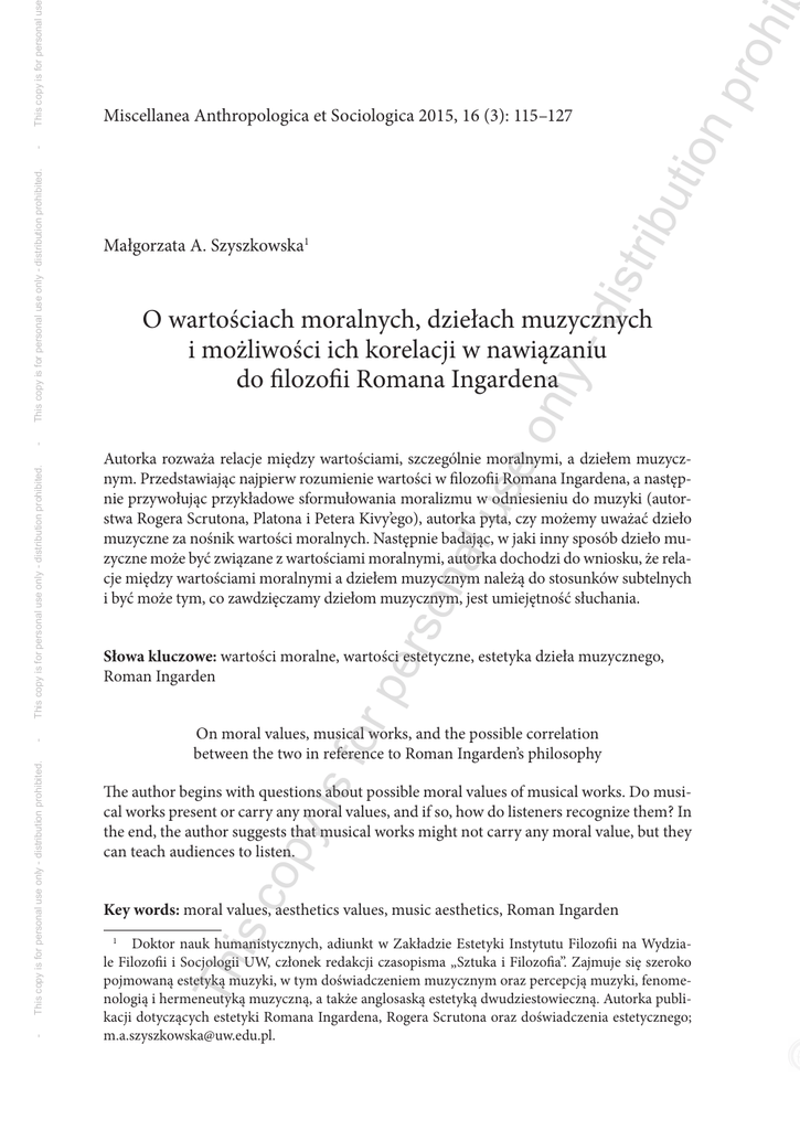 This copy is for personal use ibu tio np roh i dis tr Małgorzata A. Szyszkowska1 on ly - O wartościach moralnych, dziełach muzycznych i możliwości ich korelacji w nawiązaniu do filozofii Romana Ingardena - rso na lu se Autorka rozważa relacje między wartościami, szczególnie moralnymi, a dziełem muzycznym. Przedstawiając najpierw rozumienie wartości w filozofii Romana Ingardena, a następnie przywołując przykładowe sformułowania moralizmu w odniesieniu do muzyki (autorstwa Rogera Scrutona, Platona i Petera Kivy’ego), autorka pyta, czy możemy uważać dzieło muzyczne za nośnik wartości moralnych. Następnie badając, w jaki inny sposób dzieło muzyczne może być związane z wartościami moralnymi, autorka dochodzi do wniosku, że relacje między wartościami moralnymi a dziełem muzycznym należą do stosunków subtelnych i być może tym, co zawdzięczamy dziełom muzycznym, jest umiejętność słuchania. for pe Słowa kluczowe: wartości moralne, wartości estetyczne, estetyka dzieła muzycznego, Roman Ingarden On moral values, musical works, and the possible correlation between the two in reference to Roman Ingarden’s philosophy is c op y is The author begins with questions about possible moral values of musical works. Do musical works present or carry any moral values, and if so, how do listeners recognize them? In the end, the author suggests that musical works might not carry any moral value, but they can teach audiences to listen. Key words: moral values, aesthetics values, music aesthetics, Roman Ingarden 1 Doktor nauk humanistycznych, adiunkt w Zakładzie Estetyki Instytutu Filozofii na Wydziale Filozofii i Socjologii UW, członek redakcji czasopisma „Sztuka i Filozofia”. Zajmuje się szeroko pojmowaną estetyką muzyki, w tym doświadczeniem muzycznym oraz percepcją muzyki, fenomenologią i hermeneutyką muzyczną, a także anglosaską estetyką dwudziestowieczną. Autorka publikacji dotyczących estetyki Romana Ingardena, Rogera Scrutona oraz doświadczenia estetycznego; [email protected]. Th This copy is for personal use only - distribution prohibited. - This copy is for personal use only - distribution prohibited. - This copy is for personal use only - distribution prohibited. - Miscellanea Anthropologica et Sociologica 2015, 16 (3): 115–127 ibu tio np roh i Małgorzata A. Szyszkowska is c op y is for pe rso na lu se on ly - dis tr Mówienie o moralności dzieła muzycznego wydaje się absurdalne. Dzieło muzyczne nie czyni nic i nic nie dzieje się za pośrednictwem dzieła muzycznego. Jak pisał Clive Bell, „wszelka sztuka jest poza moralnością, albo inaczej każde dzieło sztuki jest moralne, ponieważ (…) jest bezpośrednim środkiem osiągnięcia dobra” (1914: 9). Bell miał tutaj na myśli dobro intelektualne. Zresztą, cała wypowiedź Bella miała na celu wymknięcie się dyskusji na temat moralności sztuki. Jednak, jak się okazuje, porzucenie dyskusji na temat związków sztuki i moralności jest właściwie niemożliwe. Powracają one w coraz to innym przebraniu. Zamiast ignorować tę problematykę, zapytajmy, co może oznaczać to, że dzieło muzyczne jest moralnie dobre. I co tak naprawdę mamy na myśli, mówiąc o moralności dzieła muzycznego? Dla celów przedstawianego tekstu moralność będę rozumieć dalej jako sferę wartości i ocen. Zatem, czy dzieło muzyczne podlega ocenom moralnym? Czy samo jest lub może być nośnikiem wartości moralnych? Czym właściwie są wartości moralne? Przed odpowiedzią na tak postawione pytanie należy wyjaśnić, co ma się na myśli, mówiąc o wartościach. Za Ingardenem chciałabym rozumieć wartości jako pewne ogólniki, których obecność w świecie może być ugruntowana w dwojaki sposób: podmiotowo lub przedmiotowo. Według filozofa należy odróżnić od siebie wartości skonkretyzowane, które mają swój fundament bytowy, istności wartości, które pozostają nawet wówczas, gdy fundament wartości zostaje całkowicie zniszczony, oraz ogólne idee wartości (Ingarden 1987: 167). Ingarden przyjmuje dalej, że wartości są ujmowanymi w percepcji odrębnymi, choć niesamodzielnymi bytowo, istnościami, które charakteryzuje złożona struktura. Ze względu na istnienie wielu rodzajów wartości niemożliwe jest ustalenie z góry ich charakteru bytowego. Wartości mogą być skonkretyzowane w przedmiotach realnych, np. przedmiotach fizycznych, zdarzeniach lub w przedmiotach intencjonalnych, np. dziełach muzycznych. Wartości dzieli Ingarden na trzy grupy. Są to (1) wartości witalne i przyjemnościowe, (2) wartości kulturowe, np. wartości estetyczne, obyczajowe i wartości poznania (tj. prawda lub fałsz), oraz (3) wartości moralne w sensie ścisłym (Ingarden 1966: 80–81 i 85). W tekście będą mnie interesować tylko dwie ostatnie grupy. Wartości, w rozumieniu Ingardena, nie dają się ująć ani przez ekonomiczne rozumienie (wartość jako oszacowanie), ani przez włożoną pracę, ani też jako wartości relacyjne. Świat wartości stanowi charakterystyczny element bytu człowieka i wyróżniającą go sferę zainteresowań (Gołaszewska 1971: 4). W sensie konkretnym wartości należy odróżnić zarówno od jakości, momentów psychicznych, jak i relacji. Ingarden nazywa wartości przedmiotowymi determinacjami szczególnego typu (1966: 84). Zawdzięczają one swoje istnienie jakościom przedmiotów, na których są ufundowane i w ten sposób zyskują swój fundament bytowy. W zależności od tego, na jakim przedmiocie są ufundowane, wartości mogą mieć różny charakter bytowy, niekoniecznie taki sam jak ów przedmiot. Wartości wyróżniają specyficzne momenty materialne i formalne oraz „wysokość” (coś może być dobre, lepsze, najlepsze, doskonałe itd.), a także „pozytywność” lub „negatywność”. Dla każdego Th This copy is for personal use This copy is for personal use only - distribution prohibited. This copy is for pers
