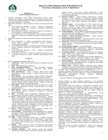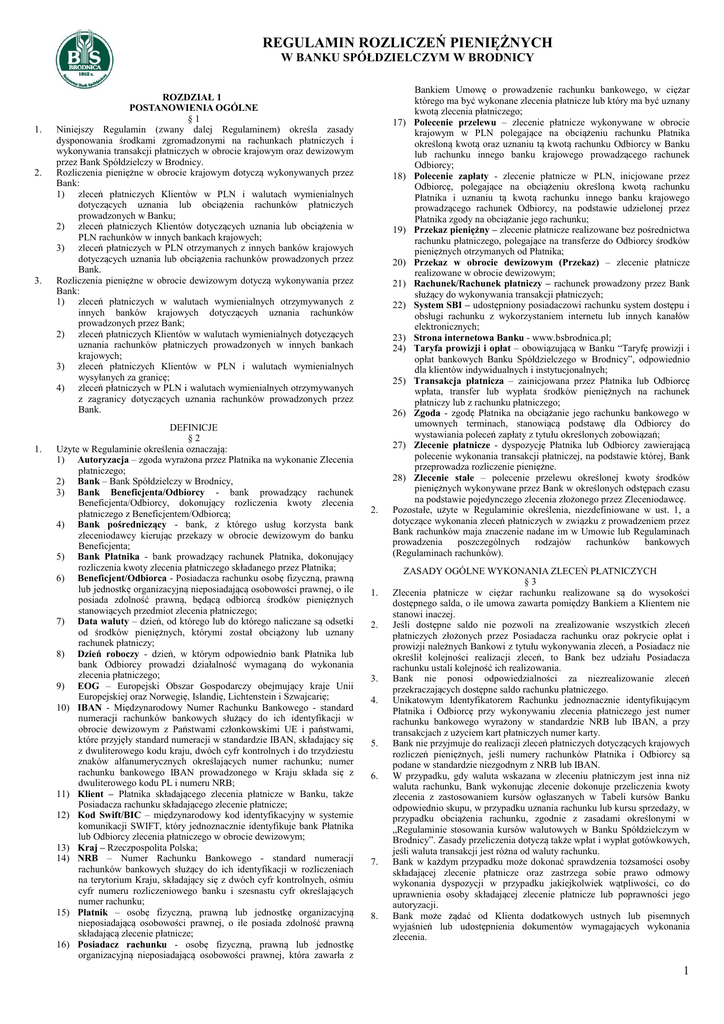 REGULAMIN ROZLICZEŃ PIENIĘŻNYCH W BANKU SPÓŁDZIELCZYM W BRODNICY 1. 2. 3. 1. ROZDZIAŁ 1 POSTANOWIENIA OGÓLNE §1 Niniejszy Regulamin (zwany dalej Regulaminem) określa zasady dysponowania środkami zgromadzonymi na rachunkach płatniczych i wykonywania transakcji płatniczych w obrocie krajowym oraz dewizowym przez Bank Spółdzielczy w Brodnicy. Rozliczenia pieniężne w obrocie krajowym dotyczą wykonywanych przez Bank: 1) zleceń płatniczych Klientów w PLN i walutach wymienialnych dotyczących uznania lub obciążenia rachunków płatniczych prowadzonych w Banku; 2) zleceń płatniczych Klientów dotyczących uznania lub obciążenia w PLN rachunków w innych bankach krajowych; 3) zleceń płatniczych w PLN otrzymanych z innych banków krajowych dotyczących uznania lub obciążenia rachunków prowadzonych przez Bank. Rozliczenia pieniężne w obrocie dewizowym dotyczą wykonywania przez Bank: 1) zleceń płatniczych w walutach wymienialnych otrzymywanych z innych banków krajowych dotyczących uznania rachunków prowadzonych przez Bank; 2) zleceń płatniczych Klientów w walutach wymienialnych dotyczących uznania rachunków płatniczych prowadzonych w innych bankach krajowych; 3) zleceń płatniczych Klientów w PLN i walutach wymienialnych wysyłanych za granicę; 4) zleceń płatniczych w PLN i walutach wymienialnych otrzymywanych z zagranicy dotyczących uznania rachunków prowadzonych przez Bank. DEFINICJE §2 Użyte w Regulaminie określenia oznaczają: 1) Autoryzacja – zgoda wyrażona przez Płatnika na wykonanie Zlecenia płatniczego; 2) Bank – Bank Spółdzielczy w Brodnicy, 3) Bank Beneficjenta/Odbiorcy - bank prowadzący rachunek Beneficjenta/Odbiorcy, dokonujący rozliczenia kwoty zlecenia płatniczego z Beneficjentem/Odbiorcą; 4) Bank pośredniczący - bank, z którego usług korzysta bank zleceniodawcy kierując przekazy w obrocie dewizowym do banku Beneficjenta; 5) Bank Płatnika - bank prowadzący rachunek Płatnika, dokonujący rozliczenia kwoty zlecenia płatniczego składanego przez Płatnika; 6) Beneficjent/Odbiorca - Posiadacza rachunku osobę fizyczną, prawną lub jednostkę organizacyjną nieposiadającą osobowości prawnej, o ile posiada zdolność prawną, będącą odbiorcą środków pieniężnych stanowiących przedmiot zlecenia płatniczego; 7) Data waluty – dzień, od którego lub do którego naliczane są odsetki od środków pieniężnych, którymi został obciążony lub uznany rachunek płatniczy; 8) Dzień roboczy - dzień, w którym odpowiednio bank Płatnika lub bank Odbiorcy prowadzi działalność wymaganą do wykonania zlecenia płatniczego; 9) EOG – Europejski Obszar Gospodarczy obejmujący kraje Unii Europejskiej oraz Norwegię, Islandię, Lichtenstein i Szwajcarię; 10) IBAN - Międzynarodowy Numer Rachunku Bankowego - standard numeracji rachunków bankowych służący do ich identyfikacji w obrocie dewizowym z Państwami członkowskimi UE i państwami, które przyjęły standard numeracji w standardzie IBAN, składający się z dwuliterowego kodu kraju, dwóch cyfr kontrolnych i do trzydziestu znaków alfanumerycznych określających numer rachunku; numer rachunku bankowego IBAN prowadzonego w Kraju składa się z dwuliterowego kodu PL i numeru NRB; 11) Klient – Płatnika składającego zlecenia płatnicze w Banku, także Posiadacza rachunku składającego zlecenie płatnicze; 12) Kod Swift/BIC – międzynarodowy kod identyfikacyjny w systemie komunikacji SWIFT, który jednoznacznie identyfikuje bank Płatnika lub Odbiorcy zlecenia płatniczego w obrocie dewizowym; 13) Kraj – Rzeczpospolita Polska; 14) NRB – Numer Rachunku Bankowego - standard numeracji rachunków bankowych służący do ich identyfikacji w rozliczeniach na terytorium Kraju, składający się z dwóch cyfr kontrolnych, ośmiu cyfr numeru rozliczeniowego banku i szesnastu cyfr określających numer rachunku; 15) Płatnik – osobę fizyczną, prawną lub jednostkę organizacyjną nieposiadającą osobowości prawnej, o ile posiada zdolność prawną składającą zlecenie płatnicze; 16) Posiadacz rachunku - osobę fizyczną, prawną lub jednostkę organizacyjną nieposiadającą osobowości prawnej, która zawarła z 2. 1. 2. 3. 4. 5. 6. 7. 8. Bankiem Umowę o prowadzenie rachunku bankowego, w ciężar którego ma być wykonane zlecenia płatnicze lub który ma być uznany kwotą zlecenia płatniczego; 17) Polecenie przelewu – zlecenie płatnicze wykonywane w obrocie krajowym w PLN polegające na obciążeniu rachunku Płatnika określoną kwotą oraz uznaniu tą kwotą rachunku Odbiorcy w Banku lub rachunku innego banku krajowego prowadzącego rachunek Odbiorcy; 18) Polecenie zapłaty - zlecenie płatnicze w PLN, inicjowane przez Odbiorcę, polegające na obciążeniu określoną kwotą rachunku Płatnika i uznaniu tą kwotą rachunku innego banku krajowego prowadzącego rachunek Odbiorcy, na podstawie udzielonej przez Płatnika zgody na obciążanie jego rachunku; 19) Przekaz pieniężny – zlecenie płatnicze realizowane bez pośrednictwa rachunku płatniczego, polegające na transferze do Odbiorcy środków pieniężnych otrzymanych od Płatnika; 20) Przekaz w obrocie dewizowym (Przekaz) – zlecenie płatnicze realizowane w obrocie dewizowym; 21) Rachunek/Rachunek płatniczy – rachunek prowadzony przez Bank służący do wykonywania transakcji płatniczych; 22) System SBI – udostępniony posiadaczowi rachunku system dostępu i obsługi rachunku z wykorzystaniem internetu lub innych kanałów elektronicznych; 23) Strona internetowa Banku - www.bsbrodnica.pl; 24) Taryfa prowizji i opłat – obowiązującą w Banku “Taryfę prowizji i opłat bankowych Banku Spółdzielczego w Brodnicy”, odpowiednio dla klientów indywidualnych i instytucjonalnych; 25) Transakcja płatnicza – zainicjowana przez Płatnika lub Odbiorcę wpłata, transfer lub wypłata środków pieniężnych na rachunek płatniczy lub z rachunku płatniczego; 26) Zgod