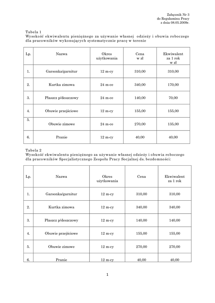 Załącznik Nr 3 do Regulaminu Pracy z dnia 08.05.2009r. Tabela 1 Wysoko ść ekwiw alentu pieniężnego za używanie w łasnej o dzieży i o buw ia ro bo c zego dla praco w nikó w wyko nując yc h systematyc znie prac ę w terenie Lp. Nazwa Okres użytkowania Cena w zł Ekwiwalent za 1 rok w zł 1. Garsonka/garnitur 12 mcy 310,00 310,00 2. Kurtka zimowa 24 mce 340,00 170,00 3. Płaszcz p/deszczowy 24 mce 140,00 70,00 4. Obuwie przejściowe 12 mcy 155,00 155,00 Obuwie zimowe 24 mce 270,00 135,00 Pranie 12 mcy 40,00 40,00 5. 6. Tabela 2 Wysoko ść ekw iwalentu pieniężnego za używanie w łasnej o dzieży i o buw ia ro bo czego dla praco w nikó w Spec jalistyc znego Zespo łu Prac y So c jalnej ds. bezdo mno ści: Lp. Nazwa Okres użytkowania Cena Ekwiwalent za 1 rok 1. Garsonka/garnitur 12 mcy 310,00 310,00 2. Kurtka zimowa 12 mcy 340,00 340,00 3. Płaszcz p/deszczowy 12 mcy 140,00 140,00 4. Obuwie przejściowe 12 mcy 155,00 155,00 5. Obuwie zimowe 12 mcy 270,00 270,00 6. Pranie 12 mcy 40,00 40,00 1