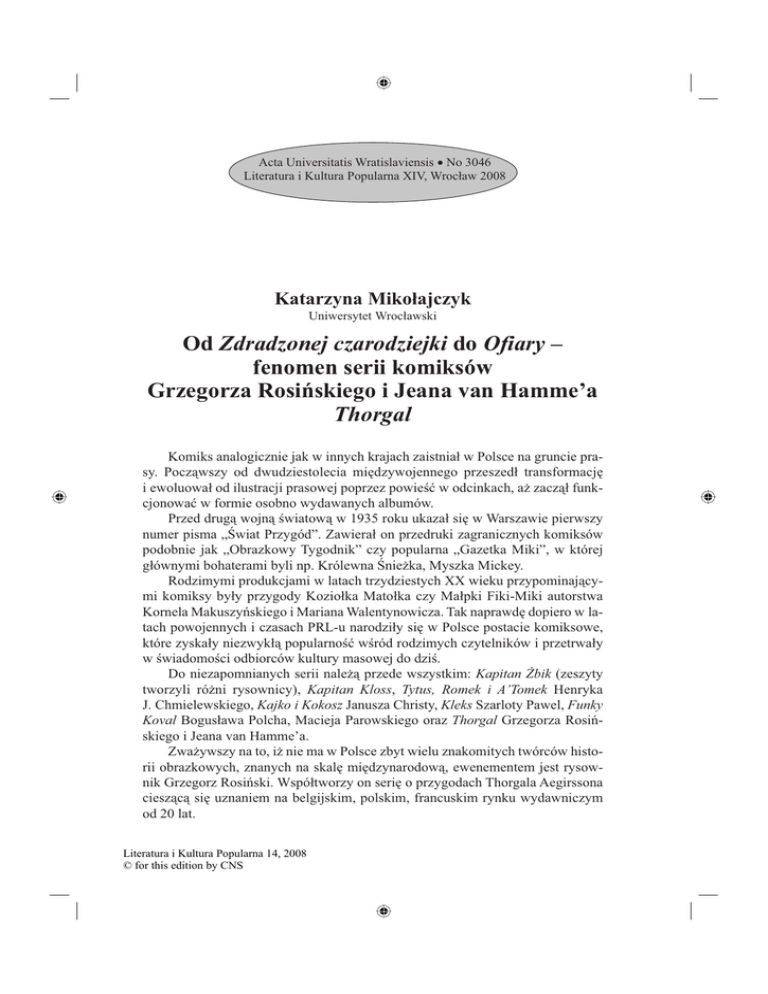 Acta Universitatis Wratislaviensis • No 3046 Literatura i Kultura Popularna XIV, Wrocław 2008 Katarzyna Mikołajczyk Uniwersytet Wrocławski Od Zdradzonej czarodziejki do Ofiary – fenomen serii komiksów Grzegorza Rosińskiego i Jeana van Hamme’a Thorgal Komiks analogicznie jak w innych krajach zaistniał w Polsce na gruncie prasy. Począwszy od dwudziestolecia międzywojennego przeszedł transformację i ewoluował od ilustracji prasowej poprzez powieść w odcinkach, aż zaczął funkcjonować w formie osobno wydawanych albumów. Przed drugą wojną światową w 1935 roku ukazał się w Warszawie pierwszy numer pisma „Świat Przygód”. Zawierał on przedruki zagranicznych komiksów podobnie jak „Obrazkowy Tygodnik” czy popularna „Gazetka Miki”, w której głównymi bohaterami byli np. Królewna Śnieżka, Myszka Mickey. Rodzimymi produkcjami w latach trzydziestych XX wieku przypominającymi komiksy były przygody Koziołka Matołka czy Małpki Fiki-Miki autorstwa Kornela Makuszyńskiego i Mariana Walentynowicza. Tak naprawdę dopiero w latach powojennych i czasach PRL-u narodziły się w Polsce postacie komiksowe, które zyskały niezwykłą popularność wśród rodzimych czytelników i przetrwały w świadomości odbiorców kultury masowej do dziś. Do niezapomnianych serii należą przede wszystkim: Kapitan Żbik (zeszyty tworzyli różni rysownicy), Kapitan Kloss, Tytus, Romek i A’Tomek Henryka J. Chmielewskiego, Kajko i Kokosz Janusza Christy, Kleks Szarloty Pawel, Funky Koval Bogusława Polcha, Macieja Parowskiego oraz Thorgal Grzegorza Rosińskiego i Jeana van Hamme’a. Zważywszy na to, iż nie ma w Polsce zbyt wielu znakomitych twórców historii obrazkowych, znanych na skalę międzynarodową, ewenementem jest rysownik Grzegorz Rosiński. Współtworzy on serię o przygodach Thorgala Aegirssona cieszącą się uznaniem na belgijskim, polskim, francuskim rynku wydawniczym od 20 lat. Literatura i Kultura Popularna 14, 2008 © for this edition by CNS 142 Katarzyna Mikołajczyk Grzegorz Rosiński jest, jak dotychczas, zdecydowanie najwybitniejszym polskim rysownikiem. Urodził się 3 sierpnia 1941 roku w Stalowej Woli. Ukończył liceum plastyczne, następnie podjął studia na Akademii Sztuk Pięknych w Warszawie, gdzie w 1966 roku zrobił dyplom z ilustracji książkowej w pracowni Marcina Szancera1. W jednym z wywiadów Rosiński wspomina czas, kiedy opuścił miejsce urodzenia, przeniósł się do Wrocławia i po raz pierwszy zetknął się z komiksem: „Ale już w 1946 roku wyprowadziliśmy się stamtąd do Wrocławia. Mieszkałem najpierw na Psim Polu... już sama nazwa mogła zadecydować o moim późniejszym zamiłowaniu do średniowiecza, rycerzy, historii Polski. Potem mieszkałem na Sępolnie, tam zacząłem chodzić do szkoły i zakochałem się w książkach obrazkowych. Wygrzebywałem je prosto z gruzów, na przykład piękną Biblię z ilustracjami Gustave’a Doré. [...] No i tam przeczytałem pierwszy komiks – w 1949 roku trafił w moje ręce numer francuskiego pisma »Vaillant«”2. Po ukończeniu warszawskiej ASP Rosiński w celach zarobkowych zajmował się robieniem plakatów: „Święta takie jak 22 Lipca i 1 Maja były dla plastyka tym, czym żniwa dla rolnika. To były najlepiej płatne chałtury”. Projektował też okładki książek: „Dla Krajowej Agencji Wydawniczej zilustrowałem na przykład 14 tomów serii »Piegowaty, uwaga!« Kazimierza Dębnickiego, to były książki dla dzieci o II wojnie światowej. Robiłem też bardzo wiele rzeczy anonimowo, na przykład podręczniki szkolne. [...] Zilustrowałem podręcznik We Learn English Zawadzkiej i zeszyty ćwiczeń dla licealistów”3. Na początku swej przygody z komiksem Rosiński współtworzył serię Kapitan Żbik drukowaną w latach siedemdziesiątych przez wydawnictwo „Sport i Turystyka”. Poza tym przygotował cykl albumów Legendarna historia Polski. Z perspektywy czasu rysownik wspomina: „Historia zawsze była w Polsce pożywką twórców. Zwłaszcza gdy teraźniejszość nas rozczarowywała albo kiedy nie można było o niej pisać. Wtedy pojawiał się kostium historyczny. Komiks także inspirował się historią – choćby seria legend polskich, którą współtworzyłem i która służyła celom edukacyjnym”4. W 1975 roku ukazał się komiks Od Walii do Brazylii. X Piłkarskie Mistrzostwa Świata opowiadający o polskiej reprezentacji piłki nożnej, która brała udział w mistrzostwach w pamiętnym 1974 roku. Już pierwszy kadr tego komiksu napawa dumą, optymizmem zagorzałych sympatyków tej dyscypliny, a szczególnie napisy w dymkach głoszące: „Na olimpiadzie w Monachium Polska zdobyła złoty medal! Deyna strzela zwycięską bramkę”5. Przełomowym czasem w życiu artystycznym rysownika okazał się okres 1968–1981. W 1968 roku zaczął kierować od strony artystycznej pierwszym pol1 W. Obremski, Krótka historia sztuki komiksu w Polsce 1945–2003, Toruń 2005, s. 56. W. Orliński, Thorgal to ja, „Duży Format” 2004, nr 18, s. 14. 3 Ibidem, s. 15 4 K. Nowak, Grzegorz Rosiński gwiazdą festiwalu komiksu w Belgii, „Dziennik” 2006, nr 33, 2 s. 29. 5 G. Rosiński, Od Walii do Brazylii. X Piłkarskie Mistrzostwa Świata, Warszawa 1975, s. 1. Literatura i Kultura Popularna 14, 2008 © for this edition by CNS Fenomen serii komiksów G. Rosińskiego i J. van Hamme’a 143 skim miesięcznikiem komiksowym „Relax”, nawiązał współpracę z francuskimi pismami „Spirou”, „Le Trombone Illustré”, a w 1976 roku spotkał na swej drodze scenarzystę z Belgii – Jeana van Hamme’a, z którym zaczął tworzyć serię o przygodach dzielnego Thorgala Aegirssona. W wywiadzie przeprowadzonym przez Macieja Wesołowskiego dla miesięcznika „CKM” w maju 1999 roku Rosiński wspomina początki współpracy z belgijskim scenarzystą: „W latach 70. nawiązałem współpracę z Jeanem van Hamme’em. On mi zaufał, zaczął pisać mi
