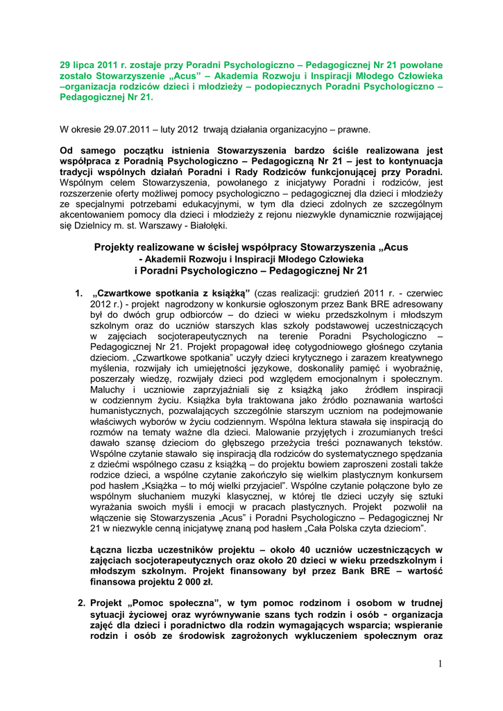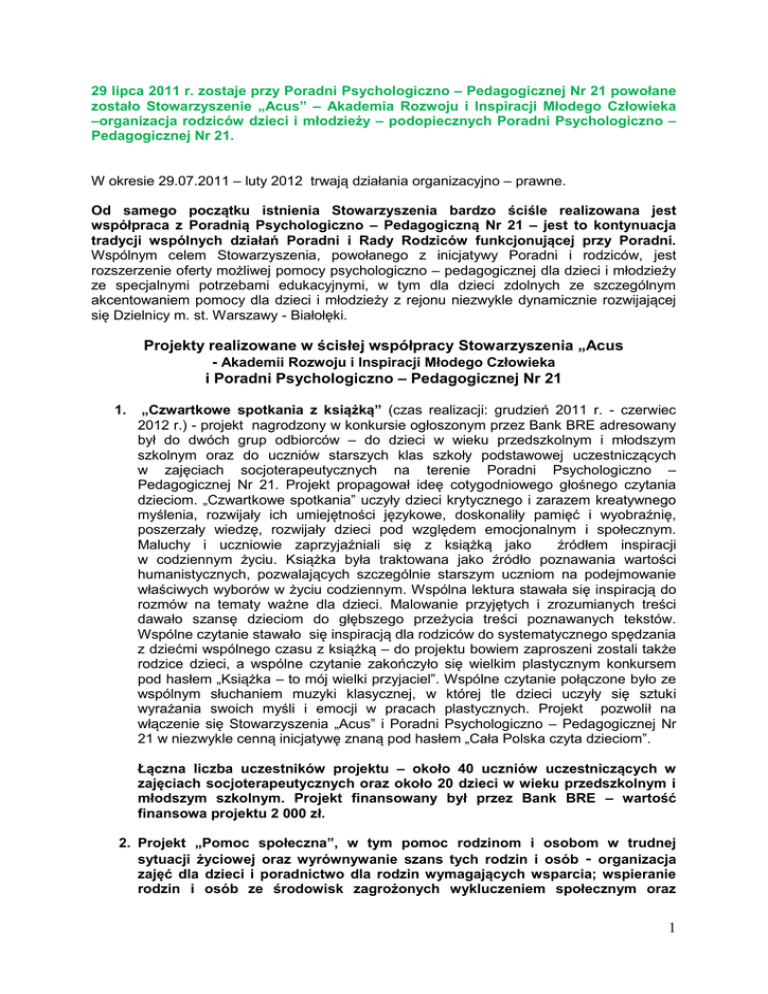 29 lipca 2011 r. zostaje przy Poradni Psychologiczno – Pedagogicznej Nr 21 powołane zostało Stowarzyszenie „Acus” – Akademia Rozwoju i Inspiracji Młodego Człowieka –organizacja rodziców dzieci i młodzieży – podopiecznych Poradni Psychologiczno – Pedagogicznej Nr 21. W okresie 29.07.2011 – luty 2012 trwają działania organizacyjno – prawne. Od samego początku istnienia Stowarzyszenia bardzo ściśle realizowana jest współpraca z Poradnią Psychologiczno – Pedagogiczną Nr 21 – jest to kontynuacja tradycji wspólnych działań Poradni i Rady Rodziców funkcjonującej przy Poradni. Wspólnym celem Stowarzyszenia, powołanego z inicjatywy Poradni i rodziców, jest rozszerzenie oferty możliwej pomocy psychologiczno – pedagogicznej dla dzieci i młodzieży ze specjalnymi potrzebami edukacyjnymi, w tym dla dzieci zdolnych ze szczególnym akcentowaniem pomocy dla dzieci i młodzieży z rejonu niezwykle dynamicznie rozwijającej się Dzielnicy m. st. Warszawy - Białołęki. Projekty realizowane w ścisłej współpracy Stowarzyszenia „Acus - Akademii Rozwoju i Inspiracji Młodego Człowieka i Poradni Psychologiczno – Pedagogicznej Nr 21 1. „Czwartkowe spotkania z książką” (czas realizacji: grudzień 2011 r. - czerwiec 2012 r.) - projekt nagrodzony w konkursie ogłoszonym przez Bank BRE adresowany był do dwóch grup odbiorców – do dzieci w wieku przedszkolnym i młodszym szkolnym oraz do uczniów starszych klas szkoły podstawowej uczestniczących w zajęciach socjoterapeutycznych na terenie Poradni Psychologiczno – Pedagogicznej Nr 21. Projekt propagował ideę cotygodniowego głośnego czytania dzieciom. „Czwartkowe spotkania” uczyły dzieci krytycznego i zarazem kreatywnego myślenia, rozwijały ich umiejętności językowe, doskonaliły pamięć i wyobraźnię, poszerzały wiedzę, rozwijały dzieci pod względem emocjonalnym i społecznym. Maluchy i uczniowie zaprzyjaźniali się z książką jako źródłem inspiracji w codziennym życiu. Książka była traktowana jako źródło poznawania wartości humanistycznych, pozwalających szczególnie starszym uczniom na podejmowanie właściwych wyborów w życiu codziennym. Wspólna lektura stawała się inspiracją do rozmów na tematy ważne dla dzieci. Malowanie przyjętych i zrozumianych treści dawało szansę dzieciom do głębszego przeżycia treści poznawanych tekstów. Wspólne czytanie stawało się inspiracją dla rodziców do systematycznego spędzania z dziećmi wspólnego czasu z książką – do projektu bowiem zaproszeni zostali także rodzice dzieci, a wspólne czytanie zakończyło się wielkim plastycznym konkursem pod hasłem „Książka – to mój wielki przyjaciel”. Wspólne czytanie połączone było ze wspólnym słuchaniem muzyki klasycznej, w której tle dzieci uczyły się sztuki wyrażania swoich myśli i emocji w pracach plastycznych. Projekt pozwolił na włączenie się Stowarzyszenia „Acus” i Poradni Psychologiczno – Pedagogicznej Nr 21 w niezwykle cenną inicjatywę znaną pod hasłem „Cała Polska czyta dzieciom”. Łączna liczba uczestników projektu – około 40 uczniów uczestniczących w zajęciach socjoterapeutycznych oraz około 20 dzieci w wieku przedszkolnym i młodszym szkolnym. Projekt finansowany był przez Bank BRE – wartość finansowa projektu 2 000 zł. 2. Projekt „Pomoc społeczna”, w tym pomoc rodzinom i osobom w trudnej sytuacji życiowej oraz wyrównywanie szans tych rodzin i osób - organizacja zajęć dla dzieci i poradnictwo dla rodzin wymagających wsparcia; wspieranie rodzin i osób ze środowisk zagrożonych wykluczeniem społecznym oraz 1 wzmocnienie rozwoju lokalnych sieci wsparcia dla osób ubogich i zagrożonych wykluczeniem społecznym (czas realizacji 1.07.2012 - 31.12.2012) – projekt nagrodzony został i rekomendowany do realizacji w ramach konkursu dla organizacji pozarządowych, ogłoszonego przez Wojewodę Mazowieckiego. Adresowany był do uczniów szkół gimnazjalnych oraz uczniów ze starszych klas SP, zagrożonych problemem wykluczenia społecznego, pochodzących ze środowisk patologicznych, z rodzin niewydolnych wychowawczo z problemami w zakresie funkcjonowania społecznego. Wytypowani do pracy uczniowie zostali objęci pomocą psychologiczną, socjoterapeutyczną lub psychoterapeutyczną. Pomoc psychologiczną w postaci pracy indywidualnej lub możliwości udziału w warsztatach umiejętności wychowawczych, ewentualnie w warsztatach psychoedukacyjnych, uzyskali też rodzice uczniów. W ramach koniecznej integracji działań w procesie pomocy dzieciom i młodzieży prowadzona była też praca z nauczycielami ze szkół podstawowych i gimnazjalnych oraz z wychowawcami z placówek opiekuńczo – wychowawczych. Łączna liczba odbiorców projektu: 1. uczniowie – około 950 osób, 2. rodzice / opiekunowie prawni – 60 osób oraz 10 rodzin, 3. nauczyciele i wychowawcy – około 70 osób, konsultacje okołowarsztatowe dla wychowawców z 48 klas, dla których zrealizowano warsztaty psychoedukacyjne. Łącznie – ok. 1100 osób 4. liczba szkół podstawowych objętych działaniami projektowymi – 2 SP, 6 szkół gimnazjalnych, białołęcki Dom Dziecka, podopieczni dzielnicowej Poradni Psychologiczno – Pedagogicznej Nr 21 oraz rodziny objęte pomocą przez Ośrodek Pomocy Społecznej. Wartość finansowa projektu – 18 000 zł 3. Projekt „Krok po kroku – na wspólnej drodze w budowaniu dobrej przyszłości” wspólnego autorstwa Poradni Psychologiczno – Pedagogicznej Nr 21 – Partnera Stowarzyszenia „Acus” i Stowarzyszenia „Acus” (Stowarzyszenie było także współrealizatorem podejmowanych działań – czas realizacji projektu: 1.09.2012 – 31.12.2012 r.) – projekt został rekomendowany do realizacji przez Biuro Polityki Społecznej m. st. Warszawy, a sfinansowany przez Wydział Spraw Społecznych i Zdrowia w Dzielnicy Białołęka. Projekt również adresowany był