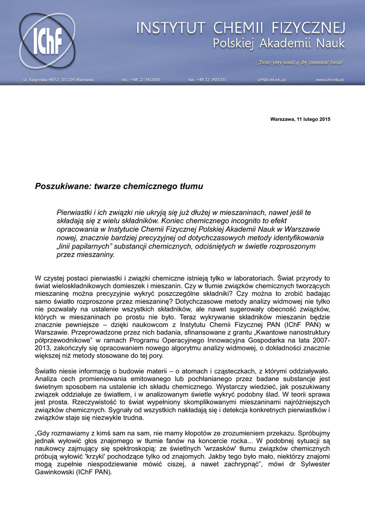 Warszawa, 11 lutego 2015 Poszukiwane: twarze chemicznego tłumu Pierwiastki i ich związki nie ukryją się już dłużej w mieszaninach, nawet jeśli te składają się z wielu składników. Koniec chemicznego incognito to efekt opracowania w Instytucie Chemii Fizycznej Polskiej Akademii Nauk w Warszawie nowej, znacznie bardziej precyzyjnej od dotychczasowych metody identyfikowania „linii papilarnych” substancji chemicznych, odciśniętych w świetle rozproszonym przez mieszaniny. W czystej postaci pierwiastki i związki chemiczne istnieją tylko w laboratoriach. Świat przyrody to świat wieloskładnikowych domieszek i mieszanin. Czy w tłumie związków chemicznych tworzących mieszaninę można precyzyjnie wykryć poszczególne składniki? Czy można to zrobić badając samo światło rozproszone przez mieszaninę? Dotychczasowe metody analizy widmowej nie tylko nie pozwalały na ustalenie wszystkich składników, ale nawet sugerowały obecność związków, których w mieszaninach po prostu nie było. Teraz wykrywanie składników mieszanin będzie znacznie pewniejsze – dzięki naukowcom z Instytutu Chemii Fizycznej PAN (IChF PAN) w Warszawie. Przeprowadzone przez nich badania, sfinansowane z grantu „Kwantowe nanostruktury półprzewodnikowe” w ramach Programu Operacyjnego Innowacyjna Gospodarka na lata 20072013, zakończyły się opracowaniem nowego algorytmu analizy widmowej, o dokładności znacznie większej niż metody stosowane do tej pory. Światło niesie informację o budowie materii – o atomach i cząsteczkach, z którymi oddziaływało. Analiza cech promieniowania emitowanego lub pochłanianego przez badane substancje jest świetnym sposobem na ustalenie ich składu chemicznego. Wystarczy wiedzieć, jak poszukiwany związek oddziałuje ze światłem, i w analizowanym świetle wykryć podobny ślad. W teorii sprawa jest prosta. Rzeczywistość to świat wypełniony skomplikowanymi mieszaninami najróżniejszych związków chemicznych. Sygnały od wszystkich nakładają się i detekcja konkretnych pierwiastków i związków staje się niezwykle trudna. „Gdy rozmawiamy z kimś sam na sam, nie mamy kłopotów ze zrozumieniem przekazu. Spróbujmy jednak wyłowić głos znajomego w tłumie fanów na koncercie rocka... W podobnej sytuacji są naukowcy zajmujący się spektroskopią: ze świetlnych 'wrzasków' tłumu związków chemicznych próbują wyłowić 'krzyki' pochodzące tylko od znajomych. Jakby tego było mało, niektórzy znajomi mogą zupełnie niespodziewanie mówić ciszej, a nawet zachrypnąć”, mówi dr Sylwester Gawinkowski (IChF PAN). Gdyby problemem było wyłącznie nakładanie się „świetlnych wrzasków”, wyłuskanie sygnatury konkretnej substancji chemicznej nie byłoby specjalnie trudne. W rzeczywistych pomiarach sprawy się jednak mocno komplikują. Nieuniknione błędy pomiarowe – w tym wynikające z samej fizyki oddziaływania światła z materią – powodują, że zarejestrowane promieniowanie, nawet jeśli pochodzi tylko od jednej substancji, zawsze ma strukturę nieco inną niż teoretyczny wzorzec. Na dodatek poszukiwanym nie musi być jeden związek, a kilka ze znanej puli. Jakby tego było mało, wkład każdego ze związków w strukturę analizowanego światła może być różny: w przypadku jednej substancji słabszy, w przypadku innej silniejszy. „Przy badaniu struktury zarejestrowanego światła – a więc podczas analizy spektralnej – cała sztuka polega na tym, aby widmie mieszaniny wychwycić tylko najistotniejsze elementy charakterystyczne dla danej substancji. Takie podejście przypomina nieco metody automatycznego wykrywania twarzy, stosowane np. w systemach kontroli na lotniskach. Nie porównuje się tam wyglądu każdego szczegółu twarzy, lecz szuka podobieństw w prostych zależnościach, np. w rozstawie oczu, położeniu ust czy końca nosa. Wtedy przestaje być ważne, czy poszukiwany ma czapkę czy nie, czy się opalił lub zgolił wąsy”, wyjaśnia dr inż. Tomasz Roliński (IChF PAN). Kierując się tą ideą, fizycy z IChF PAN skonstruowali metodę analizy, która jest wrażliwa nie na intensywność linii widmowych światła przechodzącego przez mieszaninę, a na ich wzajemne położenia i kształty. Aby sprawdzić jej skuteczność, przeprowadzono szereg testów. Jeden z naukowców przygotowywał mieszaniny złożone z kilku aminokwasów wybieranych losowo ze znanej puli 20 związków. Liczba składników każdej mieszaniny wahała się od dwóch do ośmiu, przy czym objętości składników były podobne (co wcale nie oznacza, że wszystkie substancje jednakowo silnie oddziaływały ze światłem!). Tak przygotowaną mieszaninę analizował inny naukowiec. Testowane mieszaniny poddano najpierw analizie spektralnej z zastosowaniem dotychczasowej, popularnej metody najmniejszych kwadratów, znanej także jako NLS. W 7 przypadkach na 20 nie wykryto w mieszaninach jednego składnika, w jednym nawet dwóch. Co więcej, w dwóch mieszaninach analiza wykazała obecność aminokwasów, których w nich nie było. „W przypadku naszej metody wyniki analizy tych samych widm były jakościowo lepsze”, podkreśla dr Roliński i precyzuje: „Na 20 przebadanych mieszanin ich skład zidentyfikowaliśmy poprawnie w 18 przypadkach. W dwóch pozostałych mieszaninach, jednej złożonej z pięciu składników, a drugiej z ośmiu, nie wykryliśmy pojedynczego składnika. Ani razu nie zidentyfikowaliśmy związku, którego w mieszaninie nie było”. Nowa metoda analizy widm mieszanin znajdzie zastosowanie m.in. w tak wyrafinowanych technikach badawczych, jak wzmacniana powierzchniowo spektroskopia ramanowska (Surface Enhanced Raman Spectroscopy, SERS). Szczególny charakter spektroskopii SERS wynika z faktu, że sygnały emitowane przez cząsteczki chemiczne mogą zostać tu wzmocnione setki tysięcy, a nawet miliony razy. Tak duże wzmocnienie pozwala myśleć o konstruowaniu detektorów zdolnych do wykrywa