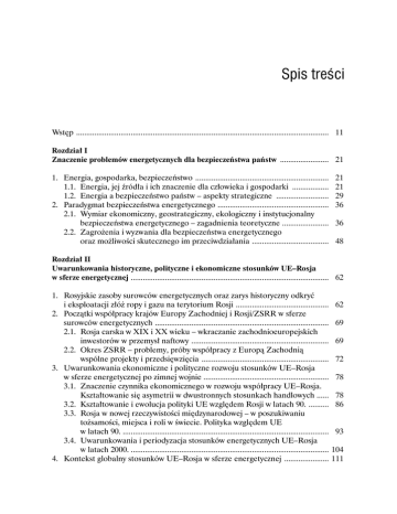 Spis treści Wstęp . ............................................................................................................................ 11 Rozdział I Znaczenie problemów energetycznych dla bezpieczeństwa państw ......................... 21 1. Energia, gospodarka, bezpieczeństwo . ................................................................. 1.1. Energia, jej źródła i ich znaczenie dla człowieka i gospodarki ................... 1.2. Energia a bezpieczeństwo państw – aspekty strategiczne ........................... 2. Paradygmat bezpieczeństwa energetycznego . ...................................................... 2.1. Wymiar ekonomiczny, geostrategiczny, ekologiczny i instytucjonalny bezpieczeństwa energetycznego – zagadnienia teoretyczne . ...................... 2.2. Zagrożenia i wyzwania dla bezpieczeństwa energetycznego oraz możliwości skutecznego im przeciwdziałania . ..................................... 21 21 29 36 36 48 Rozdział II Uwarunkowania historyczne, polityczne i ekonomiczne stosunków UE–Rosja w sferze energetycznej . ................................................................................................. 62 1. Rosyjskie zasoby surowców energetycznych oraz zarys historyczny odkryć i eksploatacji złóż ropy i gazu na terytorium Rosji . ............................................. 62 2. Początki współpracy krajów Europy Zachodniej i Rosji/ZSRR w sferze surowców energetycznych . ..................................................................................... 69 2.1. Rosja carska w XIX i XX wieku – wkraczanie zachodnioeuropejskich inwestorów w przemysł naftowy . ................................................................... 69 2.2. Okres ZSRR – problemy, próby współpracy z Europą Zachodnią wspólne projekty i przedsięwzięcia . .............................................................. 72 3. Uwarunkowania ekonomiczne i polityczne rozwoju stosunków UE–Rosja w sferze energetycznej po zimnej wojnie .............................................................. 78 3.1. Znaczenie czynnika ekonomicznego w rozwoju współpracy UE–Rosja. Kształtowanie się asymetrii w dwustronnych stosunkach handlowych ...... 78 3.2. Kształtowanie i ewolucja polityki UE względem Rosji w latach 90. . ......... 86 3.3. Rosja w nowej rzeczywistości międzynarodowej – w poszukiwaniu tożsamości, miejsca i roli w świecie. Polityka względem UE w latach 90. ...................................................................................................... 93 3.4. Uwarunkowania i periodyzacja stosunków energetycznych UE–Rosja w latach 2000. ..................................................................................................104 4. Kontekst globalny stosunków UE–Rosja w sferze energetycznej . .....................111 Rozdział III Tworzenie ram instytucjonalnych współpracy UE i Rosji w sferze bezpieczeństwa energetycznego . ...................................................................120 1. Znaczenie Traktatu Karty Energetycznej oraz Protokołu Tranzytowego w stosunkach energetycznych UE–Rosja ..............................................................120 1.1. Traktat Karty Energetycznej jako instrument prawa międzynarodowego i fakt o znaczeniu politycznym – geneza powstania oraz charakterystyka dokumentu . .....................................................................................................120 1.2. Traktat Karty Energetycznej i Protokół Tranzytowy a interesy Rosji . .......130 2. Porozumienie o Partnerstwie i Współpracy oraz Wymiar Północny polityki Unii Europejskiej – jako preludium do zinstytucjonalizowanego Dialogu Energetycznego . .......................................................................................137 2.1. Regulacje Porozumienia o Partnerstwie i Współpracy w sferze energii . ....137 2.2. Energia w Wymiarze Północnym polityki UE – struktury współpracy Rosji i UE w regionie . ....................................................................................140 3. Kształtowanie się i ewolucja zinstytucjonalizowanego Dialogu Energetycznego i partnerstwa energetycznego UE–Rosja . ................................147 3.1. Geneza i obszary tematyczne Dialogu Energetycznego ..............................147 3.2. Struktura instytucjonalna Dialogu Energetycznego ....................................154 3.3. Cele i interesy stron w Dialogu Energetycznym i problemy w stworzeniu partnerstwa energetycznego ...................................................159 Rozdział IV Bezpieczeństwo energetyczne UE i Rosji. Kształtowanie strategii energetycznych i współzależności w sferze energetycznej ....................................................................174 1. Bezpieczeństwo energetyczne Rosji ......................................................................174 1.1. Znaczenie sektora paliwowo-energetycznego dla rozwoju rosyjskiej gospodarki. Bilans energetyczny Rosji ..........................................................174 1.2. Charakterystyka głównych wyzwań sektora naftowego ...............................181 1.3. Sytuacja w sektorze gazu ziemnego ...............................................................189 1.4. Sektor energii elektrycznej – wyzwania dla bezpieczeństwa energetycznego kraju ......................................................................................196 2. Strategia bezpieczeństwa energetycznego Rosji – europejski kierunek w rosyjskiej polityce eksportu surowców energetycznych . ..................................201 2.1. Kształtowanie strategii energetycznej Rosji. Konkurujące koncepcje rosyjskiej polityki energetycznej ....................................................................201 2.2. Zapewnianie bezpieczeństwa energetycznego – wymiar wewnętrzny polityki energetycznej ...................................................................................