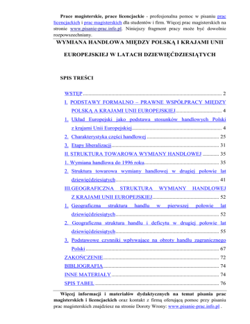 Prace magisterskie, prace licencjackie - profesjonalna pomoc w pisaniu prac licencjackich i prac magisterskich dla studentów i firm. Więcej prac magisterskich na stronie www.pisanie-prac.info.pl. Niniejszy fragment pracy może być dowolnie rozpowszechniany. WYMIANA HANDLOWA MIĘDZY POLSKĄ I KRAJAMI UNII EUROPEJSKIEJ W LATACH DZIEWIĘĆDZIESIĄTYCH SPIS TREŚCI WSTĘP ...................................................................................................... 2 I. PODSTAWY FORMALNO – PRAWNE WSPÓŁPRACY MIĘDZY POLSKĄ A KRAJAMI UNII EUROPEJSKIEJ.................................. 4 1. Układ Europejski jako podstawa stosunków handlowych Polski z krajami Unii Europejskiej.................................................................. 4 2. Charakterystyka części handlowej ..................................................... 25 3. Etapy liberalizacji............................................................................... 31 II. STRUKTURA TOWAROWA WYMIANY HANDLOWEJ ............ 35 1. Wymiana handlowa do 1996 roku....................................................... 35 2. Struktura towarowa wymiany handlowej w drugiej połowie lat dziewięćdziesiątych............................................................................ 41 III.GEOGRAFICZNA STRUKTURA WYMIANY HANDLOWEJ Z KRAJAMI UNII EUROPEJSKIEJ................................................. 52 1. Geograficzna struktura handlu w pierwszej połowie lat dziewięćdziesiątych............................................................................ 52 2. Geograficzna struktura handlu i deficytu w drugiej połowie lat dziewięćdziesiątych............................................................................ 55 3. Podstawowe czynniki wpływające na obroty handlu zagranicznego Polski .................................................................................................. 67 ZAKOŃCZENIE..................................................................................... 72 BIBLIOGRAFIA..................................................................................... 74 INNE MATERIAŁY ............................................................................... 74 SPIS TABEL ........................................................................................... 76 Więcej informacji i materiałów dydaktycznych na temat pisania prac magisterskich i licencjackich oraz kontakt z firmą oferującą pomoc przy pisaniu prac magisterskich znajdziesz na stronie Doroty Wrony: www.pisanie-prac.info.pl . I. WSTĘP Z członkostwa Polski w Unii Europejskiej wynikać mogą dla Polski, jak i krajów Unii, z jednej strony określone szanse i korzyści, z drugiej wysokie koszty i zagrożenia. Przedstawiona w pracy analiza wymiany handlowej między Polską a krajami Unii Europejskiej obejmuje lata dziewięćdziesiąte, a więc prawie pełne dziesięciolecie. Tak długi okres pozwala na obiektywne przedstawienie wymiany handlowej Polski oraz wyciągnięcie wniosków dotyczących omawianego tematu Praca składa się z trzech rozdziałów. W pierwszym rozdziale omówiono podstawy formalno-prawne regulujące stosunki Polski z krajami Unii, ze szczególnym uwzględnieniem części handlowej Układu Europejskiego. W rozdziale drugim przedstawiona została analiza struktury towarowej wymiany handlowej Polski w latach dziewięćdziesiątych. W części pierwszej tego rozdziału przedstawiono strukturę towarową eksportu i importu w pierwszej połowie lat dziewięćdziesiątych. W dalszej części drugiego rozdziału przedstawiono saldo wymiany handlowej oraz dynamikę eksportu i importu. Dalsza część tego rozdziału zawiera dane dotyczące drugiej połowy lat dziewięćdziesiątych wymiany towarowej. W ostatniej części omówiono strukturę przedmiotową obrotów w handlu zagranicznym do końca lat dziewięćdziesiątych. W rozdziale trzecim przedstawiono geograficzną strukturę wymiany towarowej Polski z krajami Unii Europejskiej. Wskazano na podstawowe rynki eksportu i importu Polski do 1999 roku. Omówiono najważniejszych partnerów Polski w handlu zagranicznym oraz zachodzące zmiany w strukturze geograficznej w latach dziewięćdziesiątych W części ostatniej tego rozdziału wskazano na najważniejsze czynniki wpływające na wymianę handlową Polski z omawianymi krajami. Pracę przygotowano w oparciu literaturę naukową powołując się na takie autorytety jak E. Kawecka-Wytrzykowska, B. Mucha-Leszko, E. Synowiec 2 i wielu innych. Znaczna część pracy oparta jest na między innymi takich danych jak Roczniki Statystyczne, opracowania IKCHZ zamieszczone w internecie itp. 3 II. PODSTAWY FORMALNO–PRAWNE WSPÓŁPRACY MIĘDZY POLSKĄ A KRAJAMI UNII EUROPEJSKIEJ 1. Układ Europejski jako podstawa stosunków handlowych Polski z krajami Unii Europejskiej Przed zawarciem Układu o stowarzyszeniu ramy wzajemnych stosunków gospodarczych pomiędzy Polską a Wspólnotami i ich państwami członkowskimi wyznaczały umowy dwustronne i wielostronne. W ramach Układu Ogólnego w Sprawie Handlu i Ceł (GATT) Polska i Wspólnota przyznały sobie wzajemnie klauzulę największego uprzywilejowania oraz uzgodniły, że będą eliminowały istniejące ograniczenia ilościowe w handlu. W ramach układu GATT oraz licznych protokołów i umów dotyczących jego stosowania ustalone zostały również zasady dotyczące antydumpingu i zasad udzielania licencji. W zakresie stosunków dwustronnych Polska zawarła ze Wspólnotą Europejską w dniu 19 XI 1989 r. Umowę o handlu i współpracy handlowej oraz gospodarczej. Od początku jednak umowa ta była traktowana jako pewien etap na drodze do stowarzyszenia, a w dalszej perspektywie - członkostwa Wspólnoty Europejskiej. Rokowania w celu zawarcia Układu Stowarzyszeniowego rozpoczęły się 22 XII 1990 r. i toczyły się równocześnie z negocjacjami prowadzonymi z ówczesną Czechosłowacją i Węgrami. Efektem trwających niecały rok negocjacji było zawarci