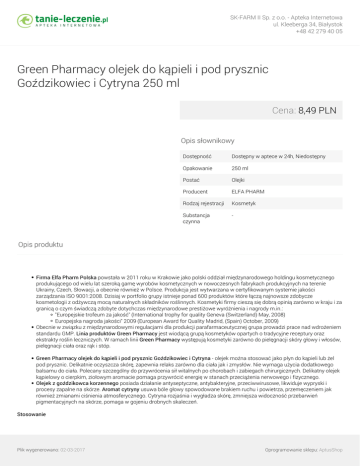 SK-FARM II Sp. z o.o. - Apteka Internetowa ul. Kleeberga 34, Białystok +48 42 279 40 05 Green Pharmacy olejek do kąpieli i pod prysznic Goździkowiec i Cytryna 250 ml Cena: 8,49 PLN Opis słownikowy Dostępność Dostępny w aptece w 24h, Niedostępny Opakowanie 250 ml Postać Olejki Producent ELFA PHARM Rodzaj rejestracji Kosmetyk Substancja czynna - Opis produktu Firma Elfa Pharm Polska powstała w 2011 roku w Krakowie jako polski oddział międzynarodowego holdingu kosmetycznego produkującego od wielu lat szeroką gamę wyrobów kosmetycznych w nowoczesnych fabrykach produkcyjnych na terenie Ukrainy, Czech, Słowacji, a obecnie również w Polsce. Produkcja jest wytwarzana w certyfikowanym systemie jakości zarządzania ISO 9001:2008. Dzisiaj w portfolio grupy istnieje ponad 600 produktów które łączą najnowsze zdobycze kosmetologii z odżywczą mocą naturalnych składników roślinnych. Kosmetyki firmy cieszą się dobrą opinią zarówno w kraju i za granicą o czym świadczą zdobyte dotychczas międzynarodowe prestiżowe wyróżnienia i nagrody m.in.: "Europejskie trofeum za jakość" (International trophy for quality Geneva (Switzerland) May, 2008) Europejska nagroda jakości" 2009 (European Award for Quality Madrid, (Spain) October, 2009) Obecnie w związku z międzynarodowymi regulacjami dla produkcji parafarmaceutycznej grupa prowadzi prace nad wdrożeniem standardu GMP. Linia produktów Green Pharmacy jest wiodącą grupą kosmetyków opartych o tradycyjne receptury oraz ekstrakty roślin leczniczych. W ramach linii Green Pharmacy występują kosmetyki zarówno do pielęgnacji skóry głowy i włosów, pielęgnacji ciała oraz rąk i stóp. Green Pharmacy olejek do kąpieli i pod prysznic Goździkowiec i Cytryna - olejek można stosować jako płyn do kąpieli lub żel pod prysznic. Delikatnie oczyszcza skórę, zapewnia relaks zarówno dla ciała jak i zmysłów. Nie wymaga użycia dodatkowego balsamu do ciała. Polecany szczególny do przywrócenia sił witalnych po chorobach i zabiegach chirurgicznych. Delikatny olejek kąpielowy o cierpkim, ziołowym aromacie pomaga przywrócić energię w stanach przeciążenia nerwowego i fizycznego. Olejek z goździkowca korzennego posiada działanie antyseptyczne, antybakteryjne, przeciwwirusowe, likwiduje wypryski i procesy zapalne na skórze. Aromat cytryny usuwa bóle głowy spowodowane brakiem ruchu i powietrza, przemęczeniem jak również zmianami ciśnienia atmosferycznego. Cytryna rozjaśnia i wygładza skórę, zmniejsza widoczność przebarwień pigmentacyjnych na skórze, pomaga w gojeniu drobnych skaleczeń. Stosowanie Plik wygenerowano: 02-03-2017 Oprogramowanie sklepu: AptusShop SK-FARM II Sp. z o.o. - Apteka Internetowa ul. Kleeberga 34, Białystok +48 42 279 40 05 W trakcie napełniania wanny dodać 1-2 nakrętki olejku. Kąpiel powinna trwać 15-20 minut w wodzie o temperaturze 37-40ºС. W przypadku korzystania z prysznica rozprowadzić na skórze niedużą ilość olejku a następnie masować ciało gąbką. Spłukać wodą. Informacje dodatkowe W razie pytań lub wątpliwości służymy Państwu pomocą pod adresem [email protected]. Plik wygenerowano: 02-03-2017 Powered by TCPDF (www.tcpdf.org) Oprogramowanie sklepu: AptusShop