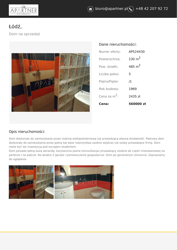 [email protected] +48 42 207 92 72 Łódź, Dom na sprzedaż Dane nieruchomości: Numer oferty: AP524430 Powierzchnia: 230 m Pow. działki: 485 m Liczba pokoi: 5 Piętro/Pięter /1 Rok budowy: 1969 2 2 2 Cena za m : 2435 zł Cena: 560000 zł Opis nieruchomości: Dom doskonały do zamieszkania przez rodzinę wielopokoleniową lub prowadzącą własną działalność. Piętrowy dom doskonały do zamieszkania przez jedną lub dwie rodziny(dwa osobne wejścia) lub osoby prowadzące firmę. Dom może być też inwestycją pod wynajem studentom. Dom posiada ładną dużą werandę, korytarz(na planie komunikacja) prowadzący osobno do części mieszkaniowej na parterze i na piętrze. Na działce 2 garaże i pomieszczenie gospodarcze. Dom po generalnym remoncie. Zapraszamy do oglądania [email protected] +48 42 207 92 72 [email protected] +48 42 207 92 72