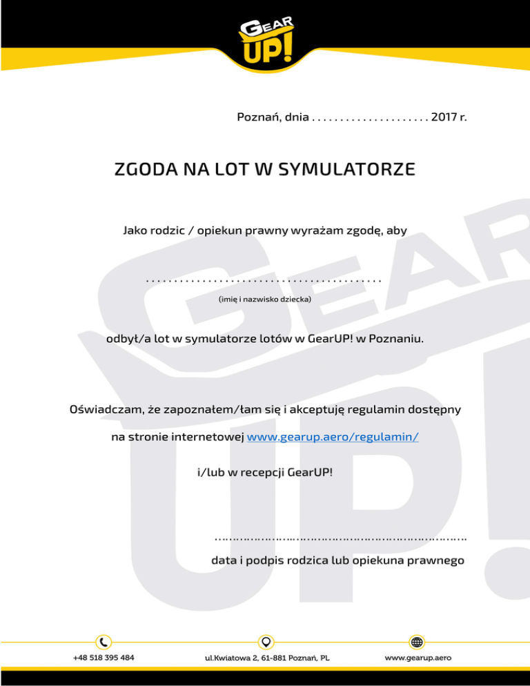 Poznań, dnia . . . . . . . . . . . . . . . . . . . . . 2017 r. ZGODA NA LOT W SYMULATORZE Jako rodzic / opiekun prawny wyrażam zgodę, aby .......................................... (imię i nazwisko dziecka) odbył/a lot w symulatorze lotów w GearUP! w Poznaniu. Oświadczam, że zapoznałem/łam się i akceptuję regulamin dostępny na stronie internetowej www.gearup.aero/regulamin/ i/lub w recepcji GearUP! ………………….…………………………………………. data i podpis rodzica lub opiekuna prawnego