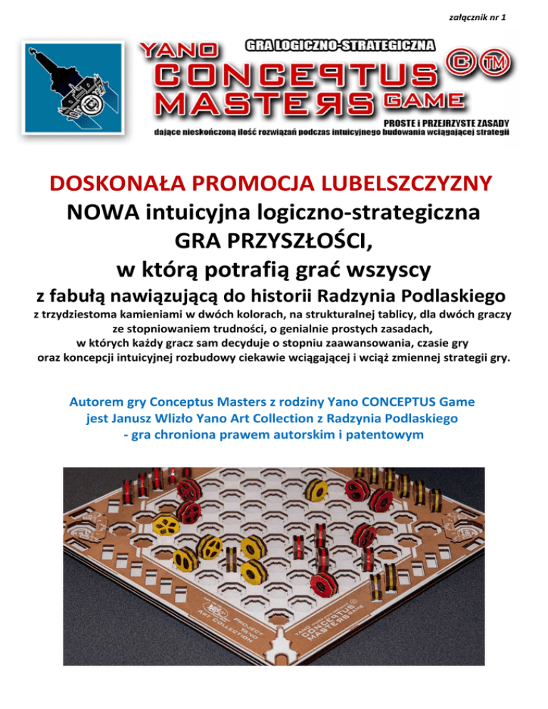 załącznik nr 1 DOSKONAŁA PROMOCJA LUBELSZCZYZNY NOWA intuicyjna logiczno-strategiczna GRA PRZYSZŁOŚCI, w którą potrafią grać wszyscy z fabułą nawiązującą do historii Radzynia Podlaskiego z trzydziestoma kamieniami w dwóch kolorach, na strukturalnej tablicy, dla dwóch graczy ze stopniowaniem trudności, o genialnie prostych zasadach, w których każdy gracz sam decyduje o stopniu zaawansowania, czasie gry oraz koncepcji intuicyjnej rozbudowy ciekawie wciągającej i wciąż zmiennej strategii gry. Autorem gry Conceptus Masters z rodziny Yano CONCEPTUS Game jest Janusz Wlizło Yano Art Collection z Radzynia Podlaskiego - gra chroniona prawem autorskim i patentowym NAJSILNIEJSZE ATUTY GRY CONCEPTUS MASTERS JAK SZACHY - ALE CAŁKOWICIE ODMIENNA Szachiści twierdzą, że Conceptus Masters jest bardzo podobny do szachów i jednocześnie całkowicie od nich odmienny. Widzą w grze olbrzymi potencjał zarówno w przestrzeni rozwijania logicznego myślenia jak i samej przyjemności z rozstrzygania ciekawych i nieskończenie różnych strategicznych zadań budowanych na prostych intuicyjnych zasadach. Wielu z nich latami zastanawiało się, czy powstanie coś takiego jak szachy i są mile zaskoczeni - Conceptus Masters nie tylko spełnia te oczekiwania, ale pozwala dużo szybciej niż w przypadku szachów, grać praktycznie od pierwszych partii na wyrównanym poziomie z doświadczonymi graczami, ponieważ to umysł i umiejętności logicznego myślenia są największym atutem w grze, a nie doświadczenie. Nie trzeba pamiętać trudnych ustawień początkowych ani tego jaka jest rola każdej z figur i jak poruszają się poszczególne figury - tu wszystko widać naocznie, a wszystkie figury poruszają się tak samo - o jedno pole. O zasięgu, kierunku i sile bicia przy każdym ruchu decyduje sam gracz ustawiając kamień w dowolnym z 4 ustawień co daje 8 kierunków. Mnogość możliwości ustalenia kierunku ruchu i bicia kamienia czyni grę na tyle nieprzewidywalną, że budowanie strategii staje się nie lada wyzwaniem, przy czym to gracze decydują sami jak sobie skomplikują wzajemnie strategię. NOWOCZESNA GRA PRZYSZŁOŚCI, której nie powstydziły by się starożytne cywilizacje Conceptus Masters łączy doznania z klasycznych gier logicznych, zaskakuje prostotą dającą pole do popisu umysłowi, dając jednocześnie świeże spojrzenie na gry logiczne. Bawi i edukuje jednocześnie, wciąż zaskakuje nieprzewidywalnością rozwiązań przeciwnika. Daje na prawdę dużo przyjemności i radości ze współzawodnictwa. Fabuła w swojej fantazji wskazuje genezę gry w starożytnych cywilizacjach - co nie było by niczym dziwnym, gdyby było prawdą. FAMILIJNY CHARAKTER GRY DLA KAŻDEGO BEZ WZGLĘDU NA WIEK I DOŚWIADCZENIE Bardzo proste zasady czynią grę familijną - z powodzeniem mogą w nią grać zarówno dzieci jak i dorośli, doświadczenie szachiści, pasjonaci gier logicznych i planszowych jak i całkowici laicy w tym temacie. Zasady poznaje się w kilka minut przy pierwszych ruchach. Drugą partię gra się już bez żadnych ograniczeń - swobodnie budując swoją wciągającą strategię. BARDZO WYSOKI WSPÓŁCZYNNIK ZADOWOLENIA Jak dotąd nie zdarzyło się jeszcze by ktokolwiek kto zagrał choć raz nie chciał tej gry kupić. Nawet obserwujący i czytający o niej zamawiają prototypową wersję limitowaną. Ci co mieli okazję zagrać i interesują się grami logicznymi, szachami lub planszówkami przychodzą wielokrotnie na kolejne warsztatowe spotkania z Conceptusem organizowane przez autora gry. Pomimo tego, że gra jeszcze nigdzie nie jest sprzedawana zyskuje sobie dużą popularność - czego dowodem jest zainteresowanie na prezentacjach, zaproszenia dla autora gry z różnych szkół jaki i na facebooku, gdzie zaledwie w 4 tygodnie strona o Conceptusie zyskała sobie prawie 2 i pół tysiąca znajomych i ponad 700 polubień przy promocji wyłącznie w gronie znajomych tylko jednego miasta Radzynia Podlaskiego. PRZESTRZENNOŚĆ GRY Conceptus Masters jest grą przestrzenną - trójwymiarową. Gra toczy się z kilku płaszczyznach wyobraźni. Daje to dodatkową przyjemność gimnastyki umysłu. ORGINALNOŚĆ i INNOWACYJNOŚĆ Conceptus Masters to oryginalna koncepcja. Począwszy od wyglądu, poprzez kształt figur, pomysł bardzo prostych zasad, po niespotykaną strategię daje jej walor trudno do jakiejkolwiek gry porównywalnej. ROZWIJA PROCESY MYŚLOWE, NIEPORUSZANE W INNYCH SYTUACJACH Przestrzenność gry, która prowadzi się w prosty sposób w kilku wymiarach powoduje, że poruszane są procesy myślowe nigdy nie używane w innych działaniach człowieka. Świetnie rozwija wyobraźnię przestrzenną i podzielność uwagi, koncentrację i szybkość reakcji w sytuacjach wymuszonych. GRA OTWARTA Szachy są uznawane za grę zamkniętą. Conceptus Masters ze względu na nieskończenie dużą ilość możliwych kombinacji jest grą otwartą, której poznanie przez umysł człowieka do końca jest wręcz niemożliwe. Dodatkowe wersje do pobrania ze strony internetowej rozbudowujące strategię lub wymagające od gracz jeszcze większej uwagi i gry na kilku poziomach jednocześnie powodują, że gra nigdy się nie znudzi, a z rosnącym doświadczeniem będzie się rozwijała razem z graczami na całym świecie w kolejnych jej odsłonach. GIMNASTYKA UMYSŁU I CIAŁA Przestrzenność gry i obserwacja wszystkich strategii budowanych przez przeciwnika oraz analiza sytuacji na planszy wymaga przechylania się i patrzenia na planszę pod różnych kątem. Powoduje to, że gra nie jest taka statyczna, a dodatkowo włącza do gimnastyki umysłu także pewną aktywność fizyczną i przez to jest mniej nużąca przy dłuższych partiach. NE MA PATÓW I NIE MA REMISÓW Silnym atutem gry Conceptus Masters jest fakt, że każda rozgrywana partia zawsze rozstrzyga się zwycięstwem jednego gracza - nie ma ani patów ani remisów, które są zmorą szachów. W Conceptusie bez