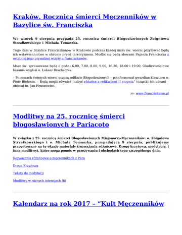 Kraków. Rocznica śmierci Męczenników w Bazylice św. Franciszka We wtorek 9 sierpnia przypada 25. rocznica śmierci Błogosławionych Zbigniewa Strzałkowskiego i Michała Tomaszka. Tego dnia w Bazylice Franciszkanów w Krakowie podczas każdej mszy św. wierni przyzywać będą ich wstawiennictwo w obronie przed terroryzmem. Modlić się będą słowami Papieża Franciszka z ostatniej jego prywatnej wizyty u franciszkanów. Msze św. sprawowane będą o godz.: 6.00, 7.00, 8.00, 9.00, 16.30, 18.00 i 19.00. Okolicznościowe kazania wygłosi o. Łukasz Brachaczek. – Po mszach świętych wierni uczczą relikwie Błogosławionych – poinformował gwardian klasztoru o. Piotr Bielenin. – Będą mogli również nabyć różańce z relikwiami II stopnia” (cząstki ich ubrań) – obiecał br. Jan Hruszowiec. za: www.franciszkanie.pl Modlitwy na 25. rocznicę śmierci błogosławionych z Pariacoto W związku z 25. rocznicą śmierci Błogosławionych Misjonarzy-Męczenników: o. Zbigniewa Strzałkowskiego i o. Michała Tomaszka, przypadającą 9 sierpnia, publikujemy przygotowane na tę okazję materiały (rozważania różańcowe, Drogę krzyżową, medytację, i inne modlitwy), które mogą pomóc w przeżywaniu i obchodach tego szczególnego dnia. Rozważania różańcowe o męczennikach z Peru Droga Krzyżowa Teksty do medytacji Modlitwy w różnych intencjach (6) Kalendarz na rok 2017 – “Kult Męczenników z Pariacoto” Dostępny jest już kalendarz na rok 2017 poświęcony beatyfikacji Męczenników z Pariacoto oraz innym wydarzeniom związanym z szerzeniem ich kultu. Rozmiar kalendarza – 210×145 mm, po rozłożeniu A4, z możliwością powieszenia na ścianie. Można go zamówić, pisząc na adres [email protected] Za każdą ofiarę złożoną dla naszych misji będziemy bardzo wdzięczni. Modlitwa papieża Franciszka o pokój i za ofiary terroryzmu: Wszechmogący i miłosierny Boże, Panie Wszechświata i ludzkich dziejów. Wszystko, co stworzyłeś jest dobre, a Twoje współczucie dla ludzkich błędów jest niewyczerpane. Do Ciebie przychodzimy dziś, prosząc, abyś zachował świat i jego mieszkańców w pokoju, oddalił od niego niszczącą falę terroryzmu, przywrócił przyjaźń i wlał w serca Twoich stworzeń dar ufności i gotowość do przebaczenia. Dawco życia, prosimy Cię również za wszystkich zmarłych, ofiary brutalnych ataków terrorystycznych. Obdarz ich wieczną nagrodą. Niech orędują za światem, szarpanym niepokojem i przeciwnościami. Jezu, Książę Pokoju, Przyjacielu ludzi, prosimy Cię za rannych w atakach terrorystycznych: dzieci i młodzież, kobiety i mężczyzn, osoby starsze, niewinnych i przypadkowych ludzi. Ulecz ich ciało i serce, i pocieszaj ich Twoją mocą, oddalając zarazem nienawiść i pragnienie zemsty. Duchu Święty Pocieszycielu, nawiedź cierpiące niewinnie rodziny ofiar przemocy i terroryzmu, okryj ich płaszczem Swojego boskiego miłosierdzia. Niech odnajdą w sobie siłę i odwagę, aby nadal być braćmi i siostrami dla innych, zwłaszcza przybyszów, dając swoim życiem świadectwo Twojej miłości. Porusz serca terrorystów, aby rozpoznali zło swoich czynów i powrócili na drogę pokoju i dobra, szacunku do życia i godności każdego człowieka, niezależnie od wyznania, pochodzenia czy stanu posiadania. Boże, Ojcze Odwieczny, wysłuchaj miłosiernie tej modlitwy, którą zanosimy do Ciebie spośród zgiełku i rozpaczy świata. Przepełnieni nadzieją w Twoje nieskończone Miłosierdzie, zawierzając się wstawiennictwu Najświętszej Matki, wzmocnieni przykładem błogosławionych męczenników z Peru, Zbigniewa i Michała, których uczyniłeś odważnymi świadkami Ewangelii aż do przelania krwi, zwracamy się do Ciebie z wielką ufnością o dar pokoju i oddalenie od nas plagi terroryzmu. Przez Chrystusa Pana naszego. Amen! fot. T. Warczak