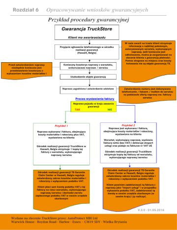 Rozdział 6 Opracowywanie wniosków gwarancyjnych Przykład procedury gwarancyjnej Gwarancja TruckStore Klient ma awarię pojazdu Przyjęcie zgłoszenia telefonicznego w ośrodku realizacji gwarancji (Hasselt, Belgia) Przed zatwierdzeniem naprawy niezbędnie konieczne jest przedstawienie kosztorysu z wykazaniem kosztów materiałów i robocizny Konieczny kosztorys naprawy z warsztatu, wykonującego naprawę / serwisu W razie awarii na trasie klient otrzymuje informację o najbliżej położonym, autoryzowanym serwisie, wykonującym naprawę. Jeśli konieczne jest odholowanie, można je zorganizować na zlecenie klienta z gwarancją płatności. Pomoc drogowa na miejscu oraz koszty holowania nie są objęte gwarancją TS. Uszkodzenie objęte gwarancją Naprawa uzgodniona i zatwierdzenie udzielone Proces wystawiania faktury Zatwierdzenie numeru jest dokonywane telefonicznie / faksem / mailem do serwisu na podstawie oferty naprawy ew. faktury serwisu Naprawa pojazdu w kraju zawarcia gwarancji TAK NIE Przykład 2 Przykład 1 Naprawa wykonana i faktura, obejmująca koszty materiałów i robocizny plus VAT, wystawiona na klienta Ośrodek realizacji gwarancji TruckStore w Hasselt, Belgia otrzymuje 1 kopię tej faktury z warsztatu, wykonującego naprawę/serwisu Ośrodek realizacji gwarancji TS Garantie Claim Center w Hasselt, Belgia reguluje zatwierdzony zakres kosztów materiałów i robocizny z wyłączeniem podatku VAT. Klient płaci sam kwotę podatku VAT z tej faktury na rzecz warsztatu, wykonującego naprawę/serwisu i dochodzi zwrotu zapłaconego podatku VAT w swoim urzędzie skarbowym Naprawa jest wykonana i faktura, obejmująca koszty materiałów i robocizny, wystawiona na klienta Warsztat, wykonujący naprawę, wystawia fakturę netto (bez VAT) i deklaruje eksport usługi oraz podaje na fakturze nr VAT UE Ośrodek realizacji gwarancji TruckStore otrzymuje kopię tej faktury od warsztatu, wykonującego naprawę/serwisu Ośrodek realizacji gwarancji TS Garantie Claim Center w Hasselt, Belgia reguluje zatwierdzony zakres kosztów materiałów i robocizny z wyłączeniem podatku VAT. Klient powinien zadeklarować tą fakturę z naprawy jako “import usługi” i w przypadku wykazania podatku VAT, zadeklarować tą kwotę w swoim urzędzie skarbowym (w swoim kraju) i ją rozliczyć. V.3.0 - 01.05.2016 -1- Wydane na zlecenie TruckStore przez: AutoProtect MBI Ltd Warwick House - Roydon Road - Harlow - Essex – CM19 5DY - Wielka Brytania Rozdział 6 Opracowywanie wniosków gwarancyjnych Wykonujący naprawą serwis powinien przestrzegaą poniąszych zasad: 1 Z działu dokumentacji gwarancji TruckStore naleąy uzyskaą numer gwarancji (kombinacja literowo-cyfrowa). Jeąli nie jest to moąliwe, poprosią klienta o przekazanie tego numeru. Bez tej informacji nie można wykonaż naprawy. 2 Upewnią sią, czy pojazd do tej pory był serwisowany zgodnie ze specyfikacjami producenta i czy tym samym spełnione są warunki roszczenia usług z tytułu gwarancji. Jedynym wystarczającym potwierdzeniem wykonanego przeglądu jest szczegółowa faktura z wykazanym podatkiem od towarów i usług (VAT) lub inny porównywalny dokument, zawierający datą wykonania przeglądu i stan licznika przebiegu. Bez tych danych wniosek gwarancyjny nie jest przyjmowany. 3 Naleąy ustalią dokładną przyczyną awarii, równieą w sytuacji, gdy klient wyraził zgodą na pokrycie wszystkich kosztów wykonującego naprawą serwisu, a wiąc równieą kosztów, które nie wchodzą w skład kosztów naprawy gwarancyjnej. W tym celu naleąy wykonaą odpowiednie do sytuacji demontaąe w pojeądzie i sporządzią listą potrzebnych cząąci, zawierającą koszty materiałowe i koszty robocizny, naliczone zgodnie z normatywnymi czasami napraw, ustalonymi przez producenta pojazdu. 4 W celu sprawdzenia waąnoąci gwarancji naleąy skontaktowaą sią z oąrodkiem realizacji gwarancji TruckStore pod nastąpującymi numerami/ adresami: Tel.: 0032 (0) 1130 2626 Faks: 0032 (0) 1130 1118 E-mail: [email protected] Naleąy przy tym podaą a) numer gwarancji (kombinacja literowo-cyfrowa) b) stwierdzony stan licznika przebiegu c) dane o dotychczasowym serwisowaniu, o ile są istotne d) szczegóły awarii, łącznie z przyczyną i opisem uszkodzeą e) koszty naprawy w rozbiciu na pozycje materiałowe i robocizną. Oąrodek realizacji gwarancji TruckStore zastrzega sobie prawo poddania pojazdu niezaleąnemu badaniu i na podstawie raportu z wynikami tego badania ustali kwotą naleąną za zaakceptowany wniosek gwarancyjny. Serwis zostanie powiadomiony, czy wniosek jest całkowicie lub cząąciowo uzasadniony i jednoczeąnie przekazany zostanie numer zatwierdzenia ustalonej kwoty. Ośrodek realizacji gwarancji TruckStore nie bśdzie akceptowaś wniosków gwarancyjnych bez numeru zatwierdzenia. Bez uzyskania tego numeru nie naleśy podejmowaś śadnych napraw. 5 Po uzyskaniu zatwierdzenia naprawy i wykonaniu naprawy w zakresie zgodnym z tym zatwierdzeniem naleąy wysłaą kopią faktury, obejmującą wszystkie zatwierdzone cząąci i koszty robocizny, razem z ewentualnie ąądanymi fakturami za poprzednie przeglądy na nastąpujący adres: TruckStore Warranty Claims Center c/o AutoProtect Kiewitstraat 194 B-3500 Hasselt Belgia Faks : 0032 (0) 11 30 11 18 Faktura serwisowa (oryginał) jest wystawiana na Beneficjenta Gwarancji, z adnotacją, ąe kwota netto faktury (autoryzowana wartoąą) zostanie uiszczona przez oąrodek realizacji gwarancji TruckStore c/o Fa. Autoprotect. Kwota podatku VAT musi byą uiszczona samodzielnie, bezpoąrednio przez Beneficjenta Gwarancji. V.3.0 - 01.05.2016 Wydane na zlecenie TruckStore przez: AutoProtect MBI Ltd Warwick House - Roydon Road - Harlow - Essex – CM19 5DY - Wielka Brytania Rozdział 6 Opracowywanie wniosków gwarancyjnych 6 Od właąciciela pojazdu naleąy ąądaą zapłaty wszystkich kosztów, wykraczających poza kwotą zatwierdzoną przez oąrodek realizacji gwarancji TruckStore . Przestrzeganie wy