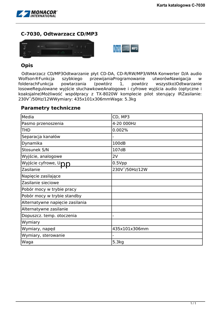 C-7030, Odtwarzacz CD/MP3 Opis Parametry techniczne