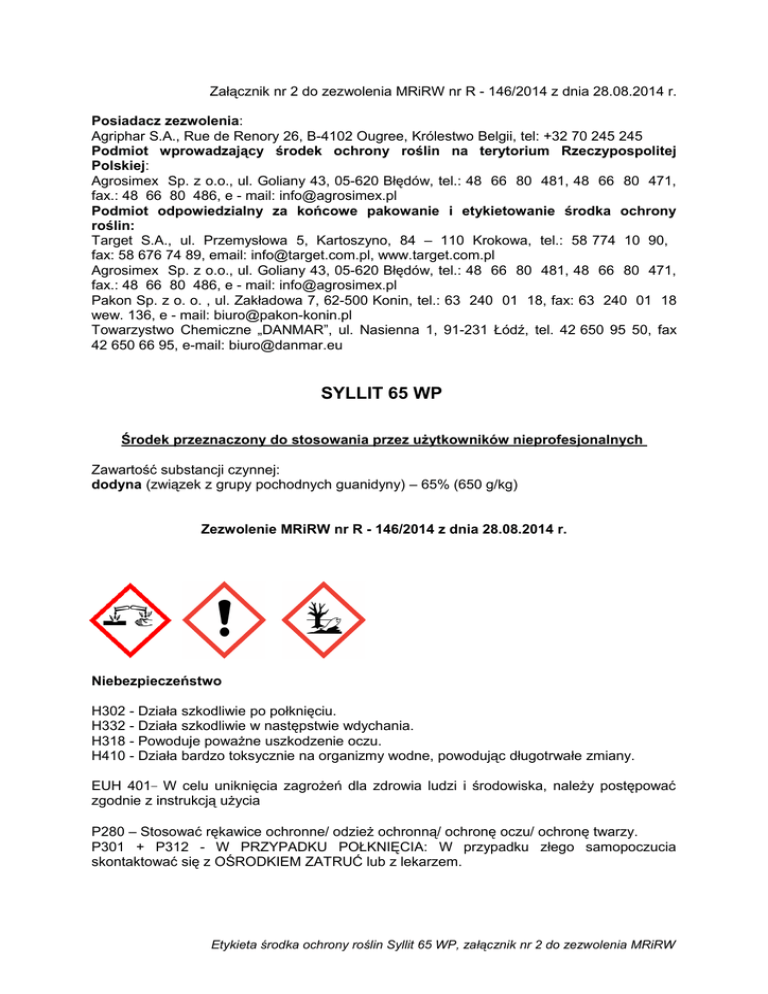 Załącznik nr 2 do zezwolenia MRiRW nr R - 146/2014 z dnia 28.08.2014 r. Posiadacz zezwolenia: Agriphar S.A., Rue de Renory 26, B-4102 Ougree, Królestwo Belgii, tel: +32 70 245 245 Podmiot wprowadzający środek ochrony roślin na terytorium Rzeczypospolitej Polskiej: Agrosimex Sp. z o.o., ul. Goliany 43, 05-620 Błędów, tel.: 48 66 80 481, 48 66 80 471, fax.: 48 66 80 486, e - mail: [email protected] Podmiot odpowiedzialny za końcowe pakowanie i etykietowanie środka ochrony roślin: Target S.A., ul. Przemysłowa 5, Kartoszyno, 84 – 110 Krokowa, tel.: 58 774 10 90, fax: 58 676 74 89, email: [email protected], www.target.com.pl Agrosimex Sp. z o.o., ul. Goliany 43, 05-620 Błędów, tel.: 48 66 80 481, 48 66 80 471, fax.: 48 66 80 486, e - mail: [email protected] Pakon Sp. z o. o. , ul. Zakładowa 7, 62-500 Konin, tel.: 63 240 01 18, fax: 63 240 01 18 wew. 136, e - mail: [email protected] Towarzystwo Chemiczne „DANMAR”, ul. Nasienna 1, 91-231 Łódź, tel. 42 650 95 50, fax 42 650 66 95, e-mail: [email protected] SYLLIT 65 WP Środek przeznaczony do stosowania przez użytkowników nieprofesjonalnych Zawartość substancji czynnej: dodyna (związek z grupy pochodnych guanidyny) – 65% (650 g/kg) Zezwolenie MRiRW nr R - 146/2014 z dnia 28.08.2014 r. Niebezpieczeństwo H302 - Działa szkodliwie po połknięciu. H332 - Działa szkodliwie w następstwie wdychania. H318 - Powoduje poważne uszkodzenie oczu. H410 - Działa bardzo toksycznie na organizmy wodne, powodując długotrwałe zmiany. EUH 401 W celu uniknięcia zagrożeń dla zdrowia ludzi i środowiska, należy postępować zgodnie z instrukcją użycia P280 – Stosować rękawice ochronne/ odzież ochronną/ ochronę oczu/ ochronę twarzy. P301 + P312 - W PRZYPADKU POŁKNIĘCIA: W przypadku złego samopoczucia skontaktować się z OŚRODKIEM ZATRUĆ lub z lekarzem. Etykieta środka ochrony roślin Syllit 65 WP, załącznik nr 2 do zezwolenia MRiRW P304 + P340 – W PRZYPADKU DOSTANIA SIĘ DO DRÓG ODDECHOWYCH: wyprowadzić lub wynieść na świeże powietrze i zapewnić warunki do odpoczynku w pozycji umożliwiającej swobodne oddychanie. P 305 + P 351 + P 338 - W PRZYPADKU DOSTANIA SIĘ DO OCZU: Ostrożnie płukać wodą przez kilka minut. Wyjąć soczewki kontaktowe, jeżeli są i można je łatwo usunąć. Nadal płukać. P391 - Zebrać wyciek. OPIS DZIAŁANIA Środek grzybobójczy w formie proszku do sporządzania zawiesiny wodnej o działaniu kontaktowym do stosowania zapobiegawczego, interwencyjnego w ochronie roślin sadowniczych przed chorobami grzybowymi. Środek przeznaczony do stosowania przy użyciu opryskiwaczy sadowniczych i ręcznych. STOSOWANIE ŚRODKA Jabłoń parch jabłoni Maksymalna dawka dla jednorazowego zastosowania: 10 g/100 m2 Zalecana dawka dla jednorazowego zastosowania: 10 g/100 m2 Termin stosowania: Zapobiegawczo: środek stosować od fazy pękania pąka (BBCH 01) do 60 dni przed zbiorem. Interwencyjnie: środek stosować do 24 godzin po infekcji w przypadku wysokiej temperatury i do 48 godzin w przypadku niskiej temperatury. W celu uniknięcia ordzawień na odmianach wrażliwych (np. Golden Delicious) nie stosować środka w trakcie kwitnienia i do dwóch tygodni po kwitnieniu. Zalecana ilość wody: 5 – 15 l/100 m2 Zalecane opryskiwanie: drobnokropliste Maksymalna liczba zabiegów w sezonie wegetacyjnym: 4 Odstęp pomiędzy zabiegami: 7-10 dni Grusza parch gruszy Maksymalna dawka dla jednorazowego zastosowania: 10 g/100 m2 Zalecana dawka dla jednorazowego zastosowania: 10 g/100 m2 Termin stosowania: Zapobiegawczo: środek stosować od fazy pękania pąka (BBCH 01) do 60 dni przed zbiorem. Interwencyjnie: środek stosować do 24 godzin po infekcji w przypadku wysokiej temperatury i do 48 godzin w przypadku niskiej temperatury. Zalecana ilość wody: 5 - 15 l/100 m2 Zalecane opryskiwanie: drobnokropliste Maksymalna liczba zabiegów w sezonie wegetacyjnym: 4 Odstęp pomiędzy zabiegami: 7-10 dni Wiśnia drobna plamistość liści. Maksymalna dawka dla jednorazowego zastosowania: 12 g/100 m2 Zalecana dawka dla jednorazowego zastosowania: 12 g/100 m2 Etykieta środka ochrony roślin Syllit 65 WP, załącznik nr 2 do zezwolenia MRiRW Termin stosowania: Środek stosować od fazy otwarcia pierwszych kwiatów (BBCH 60) do 2 tygodni przed zbiorem (BBCH 79) i po zbiorze. Maksymalna liczba zabiegów w sezonie wegetacyjnym: 4 Odstęp pomiędzy zabiegami: 7-10 dni Zalecana ilość wody: 5 - 15 l/100 m2 Zalecane opryskiwanie: drobnokropliste Brzoskwinia kędzierzawość liści brzoskwini. Maksymalna dawka dla jednorazowego zastosowania: 13 g/100 m2 Zalecana dawka dla jednorazowego zastosowania: 13 g/100 m2 Termin stosowania: Środek stosować nie później niż 75 dni przed zbiorem: od fazy pękania pąka (BBCH 01) do fazy opadnięcia płatków (BBCH69). Maksymalna liczba zabiegów w sezonie wegetacyjnym: 2 Odstęp pomiędzy zabiegami: 7 - 10 dni Zalecana ilość wody: 5 – 15 l/100 m2 Zalecane opryskiwanie: drobnokropliste SPORZĄDZANIE CIECZY UŻYTKOWEJ Przed przystąpieniem do sporządzania cieczy użytkowej dokładnie ustalić potrzebna jej ilość. Odmierzoną ilość środka wsypać do zbiornika opryskiwacza napełnionego częściowo wodą i uzupełnić wodą do potrzebnej ilości. Opryskiwać z włączonym mieszadłem. Po wsypaniu środka do zbiornika opryskiwacza niewyposażonego w mieszadło hydrauliczne ciecz w zbiorniku mechanicznie wymieszać. Opróżnione opakowania przepłukać trzykrotnie wodą, a popłuczyny wlać do zbiornika opryskiwacza z cieczą użytkową. Po pracy aparaturę dokładnie wymyć. POSTĘPOWANIE Z RESZTKAMI CIECZY UŻYTKOWEJ Z resztkami cieczy użytkowej po zabiegu należy postępować w sposób ograniczający ryzyko skażenia wód powierzchniowych i podziemnych, w rozumieniu przepisów Prawa wodnego oraz skażenia gruntu, tj.: – po uprzednim rozcieńczeniu zużyć na powierzchni, na której przeprowadzono zabieg, jeżeli jest to możliwe, lub, – unieszkodliwić z w