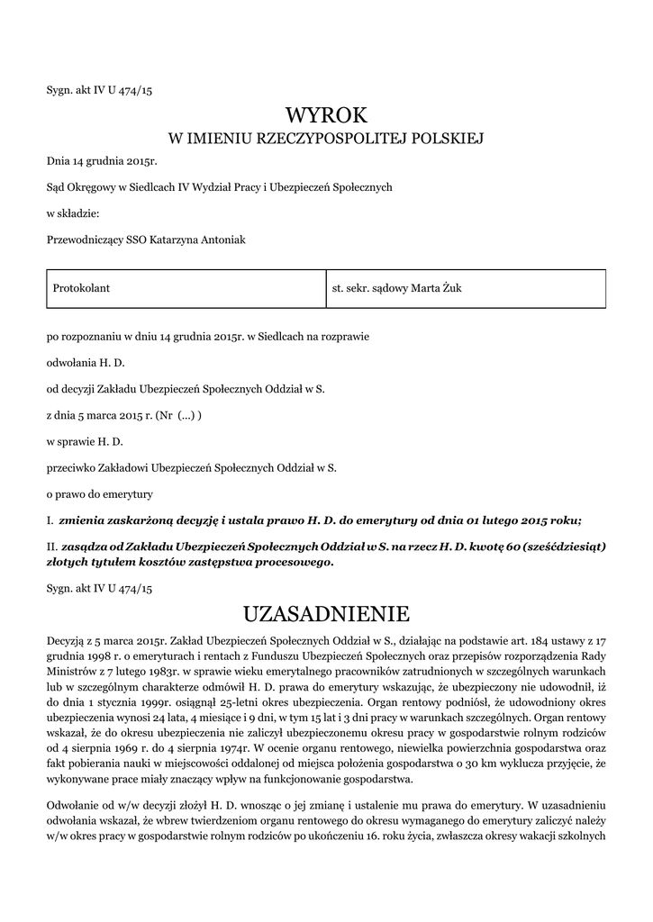 Sygn. akt IV U 474/15 WYROK W IMIENIU RZECZYPOSPOLITEJ POLSKIEJ Dnia 14 grudnia 2015r. Sąd Okręgowy w Siedlcach IV Wydział Pracy i Ubezpieczeń Społecznych w składzie: Przewodniczący SSO Katarzyna Antoniak Protokolant st. sekr. sądowy Marta Żuk po rozpoznaniu w dniu 14 grudnia 2015r. w Siedlcach na rozprawie odwołania H. D. od decyzji Zakładu Ubezpieczeń Społecznych Oddział w S. z dnia 5 marca 2015 r. (Nr (...) ) w sprawie H. D. przeciwko Zakładowi Ubezpieczeń Społecznych Oddział w S. o prawo do emerytury I. zmienia zaskarżoną decyzję i ustala prawo H. D. do emerytury od dnia 01 lutego 2015 roku; II. zasądza od Zakładu Ubezpieczeń Społecznych Oddział w S. na rzecz H. D. kwotę 60 (sześćdziesiąt) złotych tytułem kosztów zastępstwa procesowego. Sygn. akt IV U 474/15 UZASADNIENIE Decyzją z 5 marca 2015r. Zakład Ubezpieczeń Społecznych Oddział w S., działając na podstawie art. 184 ustawy z 17 grudnia 1998 r. o emeryturach i rentach z Funduszu Ubezpieczeń Społecznych oraz przepisów rozporządzenia Rady Ministrów z 7 lutego 1983r. w sprawie wieku emerytalnego pracowników zatrudnionych w szczególnych warunkach lub w szczególnym charakterze odmówił H. D. prawa do emerytury wskazując, że ubezpieczony nie udowodnił, iż do dnia 1 stycznia 1999r. osiągnął 25-letni okres ubezpieczenia. Organ rentowy podniósł, że udowodniony okres ubezpieczenia wynosi 24 lata, 4 miesiące i 9 dni, w tym 15 lat i 3 dni pracy w warunkach szczególnych. Organ rentowy wskazał, że do okresu ubezpieczenia nie zaliczył ubezpieczonemu okresu pracy w gospodarstwie rolnym rodziców od 4 sierpnia 1969 r. do 4 sierpnia 1974r. W ocenie organu rentowego, niewielka powierzchnia gospodarstwa oraz fakt pobierania nauki w miejscowości oddalonej od miejsca położenia gospodarstwa o 30 km wyklucza przyjęcie, że wykonywane prace miały znaczący wpływ na funkcjonowanie gospodarstwa. Odwołanie od w/w decyzji złożył H. D. wnosząc o jej zmianę i ustalenie mu prawa do emerytury. W uzasadnieniu odwołania wskazał, że wbrew twierdzeniom organu rentowego do okresu wymaganego do emerytury zaliczyć należy w/w okres pracy w gospodarstwie rolnym rodziców po ukończeniu 16. roku życia, zwłaszcza okresy wakacji szkolnych mając na uwadze, iż właśnie w tym okresie odbywają się najbardziej intensywne prace polowe (odwołanie k.1-2 akt sprawy ). W odpowiedzi na odwołanie organ rentowy wniósł o jego oddalenie powołując się na przepisy prawa i uzasadnienie zawarte w zaskarżonej decyzji (odpowiedź organu rentowego na odwołanie k.3-4 akt sprawy). Sąd ustalił, co następuje: Ubezpieczony H. D. w dniu 4 sierpnia 2013r. ukończył 60. rok życia. W dniu 16 lutego 2015r. wystąpił do Zakładu Ubezpieczeń Społecznych Oddział w S. z wnioskiem o ustalenie prawa do emerytury (wniosek z 16 lutego 2015r. k.1-4 akt emerytalnych). Na podstawie przedłożonych do wniosku dokumentów organ rentowy ustalił, że na dzień 1 stycznia 1999 r. ubezpieczony udowodnił staż ubezpieczeniowy w wymiarze 24 lata, 4 miesiące i 9 dni, z czego okresy składkowe stanowią 24 lata, 4 miesiące i 5 dni, a okresy nieskładkowe 4 dni. Ponadto organ rentowy ustalił, że do dnia 1 stycznia 1999r. ubezpieczony osiągnął staż pracy w szczególnych warunkach w wymiarze 15 lat i 3 dni. Z uwagi na brak wymaganego ustawą stażu ubezpieczenia decyzją z 5 marca 2015r. organ rentowy odmówił ubezpieczonemu przyznania emerytury (decyzja k.20 akt emerytalnych). Ubezpieczony urodził się w dniu (...) w S.. Rodzice ubezpieczonego S. i J. małż. D. od 1967r. byli posiadaczami, a od 4 listopada 1971r. właścicielami gospodarstwa rolnego położonego we wsi S. gmina G. o powierzchni 0,54 ha. Własność tego gospodarstwa nabyli w trybie tzw. ustawy uwłaszczeniowej z 26 października 1971r. o uregulowaniu własności gospodarstw rolnych (zaświadczenie Starostwa Powiatowego w G. z 11 grudnia 2014r. k.15 akt emerytalnych). Ubezpieczony od urodzenia mieszkał z rodzicami na terenie powyższego gospodarstwa (zaświadczenie o zameldowaniu k.13 akt emerytalnych). Po ukończeniu szkoły podstawowej, ubezpieczony kontynuował naukę w (...) Szkole Zawodowej w R.. Szkołę tę ukończył w dniu 23 czerwca 1971 r. (świadectwo ukończenia (...) Szkoły Zawodowej w R. k.7 akt emerytalnych). Następnie podjął naukę w Technikum Mechanicznym w R., które ukończył w dniu 29 kwietnia 1974r. (świadectwo ukończenia Technikum Mechanicznego w R. k.8 akt emerytalnych). Poczynając od ukończenia 16. roku życia, co nastąpiło w dniu 4 sierpnia 1969r., poprzez okres nauki w szkole zawodowej oraz w technikum ubezpieczony łączył naukę w szkole z pracą w gospodarstwie rolnym rodziców. Na posiadanych gruntach uprawiane było zboże, ziemniaki, truskawki oraz warzywa. W gospodarstwie rolnym hodowana była trzoda chlewna w ilości około 4-6 sztuk jednocześnie, oprócz tego 2-3 owce oraz około 15-20 sztuk drobiu. Odległość od gospodarstwa rolnego rodziców do szkoły ubezpieczonego wynosiła 34 km. Trasę tę ubezpieczony pokonywał autobusem. Przystanek autobusowy znajdował się w odległości 300 metrów od domu ubezpieczonego. Zajęcia w szkole odbywały się każdorazowo z rana. Ubezpieczony wychodził z domu o godzinie 6.50. Do domu wracał około godziny 14-15. Ojciec ubezpieczonego pracował początkowo jako piekarz, ale w trakcie zatrudnienia - kiedy ubezpieczony uczył się w szkole podstawowej - uległ wypadkowi i stał się osoba niepełnosprawną – leżącą z powodu paraliżu. Od tego czasu, pracę poza gospodarstwem rolnym rozpoczęła matka ubezpieczonego, która została zatrudniona jako pomoc w kuchni. W rozpatrywanym okresie (po ukończeniu przez ubezpieczonego 16. roku życia) w domu rodzinnym oprócz rodziców i ubezpieczonego mieszkał jego o 3 lata młodszy brat. Ubezpieczony ma jeszcze starszego o 5 lat brata, ale w rozpatrywanym okresie brat ten mieszkał i pracował w W.. W zwi